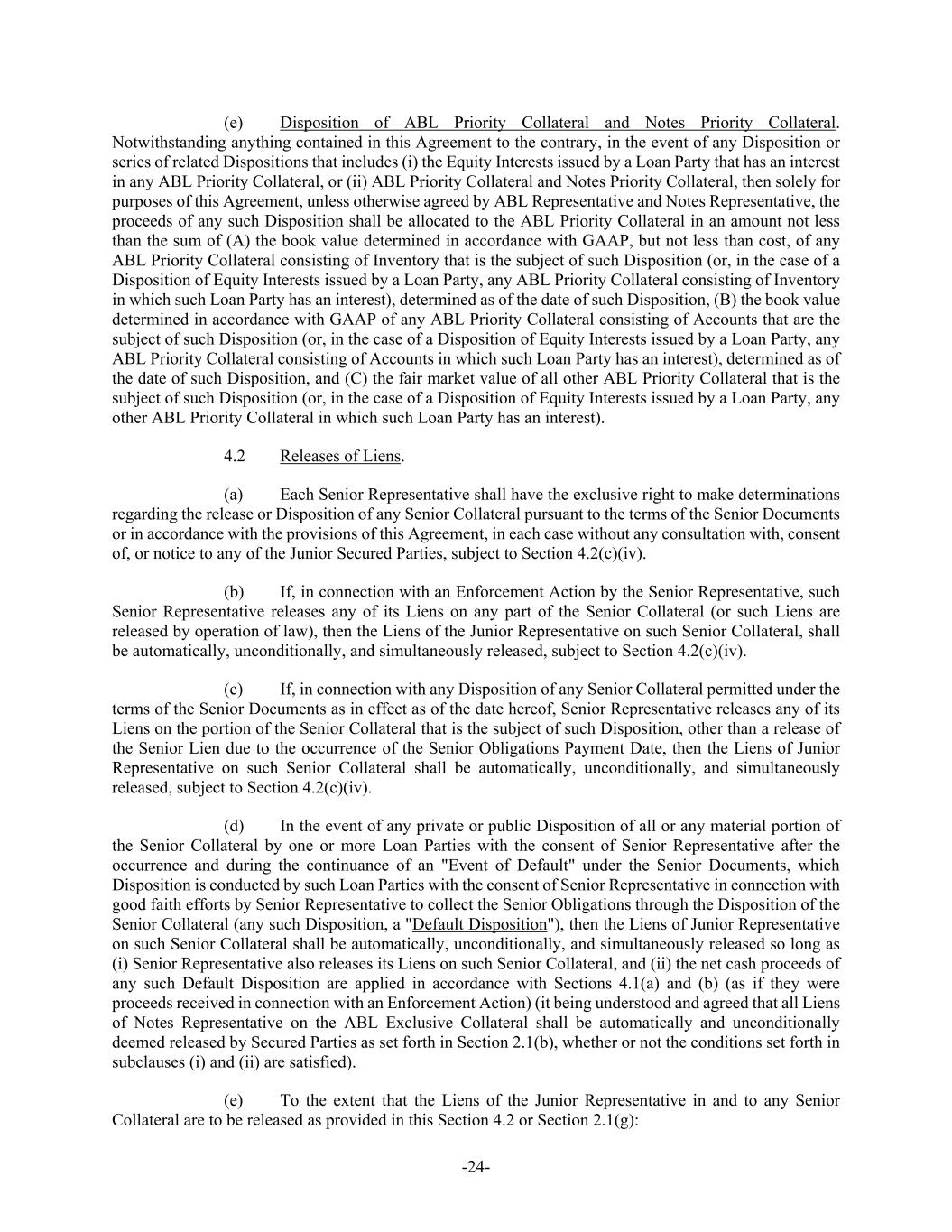 -24- (e) Disposition of ABL Priority Collateral and Notes Priority Collateral. Notwithstanding anything contained in this Agreement to the contrary, in the event of any Disposition or series of related Dispositions that includes (i) the Equity Interests issued by a Loan Party that has an interest in any ABL Priority Collateral, or (ii) ABL Priority Collateral and Notes Priority Collateral, then solely for purposes of this Agreement, unless otherwise agreed by ABL Representative and Notes Representative, the proceeds of any such Disposition shall be allocated to the ABL Priority Collateral in an amount not less than the sum of (A) the book value determined in accordance with GAAP, but not less than cost, of any ABL Priority Collateral consisting of Inventory that is the subject of such Disposition (or, in the case of a Disposition of Equity Interests issued by a Loan Party, any ABL Priority Collateral consisting of Inventory in which such Loan Party has an interest), determined as of the date of such Disposition, (B) the book value determined in accordance with GAAP of any ABL Priority Collateral consisting of Accounts that are the subject of such Disposition (or, in the case of a Disposition of Equity Interests issued by a Loan Party, any ABL Priority Collateral consisting of Accounts in which such Loan Party has an interest), determined as of the date of such Disposition, and (C) the fair market value of all other ABL Priority Collateral that is the subject of such Disposition (or, in the case of a Disposition of Equity Interests issued by a Loan Party, any other ABL Priority Collateral in which such Loan Party has an interest). 4.2 Releases of Liens. (a) Each Senior Representative shall have the exclusive right to make determinations regarding the release or Disposition of any Senior Collateral pursuant to the terms of the Senior Documents or in accordance with the provisions of this Agreement, in each case without any consultation with, consent of, or notice to any of the Junior Secured Parties, subject to Section 4.2(c)(iv). (b) If, in connection with an Enforcement Action by the Senior Representative, such Senior Representative releases any of its Liens on any part of the Senior Collateral (or such Liens are released by operation of law), then the Liens of the Junior Representative on such Senior Collateral, shall be automatically, unconditionally, and simultaneously released, subject to Section 4.2(c)(iv). (c) If, in connection with any Disposition of any Senior Collateral permitted under the terms of the Senior Documents as in effect as of the date hereof, Senior Representative releases any of its Liens on the portion of the Senior Collateral that is the subject of such Disposition, other than a release of the Senior Lien due to the occurrence of the Senior Obligations Payment Date, then the Liens of Junior Representative on such Senior Collateral shall be automatically, unconditionally, and simultaneously released, subject to Section 4.2(c)(iv). (d) In the event of any private or public Disposition of all or any material portion of the Senior Collateral by one or more Loan Parties with the consent of Senior Representative after the occurrence and during the continuance of an "Event of Default" under the Senior Documents, which Disposition is conducted by such Loan Parties with the consent of Senior Representative in connection with good faith efforts by Senior Representative to collect the Senior Obligations through the Disposition of the Senior Collateral (any such Disposition, a "Default Disposition"), then the Liens of Junior Representative on such Senior Collateral shall be automatically, unconditionally, and simultaneously released so long as (i) Senior Representative also releases its Liens on such Senior Collateral, and (ii) the net cash proceeds of any such Default Disposition are applied in accordance with Sections 4.1(a) and (b) (as if they were proceeds received in connection with an Enforcement Action) (it being understood and agreed that all Liens of Notes Representative on the ABL Exclusive Collateral shall be automatically and unconditionally deemed released by Secured Parties as set forth in Section 2.1(b), whether or not the conditions set forth in subclauses (i) and (ii) are satisfied). (e) To the extent that the Liens of the Junior Representative in and to any Senior Collateral are to be released as provided in this Section 4.2 or Section 2.1(g):