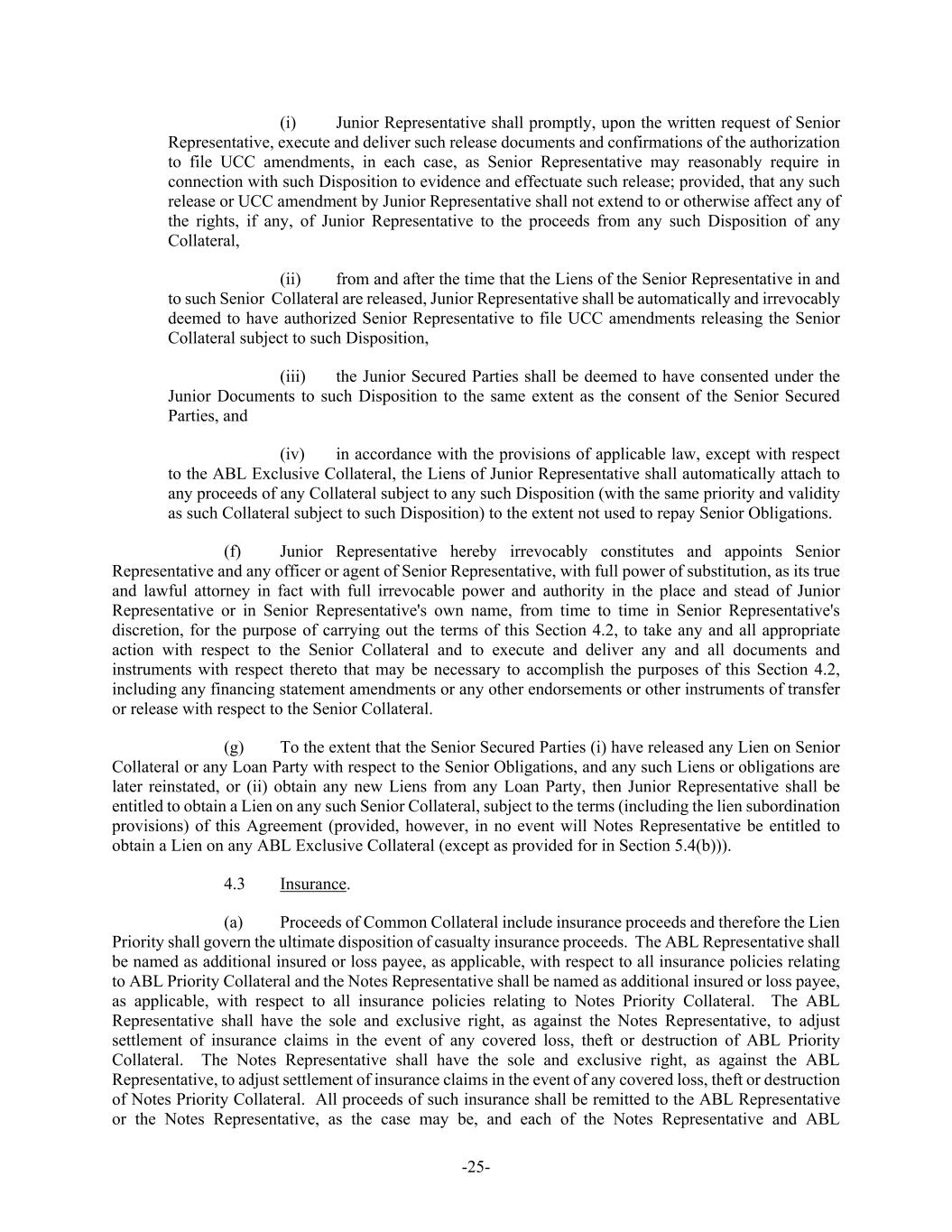 -25- (i) Junior Representative shall promptly, upon the written request of Senior Representative, execute and deliver such release documents and confirmations of the authorization to file UCC amendments, in each case, as Senior Representative may reasonably require in connection with such Disposition to evidence and effectuate such release; provided, that any such release or UCC amendment by Junior Representative shall not extend to or otherwise affect any of the rights, if any, of Junior Representative to the proceeds from any such Disposition of any Collateral, (ii) from and after the time that the Liens of the Senior Representative in and to such Senior Collateral are released, Junior Representative shall be automatically and irrevocably deemed to have authorized Senior Representative to file UCC amendments releasing the Senior Collateral subject to such Disposition, (iii) the Junior Secured Parties shall be deemed to have consented under the Junior Documents to such Disposition to the same extent as the consent of the Senior Secured Parties, and (iv) in accordance with the provisions of applicable law, except with respect to the ABL Exclusive Collateral, the Liens of Junior Representative shall automatically attach to any proceeds of any Collateral subject to any such Disposition (with the same priority and validity as such Collateral subject to such Disposition) to the extent not used to repay Senior Obligations. (f) Junior Representative hereby irrevocably constitutes and appoints Senior Representative and any officer or agent of Senior Representative, with full power of substitution, as its true and lawful attorney in fact with full irrevocable power and authority in the place and stead of Junior Representative or in Senior Representative's own name, from time to time in Senior Representative's discretion, for the purpose of carrying out the terms of this Section 4.2, to take any and all appropriate action with respect to the Senior Collateral and to execute and deliver any and all documents and instruments with respect thereto that may be necessary to accomplish the purposes of this Section 4.2, including any financing statement amendments or any other endorsements or other instruments of transfer or release with respect to the Senior Collateral. (g) To the extent that the Senior Secured Parties (i) have released any Lien on Senior Collateral or any Loan Party with respect to the Senior Obligations, and any such Liens or obligations are later reinstated, or (ii) obtain any new Liens from any Loan Party, then Junior Representative shall be entitled to obtain a Lien on any such Senior Collateral, subject to the terms (including the lien subordination provisions) of this Agreement (provided, however, in no event will Notes Representative be entitled to obtain a Lien on any ABL Exclusive Collateral (except as provided for in Section 5.4(b))). 4.3 Insurance. (a) Proceeds of Common Collateral include insurance proceeds and therefore the Lien Priority shall govern the ultimate disposition of casualty insurance proceeds. The ABL Representative shall be named as additional insured or loss payee, as applicable, with respect to all insurance policies relating to ABL Priority Collateral and the Notes Representative shall be named as additional insured or loss payee, as applicable, with respect to all insurance policies relating to Notes Priority Collateral. The ABL Representative shall have the sole and exclusive right, as against the Notes Representative, to adjust settlement of insurance claims in the event of any covered loss, theft or destruction of ABL Priority Collateral. The Notes Representative shall have the sole and exclusive right, as against the ABL Representative, to adjust settlement of insurance claims in the event of any covered loss, theft or destruction of Notes Priority Collateral. All proceeds of such insurance shall be remitted to the ABL Representative or the Notes Representative, as the case may be, and each of the Notes Representative and ABL