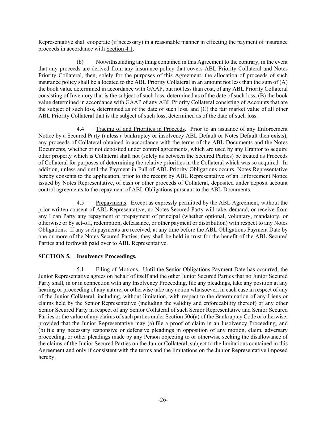 -26- Representative shall cooperate (if necessary) in a reasonable manner in effecting the payment of insurance proceeds in accordance with Section 4.1. (b) Notwithstanding anything contained in this Agreement to the contrary, in the event that any proceeds are derived from any insurance policy that covers ABL Priority Collateral and Notes Priority Collateral, then, solely for the purposes of this Agreement, the allocation of proceeds of such insurance policy shall be allocated to the ABL Priority Collateral in an amount not less than the sum of (A) the book value determined in accordance with GAAP, but not less than cost, of any ABL Priority Collateral consisting of Inventory that is the subject of such loss, determined as of the date of such loss, (B) the book value determined in accordance with GAAP of any ABL Priority Collateral consisting of Accounts that are the subject of such loss, determined as of the date of such loss, and (C) the fair market value of all other ABL Priority Collateral that is the subject of such loss, determined as of the date of such loss. 4.4 Tracing of and Priorities in Proceeds. Prior to an issuance of any Enforcement Notice by a Secured Party (unless a bankruptcy or insolvency ABL Default or Notes Default then exists), any proceeds of Collateral obtained in accordance with the terms of the ABL Documents and the Notes Documents, whether or not deposited under control agreements, which are used by any Grantor to acquire other property which is Collateral shall not (solely as between the Secured Parties) be treated as Proceeds of Collateral for purposes of determining the relative priorities in the Collateral which was so acquired. In addition, unless and until the Payment in Full of ABL Priority Obligations occurs, Notes Representative hereby consents to the application, prior to the receipt by ABL Representative of an Enforcement Notice issued by Notes Representative, of cash or other proceeds of Collateral, deposited under deposit account control agreements to the repayment of ABL Obligations pursuant to the ABL Documents. 4.5 Prepayments. Except as expressly permitted by the ABL Agreement, without the prior written consent of ABL Representative, no Notes Secured Party will take, demand, or receive from any Loan Party any repayment or prepayment of principal (whether optional, voluntary, mandatory, or otherwise or by set-off, redemption, defeasance, or other payment or distribution) with respect to any Notes Obligations. If any such payments are received, at any time before the ABL Obligations Payment Date by one or more of the Notes Secured Parties, they shall be held in trust for the benefit of the ABL Secured Parties and forthwith paid over to ABL Representative. SECTION 5. Insolvency Proceedings. 5.1 Filing of Motions. Until the Senior Obligations Payment Date has occurred, the Junior Representative agrees on behalf of itself and the other Junior Secured Parties that no Junior Secured Party shall, in or in connection with any Insolvency Proceeding, file any pleadings, take any position at any hearing or proceeding of any nature, or otherwise take any action whatsoever, in each case in respect of any of the Junior Collateral, including, without limitation, with respect to the determination of any Liens or claims held by the Senior Representative (including the validity and enforceability thereof) or any other Senior Secured Party in respect of any Senior Collateral of such Senior Representative and Senior Secured Parties or the value of any claims of such parties under Section 506(a) of the Bankruptcy Code or otherwise; provided that the Junior Representative may (a) file a proof of claim in an Insolvency Proceeding, and (b) file any necessary responsive or defensive pleadings in opposition of any motion, claim, adversary proceeding, or other pleadings made by any Person objecting to or otherwise seeking the disallowance of the claims of the Junior Secured Parties on the Junior Collateral, subject to the limitations contained in this Agreement and only if consistent with the terms and the limitations on the Junior Representative imposed hereby.