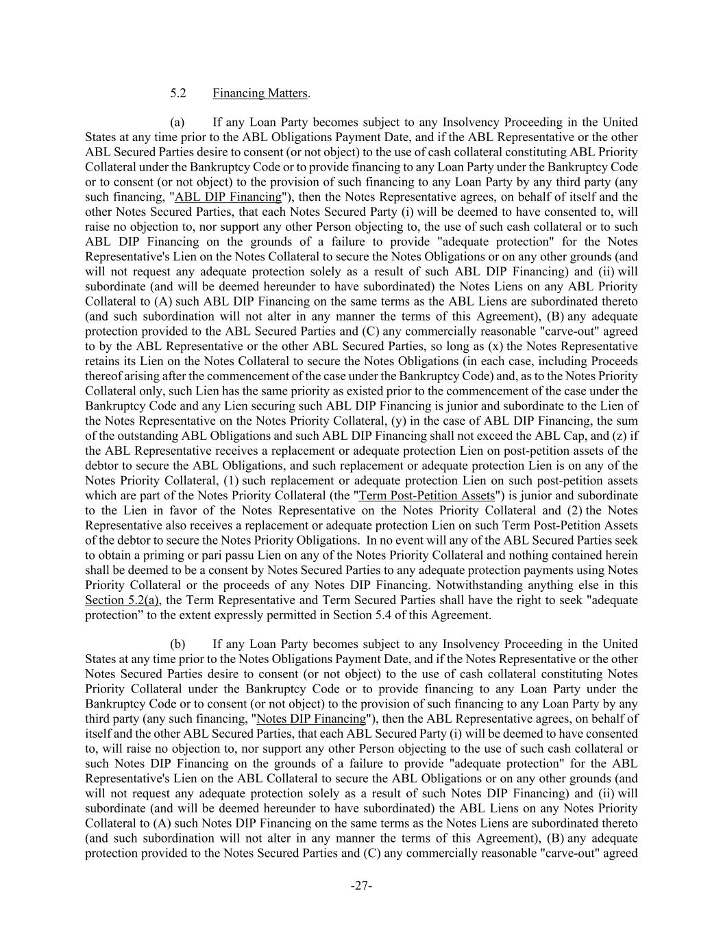 -27- 5.2 Financing Matters. (a) If any Loan Party becomes subject to any Insolvency Proceeding in the United States at any time prior to the ABL Obligations Payment Date, and if the ABL Representative or the other ABL Secured Parties desire to consent (or not object) to the use of cash collateral constituting ABL Priority Collateral under the Bankruptcy Code or to provide financing to any Loan Party under the Bankruptcy Code or to consent (or not object) to the provision of such financing to any Loan Party by any third party (any such financing, "ABL DIP Financing"), then the Notes Representative agrees, on behalf of itself and the other Notes Secured Parties, that each Notes Secured Party (i) will be deemed to have consented to, will raise no objection to, nor support any other Person objecting to, the use of such cash collateral or to such ABL DIP Financing on the grounds of a failure to provide "adequate protection" for the Notes Representative's Lien on the Notes Collateral to secure the Notes Obligations or on any other grounds (and will not request any adequate protection solely as a result of such ABL DIP Financing) and (ii) will subordinate (and will be deemed hereunder to have subordinated) the Notes Liens on any ABL Priority Collateral to (A) such ABL DIP Financing on the same terms as the ABL Liens are subordinated thereto (and such subordination will not alter in any manner the terms of this Agreement), (B) any adequate protection provided to the ABL Secured Parties and (C) any commercially reasonable "carve-out" agreed to by the ABL Representative or the other ABL Secured Parties, so long as (x) the Notes Representative retains its Lien on the Notes Collateral to secure the Notes Obligations (in each case, including Proceeds thereof arising after the commencement of the case under the Bankruptcy Code) and, as to the Notes Priority Collateral only, such Lien has the same priority as existed prior to the commencement of the case under the Bankruptcy Code and any Lien securing such ABL DIP Financing is junior and subordinate to the Lien of the Notes Representative on the Notes Priority Collateral, (y) in the case of ABL DIP Financing, the sum of the outstanding ABL Obligations and such ABL DIP Financing shall not exceed the ABL Cap, and (z) if the ABL Representative receives a replacement or adequate protection Lien on post-petition assets of the debtor to secure the ABL Obligations, and such replacement or adequate protection Lien is on any of the Notes Priority Collateral, (1) such replacement or adequate protection Lien on such post-petition assets which are part of the Notes Priority Collateral (the "Term Post-Petition Assets") is junior and subordinate to the Lien in favor of the Notes Representative on the Notes Priority Collateral and (2) the Notes Representative also receives a replacement or adequate protection Lien on such Term Post-Petition Assets of the debtor to secure the Notes Priority Obligations. In no event will any of the ABL Secured Parties seek to obtain a priming or pari passu Lien on any of the Notes Priority Collateral and nothing contained herein shall be deemed to be a consent by Notes Secured Parties to any adequate protection payments using Notes Priority Collateral or the proceeds of any Notes DIP Financing. Notwithstanding anything else in this Section 5.2(a), the Term Representative and Term Secured Parties shall have the right to seek "adequate protection” to the extent expressly permitted in Section 5.4 of this Agreement. (b) If any Loan Party becomes subject to any Insolvency Proceeding in the United States at any time prior to the Notes Obligations Payment Date, and if the Notes Representative or the other Notes Secured Parties desire to consent (or not object) to the use of cash collateral constituting Notes Priority Collateral under the Bankruptcy Code or to provide financing to any Loan Party under the Bankruptcy Code or to consent (or not object) to the provision of such financing to any Loan Party by any third party (any such financing, "Notes DIP Financing"), then the ABL Representative agrees, on behalf of itself and the other ABL Secured Parties, that each ABL Secured Party (i) will be deemed to have consented to, will raise no objection to, nor support any other Person objecting to the use of such cash collateral or such Notes DIP Financing on the grounds of a failure to provide "adequate protection" for the ABL Representative's Lien on the ABL Collateral to secure the ABL Obligations or on any other grounds (and will not request any adequate protection solely as a result of such Notes DIP Financing) and (ii) will subordinate (and will be deemed hereunder to have subordinated) the ABL Liens on any Notes Priority Collateral to (A) such Notes DIP Financing on the same terms as the Notes Liens are subordinated thereto (and such subordination will not alter in any manner the terms of this Agreement), (B) any adequate protection provided to the Notes Secured Parties and (C) any commercially reasonable "carve-out" agreed