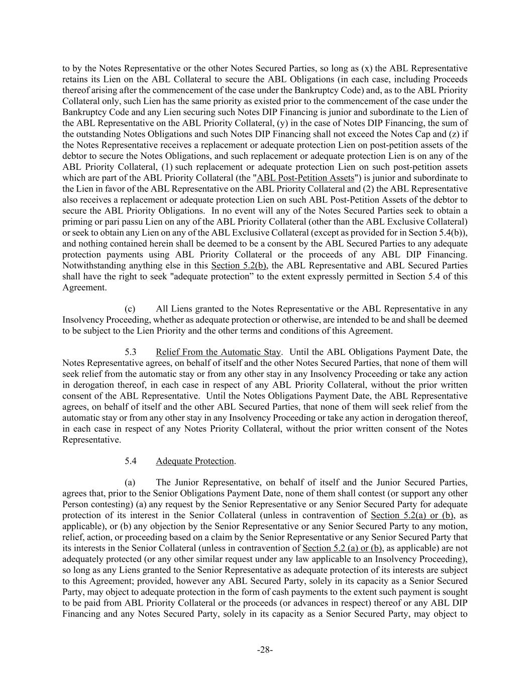-28- to by the Notes Representative or the other Notes Secured Parties, so long as (x) the ABL Representative retains its Lien on the ABL Collateral to secure the ABL Obligations (in each case, including Proceeds thereof arising after the commencement of the case under the Bankruptcy Code) and, as to the ABL Priority Collateral only, such Lien has the same priority as existed prior to the commencement of the case under the Bankruptcy Code and any Lien securing such Notes DIP Financing is junior and subordinate to the Lien of the ABL Representative on the ABL Priority Collateral, (y) in the case of Notes DIP Financing, the sum of the outstanding Notes Obligations and such Notes DIP Financing shall not exceed the Notes Cap and (z) if the Notes Representative receives a replacement or adequate protection Lien on post-petition assets of the debtor to secure the Notes Obligations, and such replacement or adequate protection Lien is on any of the ABL Priority Collateral, (1) such replacement or adequate protection Lien on such post-petition assets which are part of the ABL Priority Collateral (the "ABL Post-Petition Assets") is junior and subordinate to the Lien in favor of the ABL Representative on the ABL Priority Collateral and (2) the ABL Representative also receives a replacement or adequate protection Lien on such ABL Post-Petition Assets of the debtor to secure the ABL Priority Obligations. In no event will any of the Notes Secured Parties seek to obtain a priming or pari passu Lien on any of the ABL Priority Collateral (other than the ABL Exclusive Collateral) or seek to obtain any Lien on any of the ABL Exclusive Collateral (except as provided for in Section 5.4(b)), and nothing contained herein shall be deemed to be a consent by the ABL Secured Parties to any adequate protection payments using ABL Priority Collateral or the proceeds of any ABL DIP Financing. Notwithstanding anything else in this Section 5.2(b), the ABL Representative and ABL Secured Parties shall have the right to seek "adequate protection” to the extent expressly permitted in Section 5.4 of this Agreement. (c) All Liens granted to the Notes Representative or the ABL Representative in any Insolvency Proceeding, whether as adequate protection or otherwise, are intended to be and shall be deemed to be subject to the Lien Priority and the other terms and conditions of this Agreement. 5.3 Relief From the Automatic Stay. Until the ABL Obligations Payment Date, the Notes Representative agrees, on behalf of itself and the other Notes Secured Parties, that none of them will seek relief from the automatic stay or from any other stay in any Insolvency Proceeding or take any action in derogation thereof, in each case in respect of any ABL Priority Collateral, without the prior written consent of the ABL Representative. Until the Notes Obligations Payment Date, the ABL Representative agrees, on behalf of itself and the other ABL Secured Parties, that none of them will seek relief from the automatic stay or from any other stay in any Insolvency Proceeding or take any action in derogation thereof, in each case in respect of any Notes Priority Collateral, without the prior written consent of the Notes Representative. 5.4 Adequate Protection. (a) The Junior Representative, on behalf of itself and the Junior Secured Parties, agrees that, prior to the Senior Obligations Payment Date, none of them shall contest (or support any other Person contesting) (a) any request by the Senior Representative or any Senior Secured Party for adequate protection of its interest in the Senior Collateral (unless in contravention of Section 5.2(a) or (b), as applicable), or (b) any objection by the Senior Representative or any Senior Secured Party to any motion, relief, action, or proceeding based on a claim by the Senior Representative or any Senior Secured Party that its interests in the Senior Collateral (unless in contravention of Section 5.2 (a) or (b), as applicable) are not adequately protected (or any other similar request under any law applicable to an Insolvency Proceeding), so long as any Liens granted to the Senior Representative as adequate protection of its interests are subject to this Agreement; provided, however any ABL Secured Party, solely in its capacity as a Senior Secured Party, may object to adequate protection in the form of cash payments to the extent such payment is sought to be paid from ABL Priority Collateral or the proceeds (or advances in respect) thereof or any ABL DIP Financing and any Notes Secured Party, solely in its capacity as a Senior Secured Party, may object to