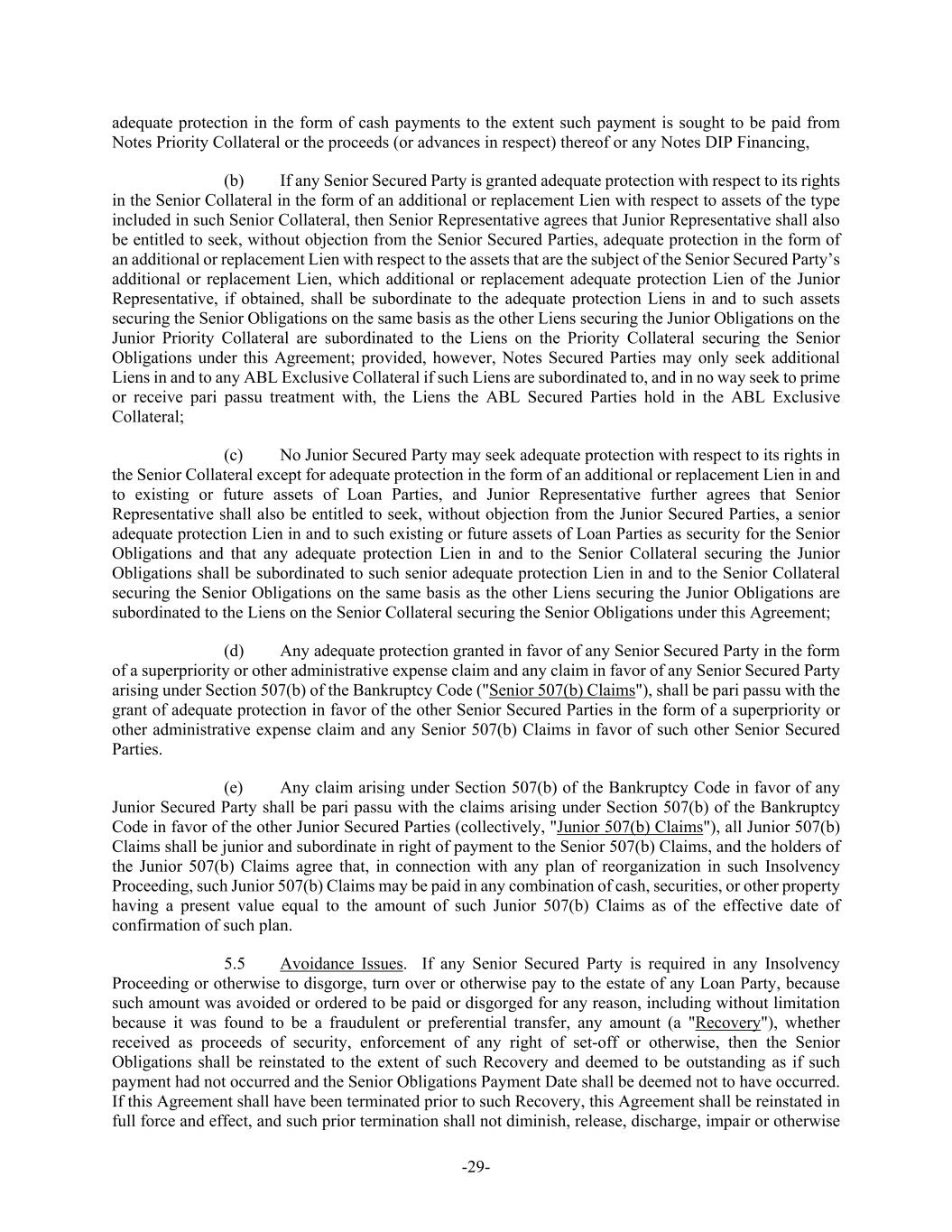 -29- adequate protection in the form of cash payments to the extent such payment is sought to be paid from Notes Priority Collateral or the proceeds (or advances in respect) thereof or any Notes DIP Financing, (b) If any Senior Secured Party is granted adequate protection with respect to its rights in the Senior Collateral in the form of an additional or replacement Lien with respect to assets of the type included in such Senior Collateral, then Senior Representative agrees that Junior Representative shall also be entitled to seek, without objection from the Senior Secured Parties, adequate protection in the form of an additional or replacement Lien with respect to the assets that are the subject of the Senior Secured Party’s additional or replacement Lien, which additional or replacement adequate protection Lien of the Junior Representative, if obtained, shall be subordinate to the adequate protection Liens in and to such assets securing the Senior Obligations on the same basis as the other Liens securing the Junior Obligations on the Junior Priority Collateral are subordinated to the Liens on the Priority Collateral securing the Senior Obligations under this Agreement; provided, however, Notes Secured Parties may only seek additional Liens in and to any ABL Exclusive Collateral if such Liens are subordinated to, and in no way seek to prime or receive pari passu treatment with, the Liens the ABL Secured Parties hold in the ABL Exclusive Collateral; (c) No Junior Secured Party may seek adequate protection with respect to its rights in the Senior Collateral except for adequate protection in the form of an additional or replacement Lien in and to existing or future assets of Loan Parties, and Junior Representative further agrees that Senior Representative shall also be entitled to seek, without objection from the Junior Secured Parties, a senior adequate protection Lien in and to such existing or future assets of Loan Parties as security for the Senior Obligations and that any adequate protection Lien in and to the Senior Collateral securing the Junior Obligations shall be subordinated to such senior adequate protection Lien in and to the Senior Collateral securing the Senior Obligations on the same basis as the other Liens securing the Junior Obligations are subordinated to the Liens on the Senior Collateral securing the Senior Obligations under this Agreement; (d) Any adequate protection granted in favor of any Senior Secured Party in the form of a superpriority or other administrative expense claim and any claim in favor of any Senior Secured Party arising under Section 507(b) of the Bankruptcy Code ("Senior 507(b) Claims"), shall be pari passu with the grant of adequate protection in favor of the other Senior Secured Parties in the form of a superpriority or other administrative expense claim and any Senior 507(b) Claims in favor of such other Senior Secured Parties. (e) Any claim arising under Section 507(b) of the Bankruptcy Code in favor of any Junior Secured Party shall be pari passu with the claims arising under Section 507(b) of the Bankruptcy Code in favor of the other Junior Secured Parties (collectively, "Junior 507(b) Claims"), all Junior 507(b) Claims shall be junior and subordinate in right of payment to the Senior 507(b) Claims, and the holders of the Junior 507(b) Claims agree that, in connection with any plan of reorganization in such Insolvency Proceeding, such Junior 507(b) Claims may be paid in any combination of cash, securities, or other property having a present value equal to the amount of such Junior 507(b) Claims as of the effective date of confirmation of such plan. 5.5 Avoidance Issues. If any Senior Secured Party is required in any Insolvency Proceeding or otherwise to disgorge, turn over or otherwise pay to the estate of any Loan Party, because such amount was avoided or ordered to be paid or disgorged for any reason, including without limitation because it was found to be a fraudulent or preferential transfer, any amount (a "Recovery"), whether received as proceeds of security, enforcement of any right of set-off or otherwise, then the Senior Obligations shall be reinstated to the extent of such Recovery and deemed to be outstanding as if such payment had not occurred and the Senior Obligations Payment Date shall be deemed not to have occurred. If this Agreement shall have been terminated prior to such Recovery, this Agreement shall be reinstated in full force and effect, and such prior termination shall not diminish, release, discharge, impair or otherwise