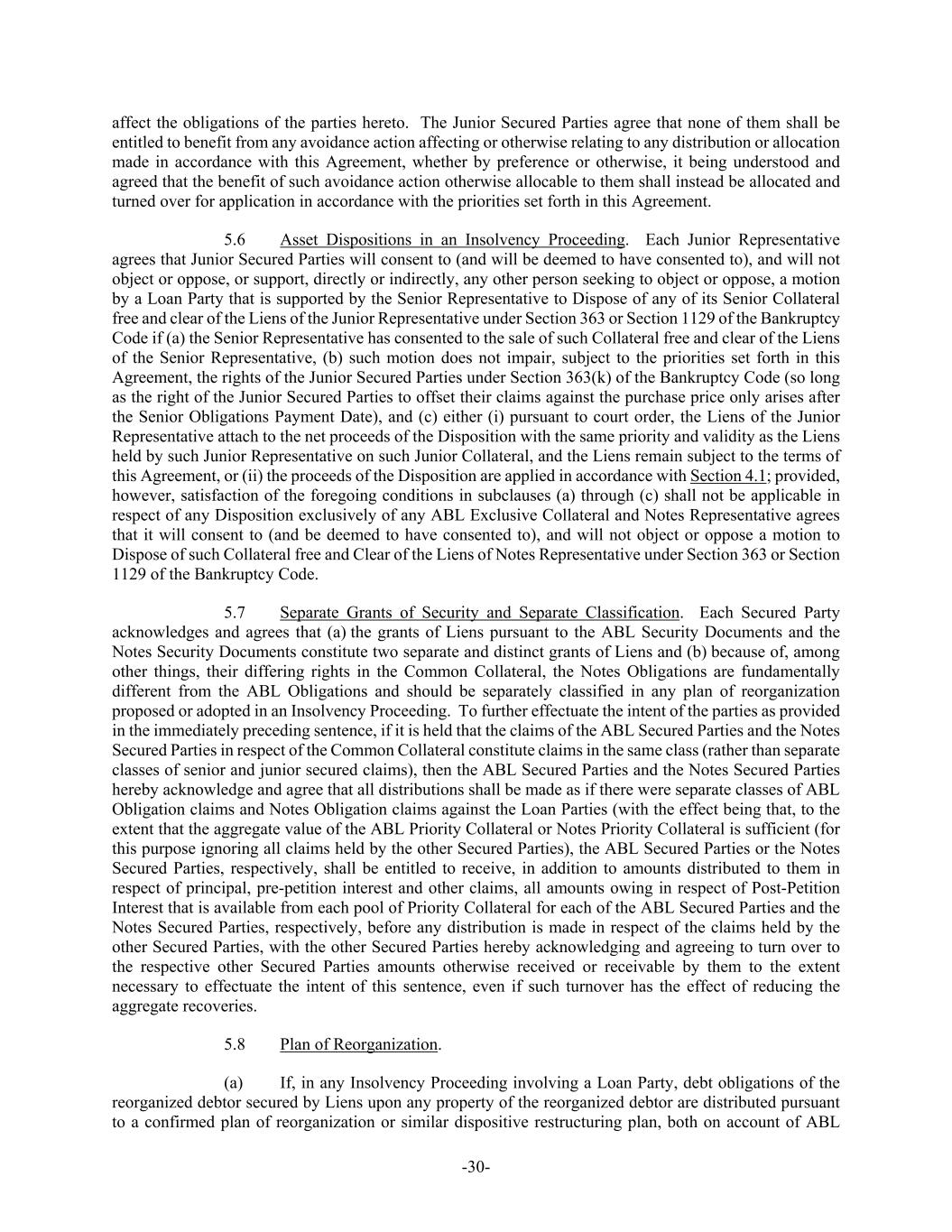 -30- affect the obligations of the parties hereto. The Junior Secured Parties agree that none of them shall be entitled to benefit from any avoidance action affecting or otherwise relating to any distribution or allocation made in accordance with this Agreement, whether by preference or otherwise, it being understood and agreed that the benefit of such avoidance action otherwise allocable to them shall instead be allocated and turned over for application in accordance with the priorities set forth in this Agreement. 5.6 Asset Dispositions in an Insolvency Proceeding. Each Junior Representative agrees that Junior Secured Parties will consent to (and will be deemed to have consented to), and will not object or oppose, or support, directly or indirectly, any other person seeking to object or oppose, a motion by a Loan Party that is supported by the Senior Representative to Dispose of any of its Senior Collateral free and clear of the Liens of the Junior Representative under Section 363 or Section 1129 of the Bankruptcy Code if (a) the Senior Representative has consented to the sale of such Collateral free and clear of the Liens of the Senior Representative, (b) such motion does not impair, subject to the priorities set forth in this Agreement, the rights of the Junior Secured Parties under Section 363(k) of the Bankruptcy Code (so long as the right of the Junior Secured Parties to offset their claims against the purchase price only arises after the Senior Obligations Payment Date), and (c) either (i) pursuant to court order, the Liens of the Junior Representative attach to the net proceeds of the Disposition with the same priority and validity as the Liens held by such Junior Representative on such Junior Collateral, and the Liens remain subject to the terms of this Agreement, or (ii) the proceeds of the Disposition are applied in accordance with Section 4.1; provided, however, satisfaction of the foregoing conditions in subclauses (a) through (c) shall not be applicable in respect of any Disposition exclusively of any ABL Exclusive Collateral and Notes Representative agrees that it will consent to (and be deemed to have consented to), and will not object or oppose a motion to Dispose of such Collateral free and Clear of the Liens of Notes Representative under Section 363 or Section 1129 of the Bankruptcy Code. 5.7 Separate Grants of Security and Separate Classification. Each Secured Party acknowledges and agrees that (a) the grants of Liens pursuant to the ABL Security Documents and the Notes Security Documents constitute two separate and distinct grants of Liens and (b) because of, among other things, their differing rights in the Common Collateral, the Notes Obligations are fundamentally different from the ABL Obligations and should be separately classified in any plan of reorganization proposed or adopted in an Insolvency Proceeding. To further effectuate the intent of the parties as provided in the immediately preceding sentence, if it is held that the claims of the ABL Secured Parties and the Notes Secured Parties in respect of the Common Collateral constitute claims in the same class (rather than separate classes of senior and junior secured claims), then the ABL Secured Parties and the Notes Secured Parties hereby acknowledge and agree that all distributions shall be made as if there were separate classes of ABL Obligation claims and Notes Obligation claims against the Loan Parties (with the effect being that, to the extent that the aggregate value of the ABL Priority Collateral or Notes Priority Collateral is sufficient (for this purpose ignoring all claims held by the other Secured Parties), the ABL Secured Parties or the Notes Secured Parties, respectively, shall be entitled to receive, in addition to amounts distributed to them in respect of principal, pre-petition interest and other claims, all amounts owing in respect of Post-Petition Interest that is available from each pool of Priority Collateral for each of the ABL Secured Parties and the Notes Secured Parties, respectively, before any distribution is made in respect of the claims held by the other Secured Parties, with the other Secured Parties hereby acknowledging and agreeing to turn over to the respective other Secured Parties amounts otherwise received or receivable by them to the extent necessary to effectuate the intent of this sentence, even if such turnover has the effect of reducing the aggregate recoveries. 5.8 Plan of Reorganization. (a) If, in any Insolvency Proceeding involving a Loan Party, debt obligations of the reorganized debtor secured by Liens upon any property of the reorganized debtor are distributed pursuant to a confirmed plan of reorganization or similar dispositive restructuring plan, both on account of ABL