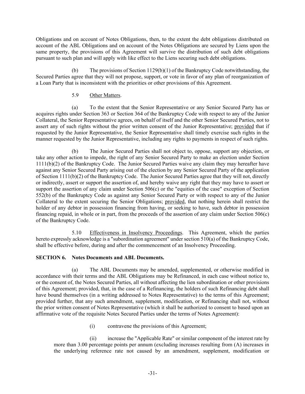 -31- Obligations and on account of Notes Obligations, then, to the extent the debt obligations distributed on account of the ABL Obligations and on account of the Notes Obligations are secured by Liens upon the same property, the provisions of this Agreement will survive the distribution of such debt obligations pursuant to such plan and will apply with like effect to the Liens securing such debt obligations. (b) The provisions of Section 1129(b)(1) of the Bankruptcy Code notwithstanding, the Secured Parties agree that they will not propose, support, or vote in favor of any plan of reorganization of a Loan Party that is inconsistent with the priorities or other provisions of this Agreement. 5.9 Other Matters. (a) To the extent that the Senior Representative or any Senior Secured Party has or acquires rights under Section 363 or Section 364 of the Bankruptcy Code with respect to any of the Junior Collateral, the Senior Representative agrees, on behalf of itself and the other Senior Secured Parties, not to assert any of such rights without the prior written consent of the Junior Representative; provided that if requested by the Junior Representative, the Senior Representative shall timely exercise such rights in the manner requested by the Junior Representative, including any rights to payments in respect of such rights. (b) The Junior Secured Parties shall not object to, oppose, support any objection, or take any other action to impede, the right of any Senior Secured Party to make an election under Section 1111(b)(2) of the Bankruptcy Code. The Junior Secured Parties waive any claim they may hereafter have against any Senior Secured Party arising out of the election by any Senior Secured Party of the application of Section 1111(b)(2) of the Bankruptcy Code. The Junior Secured Parties agree that they will not, directly or indirectly, assert or support the assertion of, and hereby waive any right that they may have to assert or support the assertion of any claim under Section 506(c) or the "equities of the case" exception of Section 552(b) of the Bankruptcy Code as against any Senior Secured Party or with respect to any of the Junior Collateral to the extent securing the Senior Obligations; provided, that nothing herein shall restrict the holder of any debtor in possession financing from having, or seeking to have, such debtor in possession financing repaid, in whole or in part, from the proceeds of the assertion of any claim under Section 506(c) of the Bankruptcy Code. 5.10 Effectiveness in Insolvency Proceedings. This Agreement, which the parties hereto expressly acknowledge is a "subordination agreement" under section 510(a) of the Bankruptcy Code, shall be effective before, during and after the commencement of an Insolvency Proceeding. SECTION 6. Notes Documents and ABL Documents. (a) The ABL Documents may be amended, supplemented, or otherwise modified in accordance with their terms and the ABL Obligations may be Refinanced, in each case without notice to, or the consent of, the Notes Secured Parties, all without affecting the lien subordination or other provisions of this Agreement; provided, that, in the case of a Refinancing, the holders of such Refinancing debt shall have bound themselves (in a writing addressed to Notes Representative) to the terms of this Agreement; provided further, that any such amendment, supplement, modification, or Refinancing shall not, without the prior written consent of Notes Representative (which it shall be authorized to consent to based upon an affirmative vote of the requisite Notes Secured Parties under the terms of Notes Agreement): (i) contravene the provisions of this Agreement; (ii) increase the "Applicable Rate" or similar component of the interest rate by more than 3.00 percentage points per annum (excluding increases resulting from (A) increases in the underlying reference rate not caused by an amendment, supplement, modification or