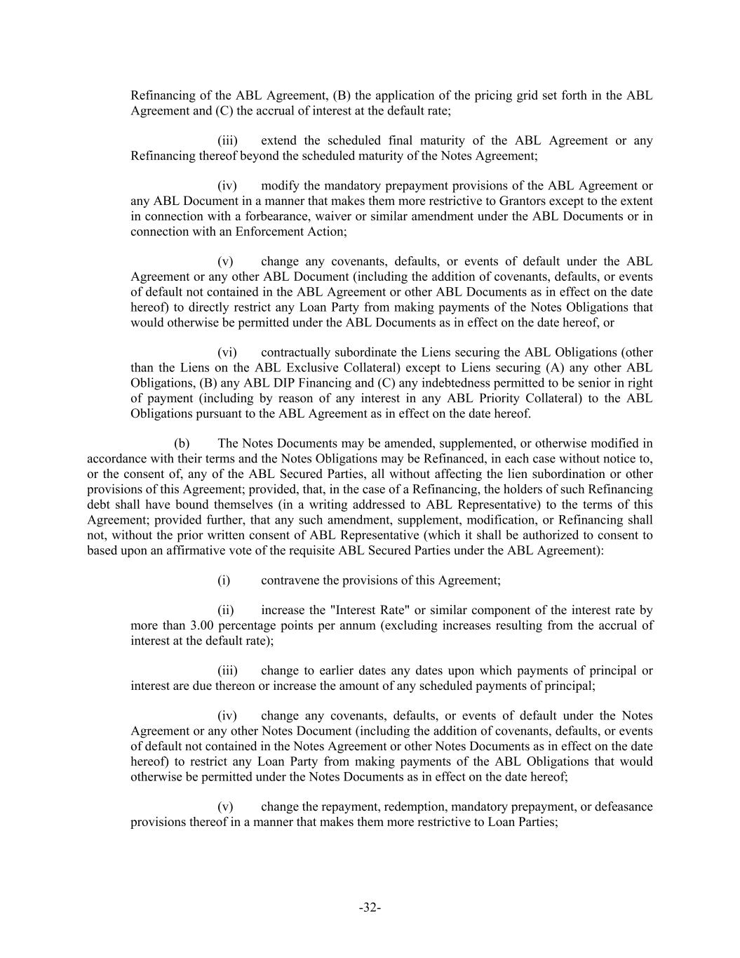 -32- Refinancing of the ABL Agreement, (B) the application of the pricing grid set forth in the ABL Agreement and (C) the accrual of interest at the default rate; (iii) extend the scheduled final maturity of the ABL Agreement or any Refinancing thereof beyond the scheduled maturity of the Notes Agreement; (iv) modify the mandatory prepayment provisions of the ABL Agreement or any ABL Document in a manner that makes them more restrictive to Grantors except to the extent in connection with a forbearance, waiver or similar amendment under the ABL Documents or in connection with an Enforcement Action; (v) change any covenants, defaults, or events of default under the ABL Agreement or any other ABL Document (including the addition of covenants, defaults, or events of default not contained in the ABL Agreement or other ABL Documents as in effect on the date hereof) to directly restrict any Loan Party from making payments of the Notes Obligations that would otherwise be permitted under the ABL Documents as in effect on the date hereof, or (vi) contractually subordinate the Liens securing the ABL Obligations (other than the Liens on the ABL Exclusive Collateral) except to Liens securing (A) any other ABL Obligations, (B) any ABL DIP Financing and (C) any indebtedness permitted to be senior in right of payment (including by reason of any interest in any ABL Priority Collateral) to the ABL Obligations pursuant to the ABL Agreement as in effect on the date hereof. (b) The Notes Documents may be amended, supplemented, or otherwise modified in accordance with their terms and the Notes Obligations may be Refinanced, in each case without notice to, or the consent of, any of the ABL Secured Parties, all without affecting the lien subordination or other provisions of this Agreement; provided, that, in the case of a Refinancing, the holders of such Refinancing debt shall have bound themselves (in a writing addressed to ABL Representative) to the terms of this Agreement; provided further, that any such amendment, supplement, modification, or Refinancing shall not, without the prior written consent of ABL Representative (which it shall be authorized to consent to based upon an affirmative vote of the requisite ABL Secured Parties under the ABL Agreement): (i) contravene the provisions of this Agreement; (ii) increase the "Interest Rate" or similar component of the interest rate by more than 3.00 percentage points per annum (excluding increases resulting from the accrual of interest at the default rate); (iii) change to earlier dates any dates upon which payments of principal or interest are due thereon or increase the amount of any scheduled payments of principal; (iv) change any covenants, defaults, or events of default under the Notes Agreement or any other Notes Document (including the addition of covenants, defaults, or events of default not contained in the Notes Agreement or other Notes Documents as in effect on the date hereof) to restrict any Loan Party from making payments of the ABL Obligations that would otherwise be permitted under the Notes Documents as in effect on the date hereof; (v) change the repayment, redemption, mandatory prepayment, or defeasance provisions thereof in a manner that makes them more restrictive to Loan Parties;