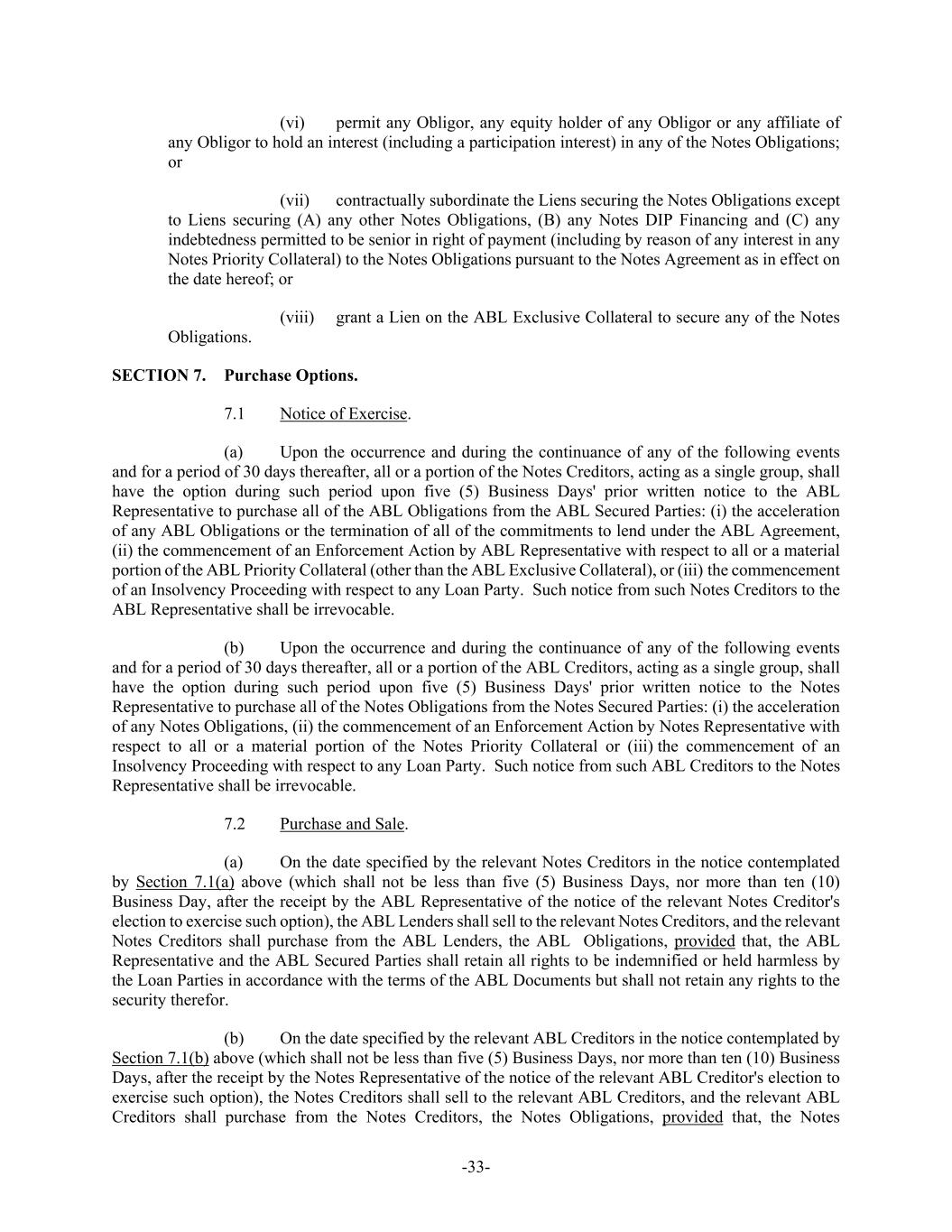 -33- (vi) permit any Obligor, any equity holder of any Obligor or any affiliate of any Obligor to hold an interest (including a participation interest) in any of the Notes Obligations; or (vii) contractually subordinate the Liens securing the Notes Obligations except to Liens securing (A) any other Notes Obligations, (B) any Notes DIP Financing and (C) any indebtedness permitted to be senior in right of payment (including by reason of any interest in any Notes Priority Collateral) to the Notes Obligations pursuant to the Notes Agreement as in effect on the date hereof; or (viii) grant a Lien on the ABL Exclusive Collateral to secure any of the Notes Obligations. SECTION 7. Purchase Options. 7.1 Notice of Exercise. (a) Upon the occurrence and during the continuance of any of the following events and for a period of 30 days thereafter, all or a portion of the Notes Creditors, acting as a single group, shall have the option during such period upon five (5) Business Days' prior written notice to the ABL Representative to purchase all of the ABL Obligations from the ABL Secured Parties: (i) the acceleration of any ABL Obligations or the termination of all of the commitments to lend under the ABL Agreement, (ii) the commencement of an Enforcement Action by ABL Representative with respect to all or a material portion of the ABL Priority Collateral (other than the ABL Exclusive Collateral), or (iii) the commencement of an Insolvency Proceeding with respect to any Loan Party. Such notice from such Notes Creditors to the ABL Representative shall be irrevocable. (b) Upon the occurrence and during the continuance of any of the following events and for a period of 30 days thereafter, all or a portion of the ABL Creditors, acting as a single group, shall have the option during such period upon five (5) Business Days' prior written notice to the Notes Representative to purchase all of the Notes Obligations from the Notes Secured Parties: (i) the acceleration of any Notes Obligations, (ii) the commencement of an Enforcement Action by Notes Representative with respect to all or a material portion of the Notes Priority Collateral or (iii) the commencement of an Insolvency Proceeding with respect to any Loan Party. Such notice from such ABL Creditors to the Notes Representative shall be irrevocable. 7.2 Purchase and Sale. (a) On the date specified by the relevant Notes Creditors in the notice contemplated by Section 7.1(a) above (which shall not be less than five (5) Business Days, nor more than ten (10) Business Day, after the receipt by the ABL Representative of the notice of the relevant Notes Creditor's election to exercise such option), the ABL Lenders shall sell to the relevant Notes Creditors, and the relevant Notes Creditors shall purchase from the ABL Lenders, the ABL Obligations, provided that, the ABL Representative and the ABL Secured Parties shall retain all rights to be indemnified or held harmless by the Loan Parties in accordance with the terms of the ABL Documents but shall not retain any rights to the security therefor. (b) On the date specified by the relevant ABL Creditors in the notice contemplated by Section 7.1(b) above (which shall not be less than five (5) Business Days, nor more than ten (10) Business Days, after the receipt by the Notes Representative of the notice of the relevant ABL Creditor's election to exercise such option), the Notes Creditors shall sell to the relevant ABL Creditors, and the relevant ABL Creditors shall purchase from the Notes Creditors, the Notes Obligations, provided that, the Notes