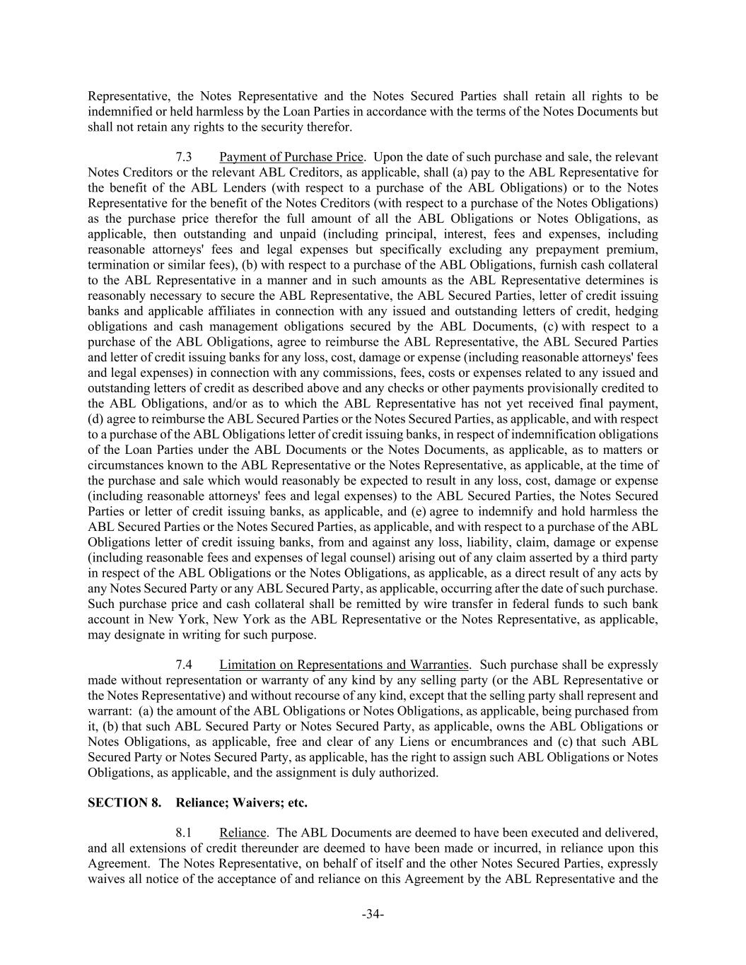-34- Representative, the Notes Representative and the Notes Secured Parties shall retain all rights to be indemnified or held harmless by the Loan Parties in accordance with the terms of the Notes Documents but shall not retain any rights to the security therefor. 7.3 Payment of Purchase Price. Upon the date of such purchase and sale, the relevant Notes Creditors or the relevant ABL Creditors, as applicable, shall (a) pay to the ABL Representative for the benefit of the ABL Lenders (with respect to a purchase of the ABL Obligations) or to the Notes Representative for the benefit of the Notes Creditors (with respect to a purchase of the Notes Obligations) as the purchase price therefor the full amount of all the ABL Obligations or Notes Obligations, as applicable, then outstanding and unpaid (including principal, interest, fees and expenses, including reasonable attorneys' fees and legal expenses but specifically excluding any prepayment premium, termination or similar fees), (b) with respect to a purchase of the ABL Obligations, furnish cash collateral to the ABL Representative in a manner and in such amounts as the ABL Representative determines is reasonably necessary to secure the ABL Representative, the ABL Secured Parties, letter of credit issuing banks and applicable affiliates in connection with any issued and outstanding letters of credit, hedging obligations and cash management obligations secured by the ABL Documents, (c) with respect to a purchase of the ABL Obligations, agree to reimburse the ABL Representative, the ABL Secured Parties and letter of credit issuing banks for any loss, cost, damage or expense (including reasonable attorneys' fees and legal expenses) in connection with any commissions, fees, costs or expenses related to any issued and outstanding letters of credit as described above and any checks or other payments provisionally credited to the ABL Obligations, and/or as to which the ABL Representative has not yet received final payment, (d) agree to reimburse the ABL Secured Parties or the Notes Secured Parties, as applicable, and with respect to a purchase of the ABL Obligations letter of credit issuing banks, in respect of indemnification obligations of the Loan Parties under the ABL Documents or the Notes Documents, as applicable, as to matters or circumstances known to the ABL Representative or the Notes Representative, as applicable, at the time of the purchase and sale which would reasonably be expected to result in any loss, cost, damage or expense (including reasonable attorneys' fees and legal expenses) to the ABL Secured Parties, the Notes Secured Parties or letter of credit issuing banks, as applicable, and (e) agree to indemnify and hold harmless the ABL Secured Parties or the Notes Secured Parties, as applicable, and with respect to a purchase of the ABL Obligations letter of credit issuing banks, from and against any loss, liability, claim, damage or expense (including reasonable fees and expenses of legal counsel) arising out of any claim asserted by a third party in respect of the ABL Obligations or the Notes Obligations, as applicable, as a direct result of any acts by any Notes Secured Party or any ABL Secured Party, as applicable, occurring after the date of such purchase. Such purchase price and cash collateral shall be remitted by wire transfer in federal funds to such bank account in New York, New York as the ABL Representative or the Notes Representative, as applicable, may designate in writing for such purpose. 7.4 Limitation on Representations and Warranties. Such purchase shall be expressly made without representation or warranty of any kind by any selling party (or the ABL Representative or the Notes Representative) and without recourse of any kind, except that the selling party shall represent and warrant: (a) the amount of the ABL Obligations or Notes Obligations, as applicable, being purchased from it, (b) that such ABL Secured Party or Notes Secured Party, as applicable, owns the ABL Obligations or Notes Obligations, as applicable, free and clear of any Liens or encumbrances and (c) that such ABL Secured Party or Notes Secured Party, as applicable, has the right to assign such ABL Obligations or Notes Obligations, as applicable, and the assignment is duly authorized. SECTION 8. Reliance; Waivers; etc. 8.1 Reliance. The ABL Documents are deemed to have been executed and delivered, and all extensions of credit thereunder are deemed to have been made or incurred, in reliance upon this Agreement. The Notes Representative, on behalf of itself and the other Notes Secured Parties, expressly waives all notice of the acceptance of and reliance on this Agreement by the ABL Representative and the