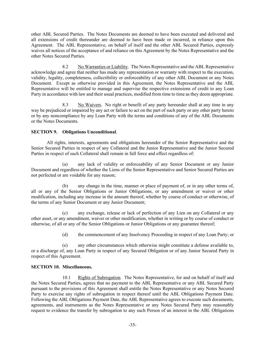 -35- other ABL Secured Parties. The Notes Documents are deemed to have been executed and delivered and all extensions of credit thereunder are deemed to have been made or incurred, in reliance upon this Agreement. The ABL Representative, on behalf of itself and the other ABL Secured Parties, expressly waives all notices of the acceptance of and reliance on this Agreement by the Notes Representative and the other Notes Secured Parties. 8.2 No Warranties or Liability. The Notes Representative and the ABL Representative acknowledge and agree that neither has made any representation or warranty with respect to the execution, validity, legality, completeness, collectibility or enforceability of any other ABL Document or any Notes Document. Except as otherwise provided in this Agreement, the Notes Representative and the ABL Representative will be entitled to manage and supervise the respective extensions of credit to any Loan Party in accordance with law and their usual practices, modified from time to time as they deem appropriate. 8.3 No Waivers. No right or benefit of any party hereunder shall at any time in any way be prejudiced or impaired by any act or failure to act on the part of such party or any other party hereto or by any noncompliance by any Loan Party with the terms and conditions of any of the ABL Documents or the Notes Documents. SECTION 9. Obligations Unconditional. All rights, interests, agreements and obligations hereunder of the Senior Representative and the Senior Secured Parties in respect of any Collateral and the Junior Representative and the Junior Secured Parties in respect of such Collateral shall remain in full force and effect regardless of: (a) any lack of validity or enforceability of any Senior Document or any Junior Document and regardless of whether the Liens of the Senior Representative and Senior Secured Parties are not perfected or are voidable for any reason; (b) any change in the time, manner or place of payment of, or in any other terms of, all or any of the Senior Obligations or Junior Obligations, or any amendment or waiver or other modification, including any increase in the amount thereof, whether by course of conduct or otherwise, of the terms of any Senior Document or any Junior Document; (c) any exchange, release or lack of perfection of any Lien on any Collateral or any other asset, or any amendment, waiver or other modification, whether in writing or by course of conduct or otherwise, of all or any of the Senior Obligations or Junior Obligations or any guarantee thereof; (d) the commencement of any Insolvency Proceeding in respect of any Loan Party; or (e) any other circumstances which otherwise might constitute a defense available to, or a discharge of, any Loan Party in respect of any Secured Obligation or of any Junior Secured Party in respect of this Agreement. SECTION 10. Miscellaneous. 10.1 Rights of Subrogation. The Notes Representative, for and on behalf of itself and the Notes Secured Parties, agrees that no payment to the ABL Representative or any ABL Secured Party pursuant to the provisions of this Agreement shall entitle the Notes Representative or any Notes Secured Party to exercise any rights of subrogation in respect thereof until the ABL Obligations Payment Date. Following the ABL Obligations Payment Date, the ABL Representative agrees to execute such documents, agreements, and instruments as the Notes Representative or any Notes Secured Party may reasonably request to evidence the transfer by subrogation to any such Person of an interest in the ABL Obligations