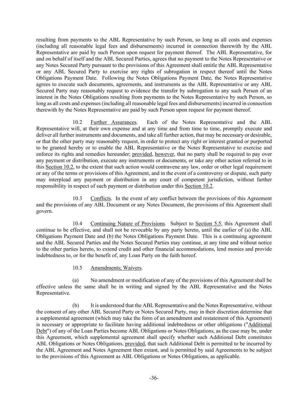 -36- resulting from payments to the ABL Representative by such Person, so long as all costs and expenses (including all reasonable legal fees and disbursements) incurred in connection therewith by the ABL Representative are paid by such Person upon request for payment thereof. The ABL Representative, for and on behalf of itself and the ABL Secured Parties, agrees that no payment to the Notes Representative or any Notes Secured Party pursuant to the provisions of this Agreement shall entitle the ABL Representative or any ABL Secured Party to exercise any rights of subrogation in respect thereof until the Notes Obligations Payment Date. Following the Notes Obligations Payment Date, the Notes Representative agrees to execute such documents, agreements, and instruments as the ABL Representative or any ABL Secured Party may reasonably request to evidence the transfer by subrogation to any such Person of an interest in the Notes Obligations resulting from payments to the Notes Representative by such Person, so long as all costs and expenses (including all reasonable legal fees and disbursements) incurred in connection therewith by the Notes Representative are paid by such Person upon request for payment thereof. 10.2 Further Assurances. Each of the Notes Representative and the ABL Representative will, at their own expense and at any time and from time to time, promptly execute and deliver all further instruments and documents, and take all further action, that may be necessary or desirable, or that the other party may reasonably request, in order to protect any right or interest granted or purported to be granted hereby or to enable the ABL Representative or the Notes Representative to exercise and enforce its rights and remedies hereunder; provided, however, that no party shall be required to pay over any payment or distribution, execute any instruments or documents, or take any other action referred to in this Section 10.2, to the extent that such action would contravene any law, order or other legal requirement or any of the terms or provisions of this Agreement, and in the event of a controversy or dispute, such party may interplead any payment or distribution in any court of competent jurisdiction, without further responsibility in respect of such payment or distribution under this Section 10.2. 10.3 Conflicts. In the event of any conflict between the provisions of this Agreement and the provisions of any ABL Document or any Notes Document, the provisions of this Agreement shall govern. 10.4 Continuing Nature of Provisions. Subject to Section 5.5, this Agreement shall continue to be effective, and shall not be revocable by any party hereto, until the earlier of (a) the ABL Obligations Payment Date and (b) the Notes Obligations Payment Date. This is a continuing agreement and the ABL Secured Parties and the Notes Secured Parties may continue, at any time and without notice to the other parties hereto, to extend credit and other financial accommodations, lend monies and provide indebtedness to, or for the benefit of, any Loan Party on the faith hereof. 10.5 Amendments; Waivers. (a) No amendment or modification of any of the provisions of this Agreement shall be effective unless the same shall be in writing and signed by the ABL Representative and the Notes Representative. (b) It is understood that the ABL Representative and the Notes Representative, without the consent of any other ABL Secured Party or Notes Secured Party, may in their discretion determine that a supplemental agreement (which may take the form of an amendment and restatement of this Agreement) is necessary or appropriate to facilitate having additional indebtedness or other obligations ("Additional Debt") of any of the Loan Parties become ABL Obligations or Notes Obligations, as the case may be, under this Agreement, which supplemental agreement shall specify whether such Additional Debt constitutes ABL Obligations or Notes Obligations, provided, that such Additional Debt is permitted to be incurred by the ABL Agreement and Notes Agreement then extant, and is permitted by said Agreements to be subject to the provisions of this Agreement as ABL Obligations or Notes Obligations, as applicable.