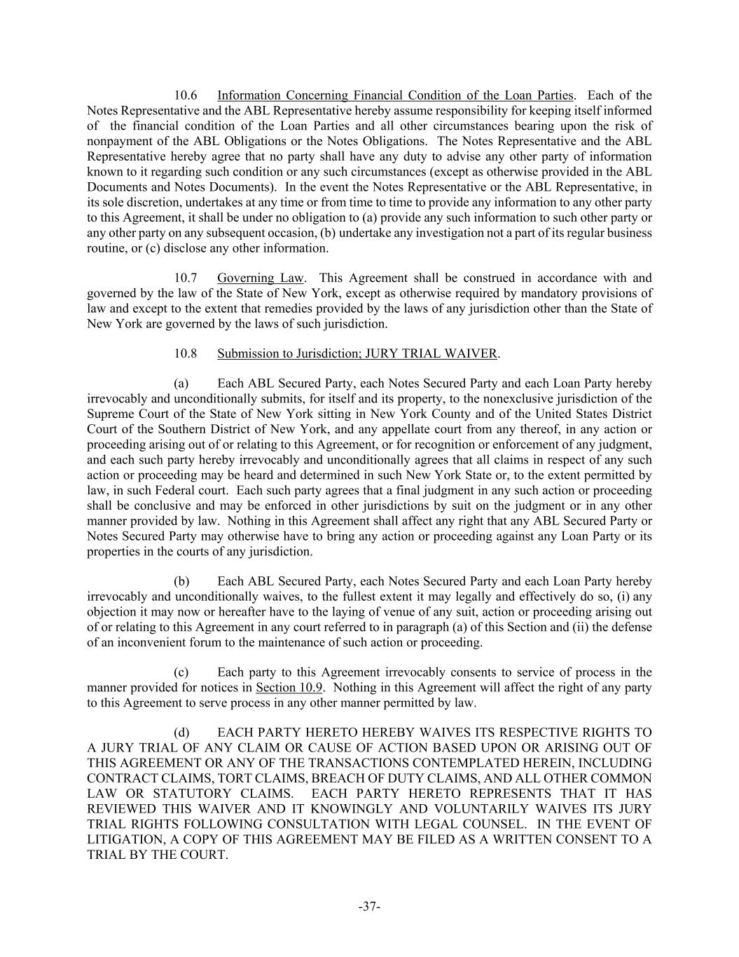 -37- 10.6 Information Concerning Financial Condition of the Loan Parties. Each of the Notes Representative and the ABL Representative hereby assume responsibility for keeping itself informed of the financial condition of the Loan Parties and all other circumstances bearing upon the risk of nonpayment of the ABL Obligations or the Notes Obligations. The Notes Representative and the ABL Representative hereby agree that no party shall have any duty to advise any other party of information known to it regarding such condition or any such circumstances (except as otherwise provided in the ABL Documents and Notes Documents). In the event the Notes Representative or the ABL Representative, in its sole discretion, undertakes at any time or from time to time to provide any information to any other party to this Agreement, it shall be under no obligation to (a) provide any such information to such other party or any other party on any subsequent occasion, (b) undertake any investigation not a part of its regular business routine, or (c) disclose any other information. 10.7 Governing Law. This Agreement shall be construed in accordance with and governed by the law of the State of New York, except as otherwise required by mandatory provisions of law and except to the extent that remedies provided by the laws of any jurisdiction other than the State of New York are governed by the laws of such jurisdiction. 10.8 Submission to Jurisdiction; JURY TRIAL WAIVER. (a) Each ABL Secured Party, each Notes Secured Party and each Loan Party hereby irrevocably and unconditionally submits, for itself and its property, to the nonexclusive jurisdiction of the Supreme Court of the State of New York sitting in New York County and of the United States District Court of the Southern District of New York, and any appellate court from any thereof, in any action or proceeding arising out of or relating to this Agreement, or for recognition or enforcement of any judgment, and each such party hereby irrevocably and unconditionally agrees that all claims in respect of any such action or proceeding may be heard and determined in such New York State or, to the extent permitted by law, in such Federal court. Each such party agrees that a final judgment in any such action or proceeding shall be conclusive and may be enforced in other jurisdictions by suit on the judgment or in any other manner provided by law. Nothing in this Agreement shall affect any right that any ABL Secured Party or Notes Secured Party may otherwise have to bring any action or proceeding against any Loan Party or its properties in the courts of any jurisdiction. (b) Each ABL Secured Party, each Notes Secured Party and each Loan Party hereby irrevocably and unconditionally waives, to the fullest extent it may legally and effectively do so, (i) any objection it may now or hereafter have to the laying of venue of any suit, action or proceeding arising out of or relating to this Agreement in any court referred to in paragraph (a) of this Section and (ii) the defense of an inconvenient forum to the maintenance of such action or proceeding. (c) Each party to this Agreement irrevocably consents to service of process in the manner provided for notices in Section 10.9. Nothing in this Agreement will affect the right of any party to this Agreement to serve process in any other manner permitted by law. (d) EACH PARTY HERETO HEREBY WAIVES ITS RESPECTIVE RIGHTS TO A JURY TRIAL OF ANY CLAIM OR CAUSE OF ACTION BASED UPON OR ARISING OUT OF THIS AGREEMENT OR ANY OF THE TRANSACTIONS CONTEMPLATED HEREIN, INCLUDING CONTRACT CLAIMS, TORT CLAIMS, BREACH OF DUTY CLAIMS, AND ALL OTHER COMMON LAW OR STATUTORY CLAIMS. EACH PARTY HERETO REPRESENTS THAT IT HAS REVIEWED THIS WAIVER AND IT KNOWINGLY AND VOLUNTARILY WAIVES ITS JURY TRIAL RIGHTS FOLLOWING CONSULTATION WITH LEGAL COUNSEL. IN THE EVENT OF LITIGATION, A COPY OF THIS AGREEMENT MAY BE FILED AS A WRITTEN CONSENT TO A TRIAL BY THE COURT.