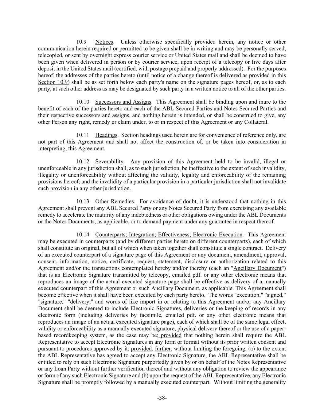 -38- 10.9 Notices. Unless otherwise specifically provided herein, any notice or other communication herein required or permitted to be given shall be in writing and may be personally served, telecopied, or sent by overnight express courier service or United States mail and shall be deemed to have been given when delivered in person or by courier service, upon receipt of a telecopy or five days after deposit in the United States mail (certified, with postage prepaid and properly addressed). For the purposes hereof, the addresses of the parties hereto (until notice of a change thereof is delivered as provided in this Section 10.9) shall be as set forth below each party's name on the signature pages hereof, or, as to each party, at such other address as may be designated by such party in a written notice to all of the other parties. 10.10 Successors and Assigns. This Agreement shall be binding upon and inure to the benefit of each of the parties hereto and each of the ABL Secured Parties and Notes Secured Parties and their respective successors and assigns, and nothing herein is intended, or shall be construed to give, any other Person any right, remedy or claim under, to or in respect of this Agreement or any Collateral. 10.11 Headings. Section headings used herein are for convenience of reference only, are not part of this Agreement and shall not affect the construction of, or be taken into consideration in interpreting, this Agreement. 10.12 Severability. Any provision of this Agreement held to be invalid, illegal or unenforceable in any jurisdiction shall, as to such jurisdiction, be ineffective to the extent of such invalidity, illegality or unenforceability without affecting the validity, legality and enforceability of the remaining provisions hereof; and the invalidity of a particular provision in a particular jurisdiction shall not invalidate such provision in any other jurisdiction. 10.13 Other Remedies. For avoidance of doubt, it is understood that nothing in this Agreement shall prevent any ABL Secured Party or any Notes Secured Party from exercising any available remedy to accelerate the maturity of any indebtedness or other obligations owing under the ABL Documents or the Notes Documents, as applicable, or to demand payment under any guarantee in respect thereof. 10.14 Counterparts; Integration; Effectiveness; Electronic Execution. This Agreement may be executed in counterparts (and by different parties hereto on different counterparts), each of which shall constitute an original, but all of which when taken together shall constitute a single contract. Delivery of an executed counterpart of a signature page of this Agreement or any document, amendment, approval, consent, information, notice, certificate, request, statement, disclosure or authorization related to this Agreement and/or the transactions contemplated hereby and/or thereby (each an "Ancillary Document") that is an Electronic Signature transmitted by telecopy, emailed pdf. or any other electronic means that reproduces an image of the actual executed signature page shall be effective as delivery of a manually executed counterpart of this Agreement or such Ancillary Document, as applicable. This Agreement shall become effective when it shall have been executed by each party hereto. The words "execution," "signed," "signature," "delivery," and words of like import in or relating to this Agreement and/or any Ancillary Document shall be deemed to include Electronic Signatures, deliveries or the keeping of records in any electronic form (including deliveries by facsimile, emailed pdf. or any other electronic means that reproduces an image of an actual executed signature page), each of which shall be of the same legal effect, validity or enforceability as a manually executed signature, physical delivery thereof or the use of a paper- based recordkeeping system, as the case may be; provided that nothing herein shall require the ABL Representative to accept Electronic Signatures in any form or format without its prior written consent and pursuant to procedures approved by it; provided, further, without limiting the foregoing, (a) to the extent the ABL Representative has agreed to accept any Electronic Signature, the ABL Representative shall be entitled to rely on such Electronic Signature purportedly given by or on behalf of the Notes Representative or any Loan Party without further verification thereof and without any obligation to review the appearance or form of any such Electronic Signature and (b) upon the request of the ABL Representative, any Electronic Signature shall be promptly followed by a manually executed counterpart. Without limiting the generality