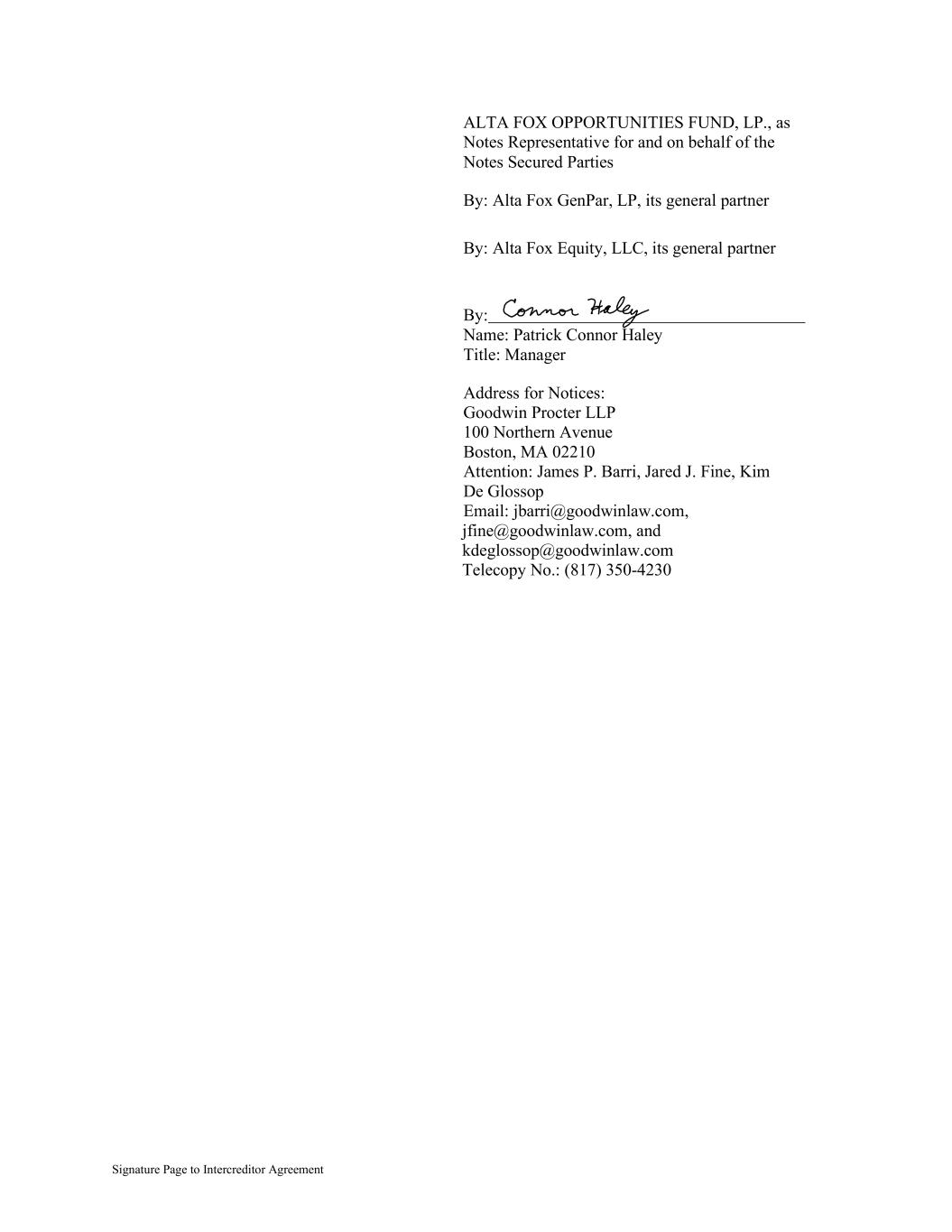 Signature Page to Intercreditor Agreement ALTA FOX OPPORTUNITIES FUND, LP., as Notes Representative for and on behalf of the Notes Secured Parties By: Alta Fox GenPar, LP, its general partner By: Alta Fox Equity, LLC, its general partner By: Name: Patrick Connor Haley Title: Manager Address for Notices: Goodwin Procter LLP 100 Northern Avenue Boston, MA 02210 Attention: James P. Barri, Jared J. Fine, Kim De Glossop Email: jbarri@goodwinlaw.com, jfine@goodwinlaw.com, and kdeglossop@goodwinlaw.com Telecopy No.: (817) 350-4230