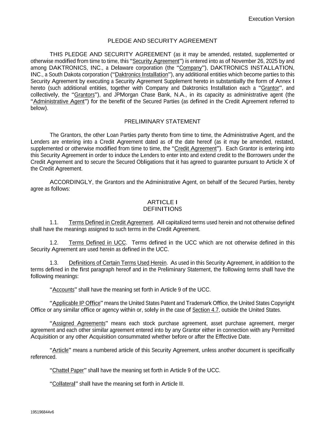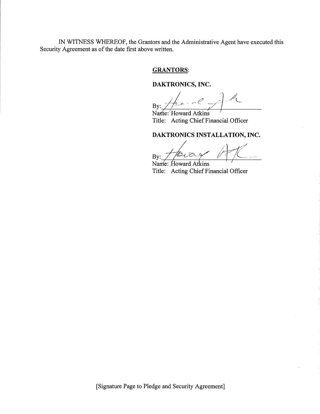 195196844v6 Execution Version PLEDGE AND SECURITY AGREEMENT THIS PLEDGE AND SECURITY AGREEMENT (as it may be amended, restated, supplemented or otherwise modified from time to time, this “Security Agreement”) is entered into as of November 26, 2025 by and among DAKTRONICS, INC., a Delaware corporation (the “Company”), DAKTRONICS INSTALLATION, INC., a South Dakota corporation (“Daktronics Installation”), any additional entities which become parties to this Security Agreement by executing a Security Agreement Supplement hereto in substantially the form of Annex I hereto (such additional entities, together with Company and Daktronics Installation each a “Grantor”, and collectively, the “Grantors”), and JPMorgan Chase Bank, N.A., in its capacity as administrative agent (the “Administrative Agent”) for the benefit of the Secured Parties (as defined in the Credit Agreement referred to below). PRELIMINARY STATEMENT The Grantors, the other Loan Parties party thereto from time to time, the Administrative Agent, and the Lenders are entering into a Credit Agreement dated as of the date hereof (as it may be amended, restated, supplemented or otherwise modified from time to time, the “Credit Agreement”). Each Grantor is entering into this Security Agreement in order to induce the Lenders to enter into and extend credit to the Borrowers under the Credit Agreement and to secure the Secured Obligations that it has agreed to guarantee pursuant to Article X of the Credit Agreement. ACCORDINGLY, the Grantors and the Administrative Agent, on behalf of the Secured Parties, hereby agree as follows: ARTICLE I DEFINITIONS 1.1. Terms Defined in Credit Agreement. All capitalized terms used herein and not otherwise defined shall have the meanings assigned to such terms in the Credit Agreement. 1.2. Terms Defined in UCC. Terms defined in the UCC which are not otherwise defined in this Security Agreement are used herein as defined in the UCC. 1.3. Definitions of Certain Terms Used Herein. As used in this Security Agreement, in addition to the terms defined in the first paragraph hereof and in the Preliminary Statement, the following terms shall have the following meanings: “Accounts” shall have the meaning set forth in Article 9 of the UCC. “Applicable IP Office” means the United States Patent and Trademark Office, the United States Copyright Office or any similar office or agency within or, solely in the case of Section 4.7, outside the United States. “Assigned Agreements” means each stock purchase agreement, asset purchase agreement, merger agreement and each other similar agreement entered into by any Grantor either in connection with any Permitted Acquisition or any other Acquisition consummated whether before or after the Effective Date. “Article” means a numbered article of this Security Agreement, unless another document is specifically referenced. “Chattel Paper” shall have the meaning set forth in Article 9 of the UCC. “Collateral” shall have the meaning set forth in Article II.