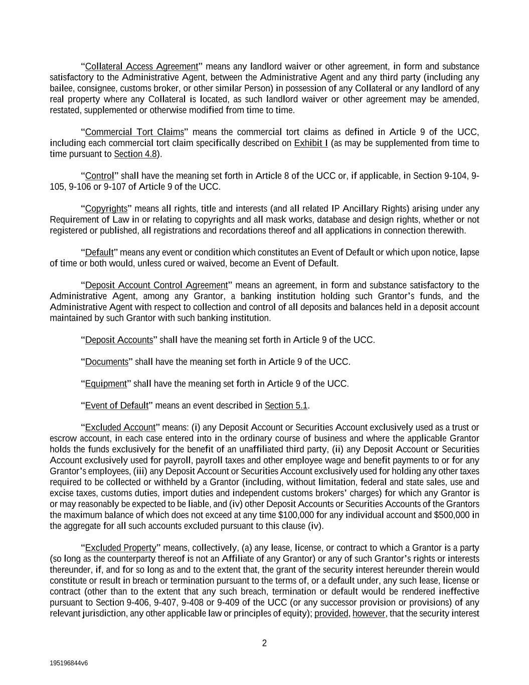 195196844v6 2 “Collateral Access Agreement” means any landlord waiver or other agreement, in form and substance satisfactory to the Administrative Agent, between the Administrative Agent and any third party (including any bailee, consignee, customs broker, or other similar Person) in possession of any Collateral or any landlord of any real property where any Collateral is located, as such landlord waiver or other agreement may be amended, restated, supplemented or otherwise modified from time to time. “Commercial Tort Claims” means the commercial tort claims as defined in Article 9 of the UCC, including each commercial tort claim specifically described on Exhibit I (as may be supplemented from time to time pursuant to Section 4.8). “Control” shall have the meaning set forth in Article 8 of the UCC or, if applicable, in Section 9-104, 9- 105, 9-106 or 9-107 of Article 9 of the UCC. “Copyrights” means all rights, title and interests (and all related IP Ancillary Rights) arising under any Requirement of Law in or relating to copyrights and all mask works, database and design rights, whether or not registered or published, all registrations and recordations thereof and all applications in connection therewith. “Default” means any event or condition which constitutes an Event of Default or which upon notice, lapse of time or both would, unless cured or waived, become an Event of Default. “Deposit Account Control Agreement” means an agreement, in form and substance satisfactory to the Administrative Agent, among any Grantor, a banking institution holding such Grantor’s funds, and the Administrative Agent with respect to collection and control of all deposits and balances held in a deposit account maintained by such Grantor with such banking institution. “Deposit Accounts” shall have the meaning set forth in Article 9 of the UCC. “Documents” shall have the meaning set forth in Article 9 of the UCC. “Equipment” shall have the meaning set forth in Article 9 of the UCC. “Event of Default” means an event described in Section 5.1. “Excluded Account” means: (i) any Deposit Account or Securities Account exclusively used as a trust or escrow account, in each case entered into in the ordinary course of business and where the applicable Grantor holds the funds exclusively for the benefit of an unaffiliated third party, (ii) any Deposit Account or Securities Account exclusively used for payroll, payroll taxes and other employee wage and benefit payments to or for any Grantor’s employees, (iii) any Deposit Account or Securities Account exclusively used for holding any other taxes required to be collected or withheld by a Grantor (including, without limitation, federal and state sales, use and excise taxes, customs duties, import duties and independent customs brokers’ charges) for which any Grantor is or may reasonably be expected to be liable, and (iv) other Deposit Accounts or Securities Accounts of the Grantors the maximum balance of which does not exceed at any time $100,000 for any individual account and $500,000 in the aggregate for all such accounts excluded pursuant to this clause (iv). “Excluded Property” means, collectively, (a) any lease, license, or contract to which a Grantor is a party (so long as the counterparty thereof is not an Affiliate of any Grantor) or any of such Grantor’s rights or interests thereunder, if, and for so long as and to the extent that, the grant of the security interest hereunder therein would constitute or result in breach or termination pursuant to the terms of, or a default under, any such lease, license or contract (other than to the extent that any such breach, termination or default would be rendered ineffective pursuant to Section 9-406, 9-407, 9-408 or 9-409 of the UCC (or any successor provision or provisions) of any relevant jurisdiction, any other applicable law or principles of equity); provided, however, that the security interest