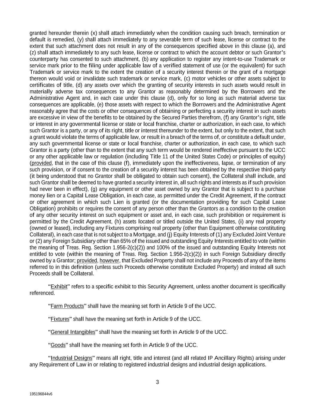 195196844v6 3 granted hereunder therein (x) shall attach immediately when the condition causing such breach, termination or default is remedied, (y) shall attach immediately to any severable term of such lease, license or contract to the extent that such attachment does not result in any of the consequences specified above in this clause (a), and (z) shall attach immediately to any such lease, license or contract to which the account debtor or such Grantor’s counterparty has consented to such attachment, (b) any application to register any intent-to-use Trademark or service mark prior to the filing under applicable law of a verified statement of use (or the equivalent) for such Trademark or service mark to the extent the creation of a security interest therein or the grant of a mortgage thereon would void or invalidate such trademark or service mark, (c) motor vehicles or other assets subject to certificates of title, (d) any assets over which the granting of security interests in such assets would result in materially adverse tax consequences to any Grantor as reasonably determined by the Borrowers and the Administrative Agent and, in each case under this clause (d), only for so long as such material adverse tax consequences are applicable, (e) those assets with respect to which the Borrowers and the Administrative Agent reasonably agree that the costs or other consequences of obtaining or perfecting a security interest in such assets are excessive in view of the benefits to be obtained by the Secured Parties therefrom, (f) any Grantor’s right, title or interest in any governmental license or state or local franchise, charter or authorization, in each case, to which such Grantor is a party, or any of its right, title or interest thereunder to the extent, but only to the extent, that such a grant would violate the terms of applicable law, or result in a breach of the terms of, or constitute a default under, any such governmental license or state or local franchise, charter or authorization, in each case, to which such Grantor is a party (other than to the extent that any such term would be rendered ineffective pursuant to the UCC or any other applicable law or regulation (including Title 11 of the United States Code) or principles of equity) (provided, that in the case of this clause (f), immediately upon the ineffectiveness, lapse, or termination of any such provision, or if consent to the creation of a security interest has been obtained by the respective third-party (it being understood that no Grantor shall be obligated to obtain such consent), the Collateral shall include, and such Grantor shall be deemed to have granted a security interest in, all such rights and interests as if such provision had never been in effect), (g) any equipment or other asset owned by any Grantor that is subject to a purchase money lien or a Capital Lease Obligation, in each case, as permitted under the Credit Agreement, if the contract or other agreement in which such Lien is granted (or the documentation providing for such Capital Lease Obligation) prohibits or requires the consent of any person other than the Grantors as a condition to the creation of any other security interest on such equipment or asset and, in each case, such prohibition or requirement is permitted by the Credit Agreement, (h) assets located or titled outside the United States, (i) any real property (owned or leased), including any Fixtures comprising real property (other than Equipment otherwise constituting Collateral), in each case that is not subject to a Mortgage, and (j) Equity Interests of (1) any Excluded Joint Venture or (2) any Foreign Subsidiary other than 65% of the issued and outstanding Equity Interests entitled to vote (within the meaning of Treas. Reg. Section 1.956-2(c)(2)) and 100% of the issued and outstanding Equity Interests not entitled to vote (within the meaning of Treas. Reg. Section 1.956-2(c)(2)) in such Foreign Subsidiary directly owned by a Grantor; provided, however, that Excluded Property shall not include any Proceeds of any of the items referred to in this definition (unless such Proceeds otherwise constitute Excluded Property) and instead all such Proceeds shall be Collateral. “Exhibit” refers to a specific exhibit to this Security Agreement, unless another document is specifically referenced. “Farm Products” shall have the meaning set forth in Article 9 of the UCC. “Fixtures” shall have the meaning set forth in Article 9 of the UCC. “General Intangibles” shall have the meaning set forth in Article 9 of the UCC. “Goods” shall have the meaning set forth in Article 9 of the UCC. “Industrial Designs” means all right, title and interest (and all related IP Ancillary Rights) arising under any Requirement of Law in or relating to registered industrial designs and industrial design applications.