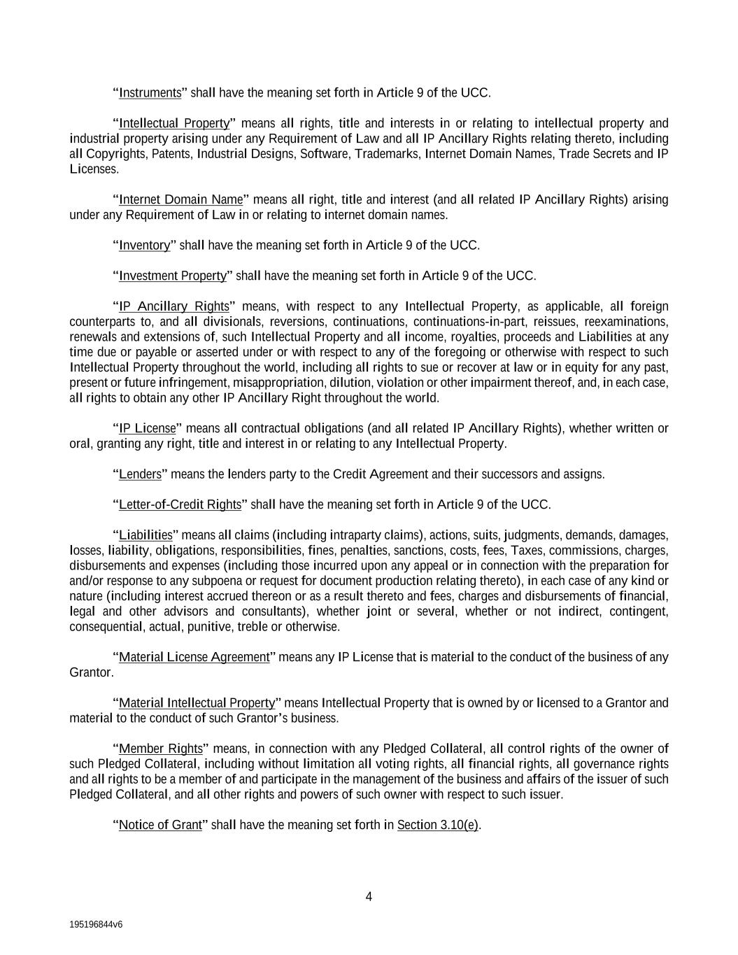 195196844v6 4 “Instruments” shall have the meaning set forth in Article 9 of the UCC. “Intellectual Property” means all rights, title and interests in or relating to intellectual property and industrial property arising under any Requirement of Law and all IP Ancillary Rights relating thereto, including all Copyrights, Patents, Industrial Designs, Software, Trademarks, Internet Domain Names, Trade Secrets and IP Licenses. “Internet Domain Name” means all right, title and interest (and all related IP Ancillary Rights) arising under any Requirement of Law in or relating to internet domain names. “Inventory” shall have the meaning set forth in Article 9 of the UCC. “Investment Property” shall have the meaning set forth in Article 9 of the UCC. “IP Ancillary Rights” means, with respect to any Intellectual Property, as applicable, all foreign counterparts to, and all divisionals, reversions, continuations, continuations-in-part, reissues, reexaminations, renewals and extensions of, such Intellectual Property and all income, royalties, proceeds and Liabilities at any time due or payable or asserted under or with respect to any of the foregoing or otherwise with respect to such Intellectual Property throughout the world, including all rights to sue or recover at law or in equity for any past, present or future infringement, misappropriation, dilution, violation or other impairment thereof, and, in each case, all rights to obtain any other IP Ancillary Right throughout the world. “IP License” means all contractual obligations (and all related IP Ancillary Rights), whether written or oral, granting any right, title and interest in or relating to any Intellectual Property. “Lenders” means the lenders party to the Credit Agreement and their successors and assigns. “Letter-of-Credit Rights” shall have the meaning set forth in Article 9 of the UCC. “Liabilities” means all claims (including intraparty claims), actions, suits, judgments, demands, damages, losses, liability, obligations, responsibilities, fines, penalties, sanctions, costs, fees, Taxes, commissions, charges, disbursements and expenses (including those incurred upon any appeal or in connection with the preparation for and/or response to any subpoena or request for document production relating thereto), in each case of any kind or nature (including interest accrued thereon or as a result thereto and fees, charges and disbursements of financial, legal and other advisors and consultants), whether joint or several, whether or not indirect, contingent, consequential, actual, punitive, treble or otherwise. “Material License Agreement” means any IP License that is material to the conduct of the business of any Grantor. “Material Intellectual Property” means Intellectual Property that is owned by or licensed to a Grantor and material to the conduct of such Grantor’s business. “Member Rights” means, in connection with any Pledged Collateral, all control rights of the owner of such Pledged Collateral, including without limitation all voting rights, all financial rights, all governance rights and all rights to be a member of and participate in the management of the business and affairs of the issuer of such Pledged Collateral, and all other rights and powers of such owner with respect to such issuer. “Notice of Grant” shall have the meaning set forth in Section 3.10(e).