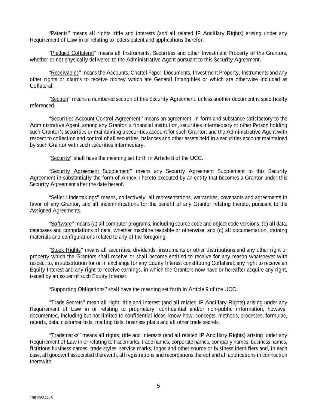 195196844v6 5 “Patents” means all rights, title and interests (and all related IP Ancillary Rights) arising under any Requirement of Law in or relating to letters patent and applications therefor. “Pledged Collateral” means all Instruments, Securities and other Investment Property of the Grantors, whether or not physically delivered to the Administrative Agent pursuant to this Security Agreement. “Receivables” means the Accounts, Chattel Paper, Documents, Investment Property, Instruments and any other rights or claims to receive money which are General Intangibles or which are otherwise included as Collateral. “Section” means a numbered section of this Security Agreement, unless another document is specifically referenced. “Securities Account Control Agreement” means an agreement, in form and substance satisfactory to the Administrative Agent, among any Grantor, a financial institution, securities intermediary or other Person holding such Grantor’s securities or maintaining a securities account for such Grantor, and the Administrative Agent with respect to collection and control of all securities, balances and other assets held in a securities account maintained by such Grantor with such securities intermediary. “Security” shall have the meaning set forth in Article 8 of the UCC. “Security Agreement Supplement” means any Security Agreement Supplement to this Security Agreement in substantially the form of Annex I hereto executed by an entity that becomes a Grantor under this Security Agreement after the date hereof. “Seller Undertakings” means, collectively, all representations, warranties, covenants and agreements in favor of any Grantor, and all indemnifications for the benefit of any Grantor relating thereto, pursuant to the Assigned Agreements. “Software” means (a) all computer programs, including source code and object code versions, (b) all data, databases and compilations of data, whether machine readable or otherwise, and (c) all documentation, training materials and configurations related to any of the foregoing. “Stock Rights” means all securities, dividends, instruments or other distributions and any other right or property which the Grantors shall receive or shall become entitled to receive for any reason whatsoever with respect to, in substitution for or in exchange for any Equity Interest constituting Collateral, any right to receive an Equity Interest and any right to receive earnings, in which the Grantors now have or hereafter acquire any right, issued by an issuer of such Equity Interest. “Supporting Obligations” shall have the meaning set forth in Article 9 of the UCC. “Trade Secrets” mean all right, title and interest (and all related IP Ancillary Rights) arising under any Requirement of Law in or relating to proprietary, confidential and/or non-public information, however documented, including but not limited to confidential ideas, know-how, concepts, methods, processes, formulae, reports, data, customer lists, mailing lists, business plans and all other trade secrets. “Trademarks” means all rights, title and interests (and all related IP Ancillary Rights) arising under any Requirement of Law in or relating to trademarks, trade names, corporate names, company names, business names, fictitious business names, trade styles, service marks, logos and other source or business identifiers and, in each case, all goodwill associated therewith, all registrations and recordations thereof and all applications in connection therewith.