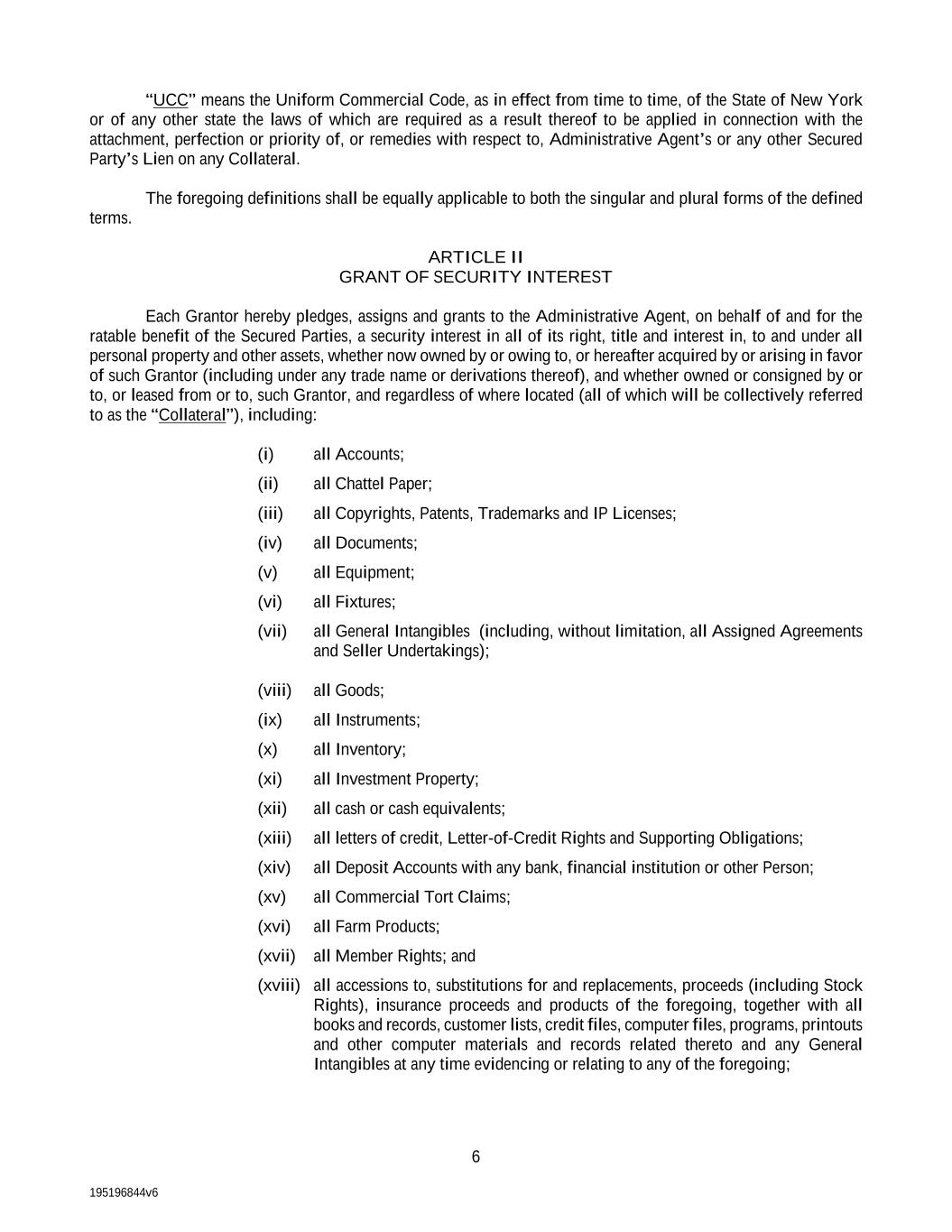 195196844v6 6 “UCC” means the Uniform Commercial Code, as in effect from time to time, of the State of New York or of any other state the laws of which are required as a result thereof to be applied in connection with the attachment, perfection or priority of, or remedies with respect to, Administrative Agent’s or any other Secured Party’s Lien on any Collateral. The foregoing definitions shall be equally applicable to both the singular and plural forms of the defined terms. ARTICLE II GRANT OF SECURITY INTEREST Each Grantor hereby pledges, assigns and grants to the Administrative Agent, on behalf of and for the ratable benefit of the Secured Parties, a security interest in all of its right, title and interest in, to and under all personal property and other assets, whether now owned by or owing to, or hereafter acquired by or arising in favor of such Grantor (including under any trade name or derivations thereof), and whether owned or consigned by or to, or leased from or to, such Grantor, and regardless of where located (all of which will be collectively referred to as the “Collateral”), including: (i) all Accounts; (ii) all Chattel Paper; (iii) all Copyrights, Patents, Trademarks and IP Licenses; (iv) all Documents; (v) all Equipment; (vi) all Fixtures; (vii) all General Intangibles (including, without limitation, all Assigned Agreements and Seller Undertakings); (viii) all Goods; (ix) all Instruments; (x) all Inventory; (xi) all Investment Property; (xii) all cash or cash equivalents; (xiii) all letters of credit, Letter-of-Credit Rights and Supporting Obligations; (xiv) all Deposit Accounts with any bank, financial institution or other Person; (xv) all Commercial Tort Claims; (xvi) all Farm Products; (xvii) all Member Rights; and (xviii) all accessions to, substitutions for and replacements, proceeds (including Stock Rights), insurance proceeds and products of the foregoing, together with all books and records, customer lists, credit files, computer files, programs, printouts and other computer materials and records related thereto and any General Intangibles at any time evidencing or relating to any of the foregoing;