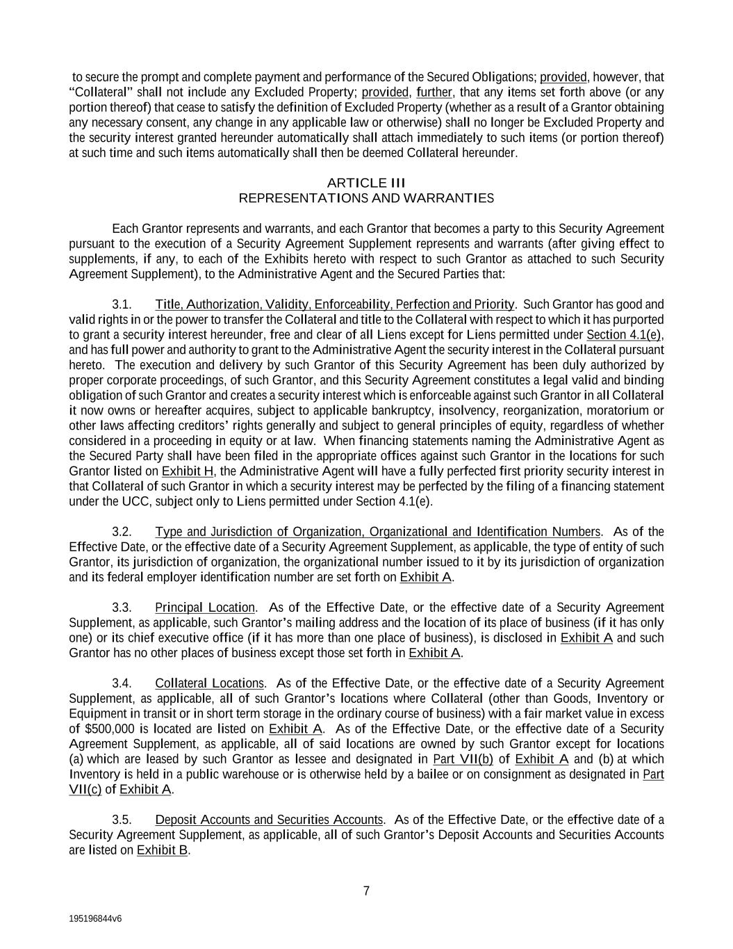 195196844v6 7 to secure the prompt and complete payment and performance of the Secured Obligations; provided, however, that “Collateral” shall not include any Excluded Property; provided, further, that any items set forth above (or any portion thereof) that cease to satisfy the definition of Excluded Property (whether as a result of a Grantor obtaining any necessary consent, any change in any applicable law or otherwise) shall no longer be Excluded Property and the security interest granted hereunder automatically shall attach immediately to such items (or portion thereof) at such time and such items automatically shall then be deemed Collateral hereunder. ARTICLE III REPRESENTATIONS AND WARRANTIES Each Grantor represents and warrants, and each Grantor that becomes a party to this Security Agreement pursuant to the execution of a Security Agreement Supplement represents and warrants (after giving effect to supplements, if any, to each of the Exhibits hereto with respect to such Grantor as attached to such Security Agreement Supplement), to the Administrative Agent and the Secured Parties that: 3.1. Title, Authorization, Validity, Enforceability, Perfection and Priority. Such Grantor has good and valid rights in or the power to transfer the Collateral and title to the Collateral with respect to which it has purported to grant a security interest hereunder, free and clear of all Liens except for Liens permitted under Section 4.1(e), and has full power and authority to grant to the Administrative Agent the security interest in the Collateral pursuant hereto. The execution and delivery by such Grantor of this Security Agreement has been duly authorized by proper corporate proceedings, of such Grantor, and this Security Agreement constitutes a legal valid and binding obligation of such Grantor and creates a security interest which is enforceable against such Grantor in all Collateral it now owns or hereafter acquires, subject to applicable bankruptcy, insolvency, reorganization, moratorium or other laws affecting creditors’ rights generally and subject to general principles of equity, regardless of whether considered in a proceeding in equity or at law. When financing statements naming the Administrative Agent as the Secured Party shall have been filed in the appropriate offices against such Grantor in the locations for such Grantor listed on Exhibit H, the Administrative Agent will have a fully perfected first priority security interest in that Collateral of such Grantor in which a security interest may be perfected by the filing of a financing statement under the UCC, subject only to Liens permitted under Section 4.1(e). 3.2. Type and Jurisdiction of Organization, Organizational and Identification Numbers. As of the Effective Date, or the effective date of a Security Agreement Supplement, as applicable, the type of entity of such Grantor, its jurisdiction of organization, the organizational number issued to it by its jurisdiction of organization and its federal employer identification number are set forth on Exhibit A. 3.3. Principal Location. As of the Effective Date, or the effective date of a Security Agreement Supplement, as applicable, such Grantor’s mailing address and the location of its place of business (if it has only one) or its chief executive office (if it has more than one place of business), is disclosed in Exhibit A and such Grantor has no other places of business except those set forth in Exhibit A. 3.4. Collateral Locations. As of the Effective Date, or the effective date of a Security Agreement Supplement, as applicable, all of such Grantor’s locations where Collateral (other than Goods, Inventory or Equipment in transit or in short term storage in the ordinary course of business) with a fair market value in excess of $500,000 is located are listed on Exhibit A. As of the Effective Date, or the effective date of a Security Agreement Supplement, as applicable, all of said locations are owned by such Grantor except for locations (a) which are leased by such Grantor as lessee and designated in Part VII(b) of Exhibit A and (b) at which Inventory is held in a public warehouse or is otherwise held by a bailee or on consignment as designated in Part VII(c) of Exhibit A. 3.5. Deposit Accounts and Securities Accounts. As of the Effective Date, or the effective date of a Security Agreement Supplement, as applicable, all of such Grantor’s Deposit Accounts and Securities Accounts are listed on Exhibit B.