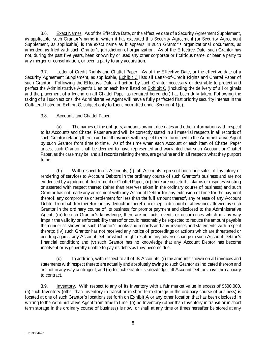195196844v6 8 3.6. Exact Names. As of the Effective Date, or the effective date of a Security Agreement Supplement, as applicable, such Grantor’s name in which it has executed this Security Agreement (or Security Agreement Supplement, as applicable) is the exact name as it appears in such Grantor’s organizational documents, as amended, as filed with such Grantor’s jurisdiction of organization. As of the Effective Date, such Grantor has not, during the past five years, been known by or used any other corporate or fictitious name, or been a party to any merger or consolidation, or been a party to any acquisition. 3.7. Letter-of-Credit Rights and Chattel Paper. As of the Effective Date, or the effective date of a Security Agreement Supplement, as applicable, Exhibit C lists all Letter-of-Credit Rights and Chattel Paper of such Grantor. Following the Effective Date, all action by such Grantor necessary or desirable to protect and perfect the Administrative Agent’s Lien on each item listed on Exhibit C (including the delivery of all originals and the placement of a legend on all Chattel Paper as required hereunder) has been duly taken. Following the taking of all such actions, the Administrative Agent will have a fully perfected first priority security interest in the Collateral listed on Exhibit C, subject only to Liens permitted under Section 4.1(e). 3.8. Accounts and Chattel Paper. (a) The names of the obligors, amounts owing, due dates and other information with respect to its Accounts and Chattel Paper are and will be correctly stated in all material respects in all records of such Grantor relating thereto and in all invoices with respect thereto furnished to the Administrative Agent by such Grantor from time to time. As of the time when each Account or each item of Chattel Paper arises, such Grantor shall be deemed to have represented and warranted that such Account or Chattel Paper, as the case may be, and all records relating thereto, are genuine and in all respects what they purport to be. (b) With respect to its Accounts, (i) all Accounts represent bona fide sales of Inventory or rendering of services to Account Debtors in the ordinary course of such Grantor’s business and are not evidenced by a judgment, Instrument or Chattel Paper; (ii) there are no setoffs, claims or disputes existing or asserted with respect thereto (other than reserves taken in the ordinary course of business) and such Grantor has not made any agreement with any Account Debtor for any extension of time for the payment thereof, any compromise or settlement for less than the full amount thereof, any release of any Account Debtor from liability therefor, or any deduction therefrom except a discount or allowance allowed by such Grantor in the ordinary course of its business for prompt payment and disclosed to the Administrative Agent; (iii) to such Grantor’s knowledge, there are no facts, events or occurrences which in any way impair the validity or enforceability thereof or could reasonably be expected to reduce the amount payable thereunder as shown on such Grantor’s books and records and any invoices and statements with respect thereto; (iv) such Grantor has not received any notice of proceedings or actions which are threatened or pending against any Account Debtor which might result in any adverse change in such Account Debtor’s financial condition; and (v) such Grantor has no knowledge that any Account Debtor has become insolvent or is generally unable to pay its debts as they become due. (c) In addition, with respect to all of its Accounts, (i) the amounts shown on all invoices and statements with respect thereto are actually and absolutely owing to such Grantor as indicated thereon and are not in any way contingent, and (ii) to such Grantor’s knowledge, all Account Debtors have the capacity to contract. 3.9. Inventory. With respect to any of its Inventory with a fair market value in excess of $500,000, (a) such Inventory (other than Inventory in transit or in short term storage in the ordinary course of business) is located at one of such Grantor’s locations set forth on Exhibit A or any other location that has been disclosed in writing to the Administrative Agent from time to time, (b) no Inventory (other than Inventory in transit or in short term storage in the ordinary course of business) is now, or shall at any time or times hereafter be stored at any