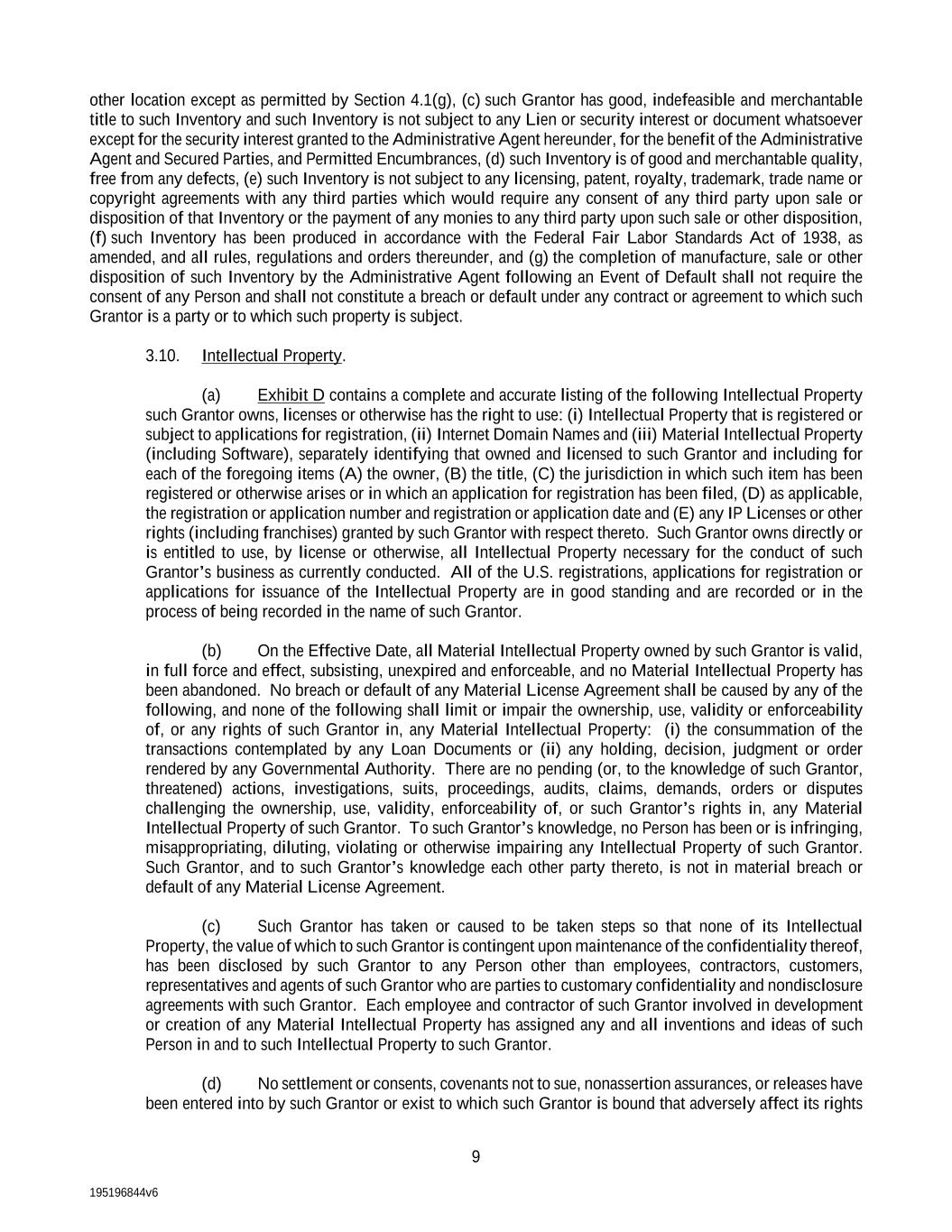 195196844v6 9 other location except as permitted by Section 4.1(g), (c) such Grantor has good, indefeasible and merchantable title to such Inventory and such Inventory is not subject to any Lien or security interest or document whatsoever except for the security interest granted to the Administrative Agent hereunder, for the benefit of the Administrative Agent and Secured Parties, and Permitted Encumbrances, (d) such Inventory is of good and merchantable quality, free from any defects, (e) such Inventory is not subject to any licensing, patent, royalty, trademark, trade name or copyright agreements with any third parties which would require any consent of any third party upon sale or disposition of that Inventory or the payment of any monies to any third party upon such sale or other disposition, (f) such Inventory has been produced in accordance with the Federal Fair Labor Standards Act of 1938, as amended, and all rules, regulations and orders thereunder, and (g) the completion of manufacture, sale or other disposition of such Inventory by the Administrative Agent following an Event of Default shall not require the consent of any Person and shall not constitute a breach or default under any contract or agreement to which such Grantor is a party or to which such property is subject. 3.10. Intellectual Property. (a) Exhibit D contains a complete and accurate listing of the following Intellectual Property such Grantor owns, licenses or otherwise has the right to use: (i) Intellectual Property that is registered or subject to applications for registration, (ii) Internet Domain Names and (iii) Material Intellectual Property (including Software), separately identifying that owned and licensed to such Grantor and including for each of the foregoing items (A) the owner, (B) the title, (C) the jurisdiction in which such item has been registered or otherwise arises or in which an application for registration has been filed, (D) as applicable, the registration or application number and registration or application date and (E) any IP Licenses or other rights (including franchises) granted by such Grantor with respect thereto. Such Grantor owns directly or is entitled to use, by license or otherwise, all Intellectual Property necessary for the conduct of such Grantor’s business as currently conducted. All of the U.S. registrations, applications for registration or applications for issuance of the Intellectual Property are in good standing and are recorded or in the process of being recorded in the name of such Grantor. (b) On the Effective Date, all Material Intellectual Property owned by such Grantor is valid, in full force and effect, subsisting, unexpired and enforceable, and no Material Intellectual Property has been abandoned. No breach or default of any Material License Agreement shall be caused by any of the following, and none of the following shall limit or impair the ownership, use, validity or enforceability of, or any rights of such Grantor in, any Material Intellectual Property: (i) the consummation of the transactions contemplated by any Loan Documents or (ii) any holding, decision, judgment or order rendered by any Governmental Authority. There are no pending (or, to the knowledge of such Grantor, threatened) actions, investigations, suits, proceedings, audits, claims, demands, orders or disputes challenging the ownership, use, validity, enforceability of, or such Grantor’s rights in, any Material Intellectual Property of such Grantor. To such Grantor’s knowledge, no Person has been or is infringing, misappropriating, diluting, violating or otherwise impairing any Intellectual Property of such Grantor. Such Grantor, and to such Grantor’s knowledge each other party thereto, is not in material breach or default of any Material License Agreement. (c) Such Grantor has taken or caused to be taken steps so that none of its Intellectual Property, the value of which to such Grantor is contingent upon maintenance of the confidentiality thereof, has been disclosed by such Grantor to any Person other than employees, contractors, customers, representatives and agents of such Grantor who are parties to customary confidentiality and nondisclosure agreements with such Grantor. Each employee and contractor of such Grantor involved in development or creation of any Material Intellectual Property has assigned any and all inventions and ideas of such Person in and to such Intellectual Property to such Grantor. (d) No settlement or consents, covenants not to sue, nonassertion assurances, or releases have been entered into by such Grantor or exist to which such Grantor is bound that adversely affect its rights