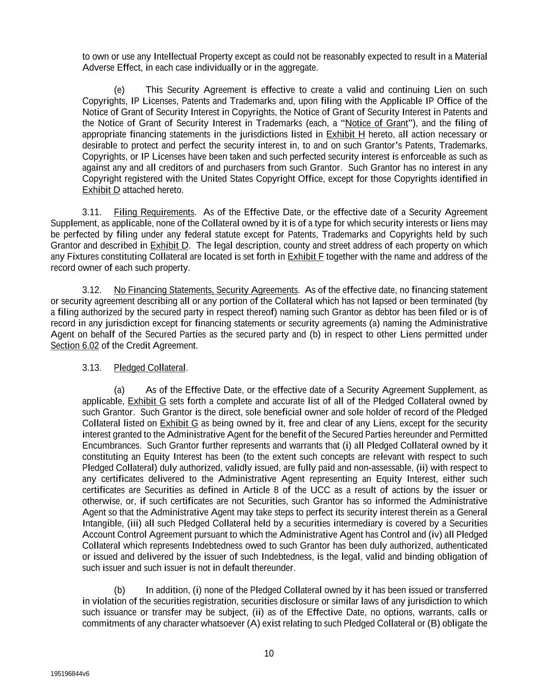 195196844v6 10 to own or use any Intellectual Property except as could not be reasonably expected to result in a Material Adverse Effect, in each case individually or in the aggregate. (e) This Security Agreement is effective to create a valid and continuing Lien on such Copyrights, IP Licenses, Patents and Trademarks and, upon filing with the Applicable IP Office of the Notice of Grant of Security Interest in Copyrights, the Notice of Grant of Security Interest in Patents and the Notice of Grant of Security Interest in Trademarks (each, a “Notice of Grant”), and the filing of appropriate financing statements in the jurisdictions listed in Exhibit H hereto, all action necessary or desirable to protect and perfect the security interest in, to and on such Grantor’s Patents, Trademarks, Copyrights, or IP Licenses have been taken and such perfected security interest is enforceable as such as against any and all creditors of and purchasers from such Grantor. Such Grantor has no interest in any Copyright registered with the United States Copyright Office, except for those Copyrights identified in Exhibit D attached hereto. 3.11. Filing Requirements. As of the Effective Date, or the effective date of a Security Agreement Supplement, as applicable, none of the Collateral owned by it is of a type for which security interests or liens may be perfected by filing under any federal statute except for Patents, Trademarks and Copyrights held by such Grantor and described in Exhibit D. The legal description, county and street address of each property on which any Fixtures constituting Collateral are located is set forth in Exhibit F together with the name and address of the record owner of each such property. 3.12. No Financing Statements, Security Agreements. As of the effective date, no financing statement or security agreement describing all or any portion of the Collateral which has not lapsed or been terminated (by a filing authorized by the secured party in respect thereof) naming such Grantor as debtor has been filed or is of record in any jurisdiction except for financing statements or security agreements (a) naming the Administrative Agent on behalf of the Secured Parties as the secured party and (b) in respect to other Liens permitted under Section 6.02 of the Credit Agreement. 3.13. Pledged Collateral. (a) As of the Effective Date, or the effective date of a Security Agreement Supplement, as applicable, Exhibit G sets forth a complete and accurate list of all of the Pledged Collateral owned by such Grantor. Such Grantor is the direct, sole beneficial owner and sole holder of record of the Pledged Collateral listed on Exhibit G as being owned by it, free and clear of any Liens, except for the security interest granted to the Administrative Agent for the benefit of the Secured Parties hereunder and Permitted Encumbrances. Such Grantor further represents and warrants that (i) all Pledged Collateral owned by it constituting an Equity Interest has been (to the extent such concepts are relevant with respect to such Pledged Collateral) duly authorized, validly issued, are fully paid and non-assessable, (ii) with respect to any certificates delivered to the Administrative Agent representing an Equity Interest, either such certificates are Securities as defined in Article 8 of the UCC as a result of actions by the issuer or otherwise, or, if such certificates are not Securities, such Grantor has so informed the Administrative Agent so that the Administrative Agent may take steps to perfect its security interest therein as a General Intangible, (iii) all such Pledged Collateral held by a securities intermediary is covered by a Securities Account Control Agreement pursuant to which the Administrative Agent has Control and (iv) all Pledged Collateral which represents Indebtedness owed to such Grantor has been duly authorized, authenticated or issued and delivered by the issuer of such Indebtedness, is the legal, valid and binding obligation of such issuer and such issuer is not in default thereunder. (b) In addition, (i) none of the Pledged Collateral owned by it has been issued or transferred in violation of the securities registration, securities disclosure or similar laws of any jurisdiction to which such issuance or transfer may be subject, (ii) as of the Effective Date, no options, warrants, calls or commitments of any character whatsoever (A) exist relating to such Pledged Collateral or (B) obligate the