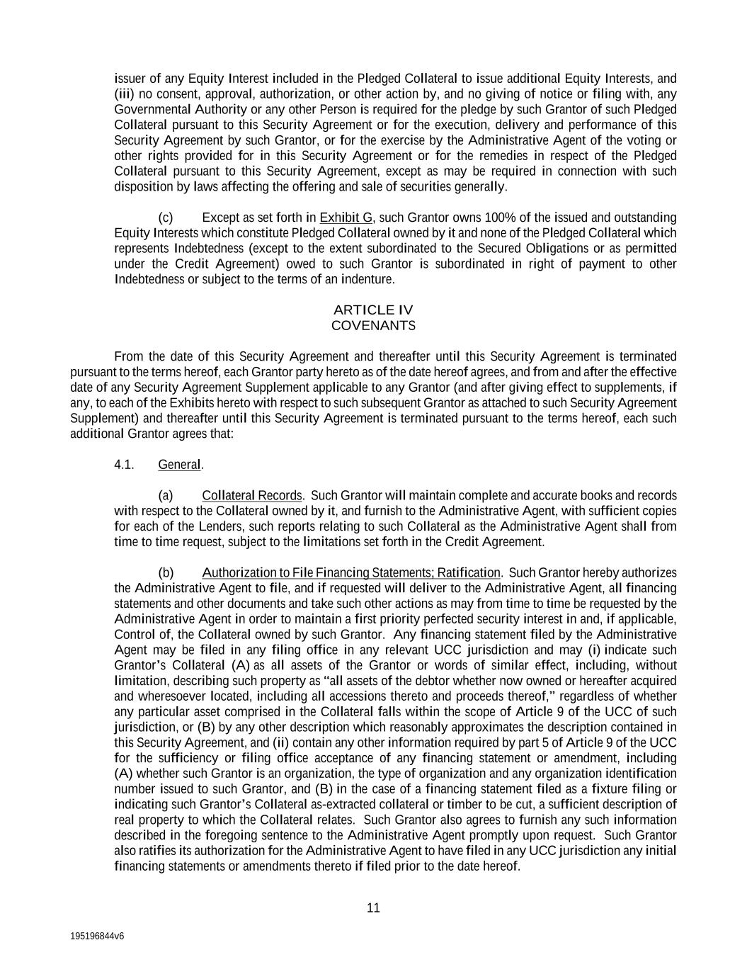 195196844v6 11 issuer of any Equity Interest included in the Pledged Collateral to issue additional Equity Interests, and (iii) no consent, approval, authorization, or other action by, and no giving of notice or filing with, any Governmental Authority or any other Person is required for the pledge by such Grantor of such Pledged Collateral pursuant to this Security Agreement or for the execution, delivery and performance of this Security Agreement by such Grantor, or for the exercise by the Administrative Agent of the voting or other rights provided for in this Security Agreement or for the remedies in respect of the Pledged Collateral pursuant to this Security Agreement, except as may be required in connection with such disposition by laws affecting the offering and sale of securities generally. (c) Except as set forth in Exhibit G, such Grantor owns 100% of the issued and outstanding Equity Interests which constitute Pledged Collateral owned by it and none of the Pledged Collateral which represents Indebtedness (except to the extent subordinated to the Secured Obligations or as permitted under the Credit Agreement) owed to such Grantor is subordinated in right of payment to other Indebtedness or subject to the terms of an indenture. ARTICLE IV COVENANTS From the date of this Security Agreement and thereafter until this Security Agreement is terminated pursuant to the terms hereof, each Grantor party hereto as of the date hereof agrees, and from and after the effective date of any Security Agreement Supplement applicable to any Grantor (and after giving effect to supplements, if any, to each of the Exhibits hereto with respect to such subsequent Grantor as attached to such Security Agreement Supplement) and thereafter until this Security Agreement is terminated pursuant to the terms hereof, each such additional Grantor agrees that: 4.1. General. (a) Collateral Records. Such Grantor will maintain complete and accurate books and records with respect to the Collateral owned by it, and furnish to the Administrative Agent, with sufficient copies for each of the Lenders, such reports relating to such Collateral as the Administrative Agent shall from time to time request, subject to the limitations set forth in the Credit Agreement. (b) Authorization to File Financing Statements; Ratification. Such Grantor hereby authorizes the Administrative Agent to file, and if requested will deliver to the Administrative Agent, all financing statements and other documents and take such other actions as may from time to time be requested by the Administrative Agent in order to maintain a first priority perfected security interest in and, if applicable, Control of, the Collateral owned by such Grantor. Any financing statement filed by the Administrative Agent may be filed in any filing office in any relevant UCC jurisdiction and may (i) indicate such Grantor’s Collateral (A) as all assets of the Grantor or words of similar effect, including, without limitation, describing such property as “all assets of the debtor whether now owned or hereafter acquired and wheresoever located, including all accessions thereto and proceeds thereof,” regardless of whether any particular asset comprised in the Collateral falls within the scope of Article 9 of the UCC of such jurisdiction, or (B) by any other description which reasonably approximates the description contained in this Security Agreement, and (ii) contain any other information required by part 5 of Article 9 of the UCC for the sufficiency or filing office acceptance of any financing statement or amendment, including (A) whether such Grantor is an organization, the type of organization and any organization identification number issued to such Grantor, and (B) in the case of a financing statement filed as a fixture filing or indicating such Grantor’s Collateral as-extracted collateral or timber to be cut, a sufficient description of real property to which the Collateral relates. Such Grantor also agrees to furnish any such information described in the foregoing sentence to the Administrative Agent promptly upon request. Such Grantor also ratifies its authorization for the Administrative Agent to have filed in any UCC jurisdiction any initial financing statements or amendments thereto if filed prior to the date hereof.