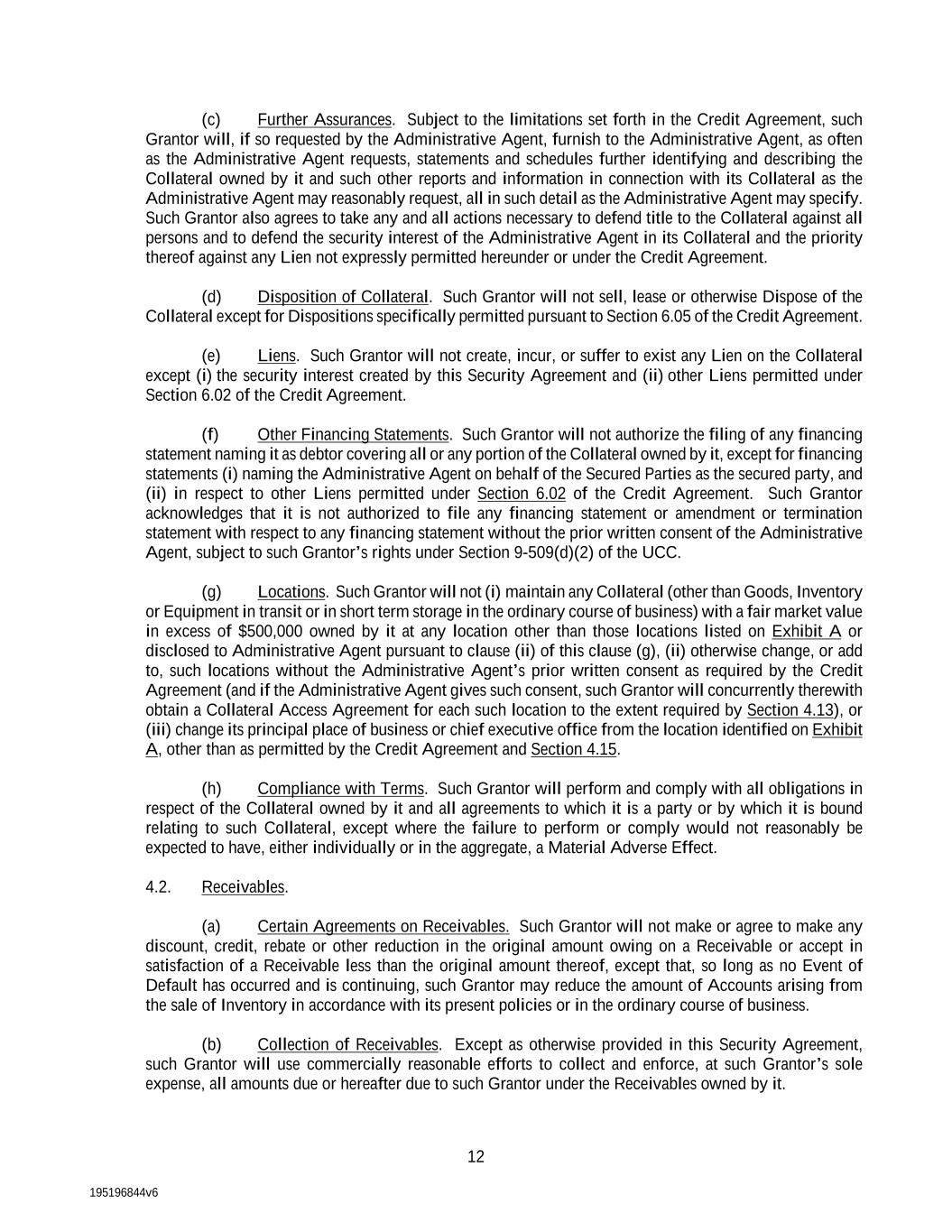 195196844v6 12 (c) Further Assurances. Subject to the limitations set forth in the Credit Agreement, such Grantor will, if so requested by the Administrative Agent, furnish to the Administrative Agent, as often as the Administrative Agent requests, statements and schedules further identifying and describing the Collateral owned by it and such other reports and information in connection with its Collateral as the Administrative Agent may reasonably request, all in such detail as the Administrative Agent may specify. Such Grantor also agrees to take any and all actions necessary to defend title to the Collateral against all persons and to defend the security interest of the Administrative Agent in its Collateral and the priority thereof against any Lien not expressly permitted hereunder or under the Credit Agreement. (d) Disposition of Collateral. Such Grantor will not sell, lease or otherwise Dispose of the Collateral except for Dispositions specifically permitted pursuant to Section 6.05 of the Credit Agreement. (e) Liens. Such Grantor will not create, incur, or suffer to exist any Lien on the Collateral except (i) the security interest created by this Security Agreement and (ii) other Liens permitted under Section 6.02 of the Credit Agreement. (f) Other Financing Statements. Such Grantor will not authorize the filing of any financing statement naming it as debtor covering all or any portion of the Collateral owned by it, except for financing statements (i) naming the Administrative Agent on behalf of the Secured Parties as the secured party, and (ii) in respect to other Liens permitted under Section 6.02 of the Credit Agreement. Such Grantor acknowledges that it is not authorized to file any financing statement or amendment or termination statement with respect to any financing statement without the prior written consent of the Administrative Agent, subject to such Grantor’s rights under Section 9-509(d)(2) of the UCC. (g) Locations. Such Grantor will not (i) maintain any Collateral (other than Goods, Inventory or Equipment in transit or in short term storage in the ordinary course of business) with a fair market value in excess of $500,000 owned by it at any location other than those locations listed on Exhibit A or disclosed to Administrative Agent pursuant to clause (ii) of this clause (g), (ii) otherwise change, or add to, such locations without the Administrative Agent’s prior written consent as required by the Credit Agreement (and if the Administrative Agent gives such consent, such Grantor will concurrently therewith obtain a Collateral Access Agreement for each such location to the extent required by Section 4.13), or (iii) change its principal place of business or chief executive office from the location identified on Exhibit A, other than as permitted by the Credit Agreement and Section 4.15. (h) Compliance with Terms. Such Grantor will perform and comply with all obligations in respect of the Collateral owned by it and all agreements to which it is a party or by which it is bound relating to such Collateral, except where the failure to perform or comply would not reasonably be expected to have, either individually or in the aggregate, a Material Adverse Effect. 4.2. Receivables. (a) Certain Agreements on Receivables. Such Grantor will not make or agree to make any discount, credit, rebate or other reduction in the original amount owing on a Receivable or accept in satisfaction of a Receivable less than the original amount thereof, except that, so long as no Event of Default has occurred and is continuing, such Grantor may reduce the amount of Accounts arising from the sale of Inventory in accordance with its present policies or in the ordinary course of business. (b) Collection of Receivables. Except as otherwise provided in this Security Agreement, such Grantor will use commercially reasonable efforts to collect and enforce, at such Grantor’s sole expense, all amounts due or hereafter due to such Grantor under the Receivables owned by it.