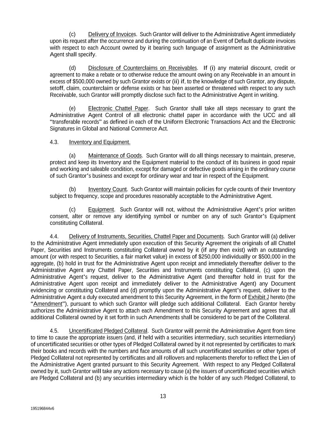 195196844v6 13 (c) Delivery of Invoices. Such Grantor will deliver to the Administrative Agent immediately upon its request after the occurrence and during the continuation of an Event of Default duplicate invoices with respect to each Account owned by it bearing such language of assignment as the Administrative Agent shall specify. (d) Disclosure of Counterclaims on Receivables. If (i) any material discount, credit or agreement to make a rebate or to otherwise reduce the amount owing on any Receivable in an amount in excess of $500,000 owned by such Grantor exists or (ii) if, to the knowledge of such Grantor, any dispute, setoff, claim, counterclaim or defense exists or has been asserted or threatened with respect to any such Receivable, such Grantor will promptly disclose such fact to the Administrative Agent in writing. (e) Electronic Chattel Paper. Such Grantor shall take all steps necessary to grant the Administrative Agent Control of all electronic chattel paper in accordance with the UCC and all “transferable records” as defined in each of the Uniform Electronic Transactions Act and the Electronic Signatures in Global and National Commerce Act. 4.3. Inventory and Equipment. (a) Maintenance of Goods. Such Grantor will do all things necessary to maintain, preserve, protect and keep its Inventory and the Equipment material to the conduct of its business in good repair and working and saleable condition, except for damaged or defective goods arising in the ordinary course of such Grantor’s business and except for ordinary wear and tear in respect of the Equipment. (b) Inventory Count. Such Grantor will maintain policies for cycle counts of their Inventory subject to frequency, scope and procedures reasonably acceptable to the Administrative Agent. (c) Equipment. Such Grantor will not, without the Administrative Agent’s prior written consent, alter or remove any identifying symbol or number on any of such Grantor’s Equipment constituting Collateral. 4.4. Delivery of Instruments, Securities, Chattel Paper and Documents. Such Grantor will (a) deliver to the Administrative Agent immediately upon execution of this Security Agreement the originals of all Chattel Paper, Securities and Instruments constituting Collateral owned by it (if any then exist) with an outstanding amount (or with respect to Securities, a fair market value) in excess of $250,000 individually or $500,000 in the aggregate, (b) hold in trust for the Administrative Agent upon receipt and immediately thereafter deliver to the Administrative Agent any Chattel Paper, Securities and Instruments constituting Collateral, (c) upon the Administrative Agent’s request, deliver to the Administrative Agent (and thereafter hold in trust for the Administrative Agent upon receipt and immediately deliver to the Administrative Agent) any Document evidencing or constituting Collateral and (d) promptly upon the Administrative Agent’s request, deliver to the Administrative Agent a duly executed amendment to this Security Agreement, in the form of Exhibit J hereto (the “Amendment”), pursuant to which such Grantor will pledge such additional Collateral. Each Grantor hereby authorizes the Administrative Agent to attach each Amendment to this Security Agreement and agrees that all additional Collateral owned by it set forth in such Amendments shall be considered to be part of the Collateral. 4.5. Uncertificated Pledged Collateral. Such Grantor will permit the Administrative Agent from time to time to cause the appropriate issuers (and, if held with a securities intermediary, such securities intermediary) of uncertificated securities or other types of Pledged Collateral owned by it not represented by certificates to mark their books and records with the numbers and face amounts of all such uncertificated securities or other types of Pledged Collateral not represented by certificates and all rollovers and replacements therefor to reflect the Lien of the Administrative Agent granted pursuant to this Security Agreement. With respect to any Pledged Collateral owned by it, such Grantor will take any actions necessary to cause (a) the issuers of uncertificated securities which are Pledged Collateral and (b) any securities intermediary which is the holder of any such Pledged Collateral, to