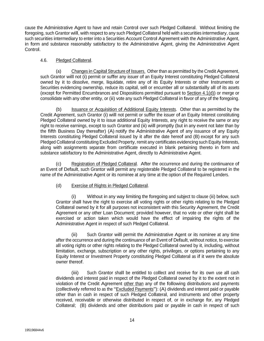 195196844v6 14 cause the Administrative Agent to have and retain Control over such Pledged Collateral. Without limiting the foregoing, such Grantor will, with respect to any such Pledged Collateral held with a securities intermediary, cause such securities intermediary to enter into a Securities Account Control Agreement with the Administrative Agent, in form and substance reasonably satisfactory to the Administrative Agent, giving the Administrative Agent Control. 4.6. Pledged Collateral. (a) Changes in Capital Structure of Issuers. Other than as permitted by the Credit Agreement, such Grantor will not (i) permit or suffer any issuer of an Equity Interest constituting Pledged Collateral owned by it to dissolve, merge, liquidate, retire any of its Equity Interests or other Instruments or Securities evidencing ownership, reduce its capital, sell or encumber all or substantially all of its assets (except for Permitted Encumbrances and Dispositions permitted pursuant to Section 4.1(d)) or merge or consolidate with any other entity, or (ii) vote any such Pledged Collateral in favor of any of the foregoing. (b) Issuance or Acquisition of Additional Equity Interests. Other than as permitted by the Credit Agreement, such Grantor (i) will not permit or suffer the issuer of an Equity Interest constituting Pledged Collateral owned by it to issue additional Equity Interests, any right to receive the same or any right to receive earnings, except to such Grantor and (ii) will promptly (but in any event not later than by the fifth Business Day thereafter) (A) notify the Administrative Agent of any issuance of any Equity Interests constituting Pledged Collateral issued by it after the date hereof and (B) except for any such Pledged Collateral constituting Excluded Property, remit any certificates evidencing such Equity Interests, along with assignments separate from certificate executed in blank pertaining thereto in form and substance satisfactory to the Administrative Agent, directly to Administrative Agent. (c) Registration of Pledged Collateral. After the occurrence and during the continuance of an Event of Default, such Grantor will permit any registerable Pledged Collateral to be registered in the name of the Administrative Agent or its nominee at any time at the option of the Required Lenders. (d) Exercise of Rights in Pledged Collateral. (i) Without in any way limiting the foregoing and subject to clause (ii) below, such Grantor shall have the right to exercise all voting rights or other rights relating to the Pledged Collateral owned by it for all purposes not inconsistent with this Security Agreement, the Credit Agreement or any other Loan Document; provided however, that no vote or other right shall be exercised or action taken which would have the effect of impairing the rights of the Administrative Agent in respect of such Pledged Collateral. (ii) Such Grantor will permit the Administrative Agent or its nominee at any time after the occurrence and during the continuance of an Event of Default, without notice, to exercise all voting rights or other rights relating to the Pledged Collateral owned by it, including, without limitation, exchange, subscription or any other rights, privileges, or options pertaining to any Equity Interest or Investment Property constituting Pledged Collateral as if it were the absolute owner thereof. (iii) Such Grantor shall be entitled to collect and receive for its own use all cash dividends and interest paid in respect of the Pledged Collateral owned by it to the extent not in violation of the Credit Agreement other than any of the following distributions and payments (collectively referred to as the “Excluded Payments”): (A) dividends and interest paid or payable other than in cash in respect of such Pledged Collateral, and instruments and other property received, receivable or otherwise distributed in respect of, or in exchange for, any Pledged Collateral; (B) dividends and other distributions paid or payable in cash in respect of such