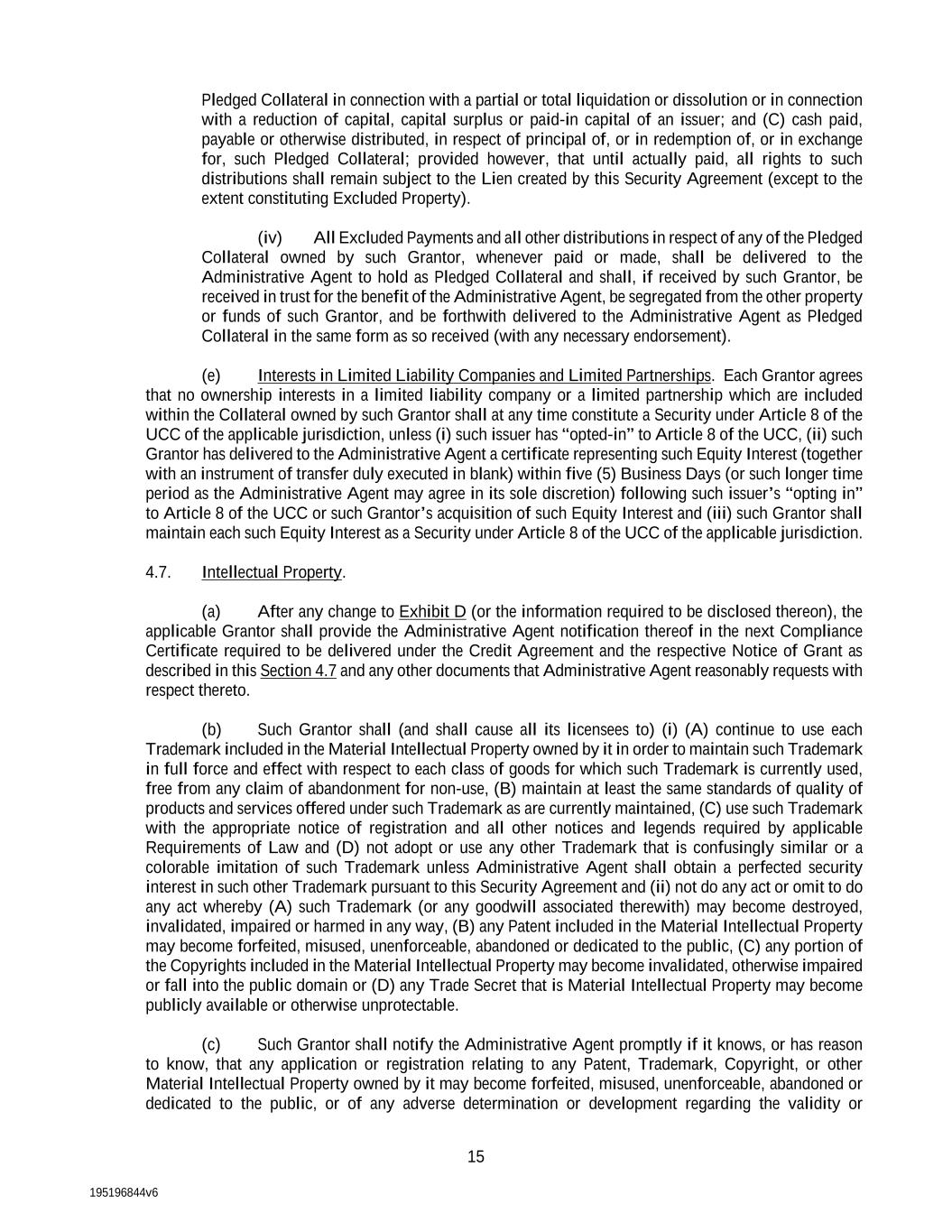 195196844v6 15 Pledged Collateral in connection with a partial or total liquidation or dissolution or in connection with a reduction of capital, capital surplus or paid-in capital of an issuer; and (C) cash paid, payable or otherwise distributed, in respect of principal of, or in redemption of, or in exchange for, such Pledged Collateral; provided however, that until actually paid, all rights to such distributions shall remain subject to the Lien created by this Security Agreement (except to the extent constituting Excluded Property). (iv) All Excluded Payments and all other distributions in respect of any of the Pledged Collateral owned by such Grantor, whenever paid or made, shall be delivered to the Administrative Agent to hold as Pledged Collateral and shall, if received by such Grantor, be received in trust for the benefit of the Administrative Agent, be segregated from the other property or funds of such Grantor, and be forthwith delivered to the Administrative Agent as Pledged Collateral in the same form as so received (with any necessary endorsement). (e) Interests in Limited Liability Companies and Limited Partnerships. Each Grantor agrees that no ownership interests in a limited liability company or a limited partnership which are included within the Collateral owned by such Grantor shall at any time constitute a Security under Article 8 of the UCC of the applicable jurisdiction, unless (i) such issuer has “opted-in” to Article 8 of the UCC, (ii) such Grantor has delivered to the Administrative Agent a certificate representing such Equity Interest (together with an instrument of transfer duly executed in blank) within five (5) Business Days (or such longer time period as the Administrative Agent may agree in its sole discretion) following such issuer’s “opting in” to Article 8 of the UCC or such Grantor’s acquisition of such Equity Interest and (iii) such Grantor shall maintain each such Equity Interest as a Security under Article 8 of the UCC of the applicable jurisdiction. 4.7. Intellectual Property. (a) After any change to Exhibit D (or the information required to be disclosed thereon), the applicable Grantor shall provide the Administrative Agent notification thereof in the next Compliance Certificate required to be delivered under the Credit Agreement and the respective Notice of Grant as described in this Section 4.7 and any other documents that Administrative Agent reasonably requests with respect thereto. (b) Such Grantor shall (and shall cause all its licensees to) (i) (A) continue to use each Trademark included in the Material Intellectual Property owned by it in order to maintain such Trademark in full force and effect with respect to each class of goods for which such Trademark is currently used, free from any claim of abandonment for non-use, (B) maintain at least the same standards of quality of products and services offered under such Trademark as are currently maintained, (C) use such Trademark with the appropriate notice of registration and all other notices and legends required by applicable Requirements of Law and (D) not adopt or use any other Trademark that is confusingly similar or a colorable imitation of such Trademark unless Administrative Agent shall obtain a perfected security interest in such other Trademark pursuant to this Security Agreement and (ii) not do any act or omit to do any act whereby (A) such Trademark (or any goodwill associated therewith) may become destroyed, invalidated, impaired or harmed in any way, (B) any Patent included in the Material Intellectual Property may become forfeited, misused, unenforceable, abandoned or dedicated to the public, (C) any portion of the Copyrights included in the Material Intellectual Property may become invalidated, otherwise impaired or fall into the public domain or (D) any Trade Secret that is Material Intellectual Property may become publicly available or otherwise unprotectable. (c) Such Grantor shall notify the Administrative Agent promptly if it knows, or has reason to know, that any application or registration relating to any Patent, Trademark, Copyright, or other Material Intellectual Property owned by it may become forfeited, misused, unenforceable, abandoned or dedicated to the public, or of any adverse determination or development regarding the validity or