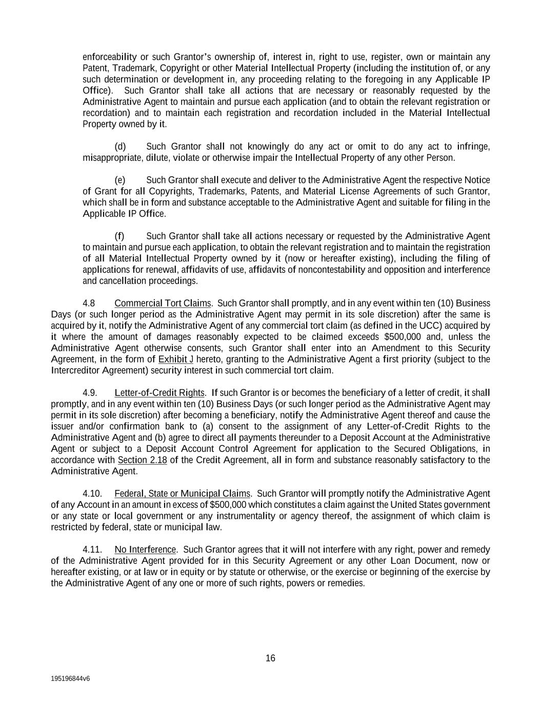 195196844v6 16 enforceability or such Grantor’s ownership of, interest in, right to use, register, own or maintain any Patent, Trademark, Copyright or other Material Intellectual Property (including the institution of, or any such determination or development in, any proceeding relating to the foregoing in any Applicable IP Office). Such Grantor shall take all actions that are necessary or reasonably requested by the Administrative Agent to maintain and pursue each application (and to obtain the relevant registration or recordation) and to maintain each registration and recordation included in the Material Intellectual Property owned by it. (d) Such Grantor shall not knowingly do any act or omit to do any act to infringe, misappropriate, dilute, violate or otherwise impair the Intellectual Property of any other Person. (e) Such Grantor shall execute and deliver to the Administrative Agent the respective Notice of Grant for all Copyrights, Trademarks, Patents, and Material License Agreements of such Grantor, which shall be in form and substance acceptable to the Administrative Agent and suitable for filing in the Applicable IP Office. (f) Such Grantor shall take all actions necessary or requested by the Administrative Agent to maintain and pursue each application, to obtain the relevant registration and to maintain the registration of all Material Intellectual Property owned by it (now or hereafter existing), including the filing of applications for renewal, affidavits of use, affidavits of noncontestability and opposition and interference and cancellation proceedings. 4.8 Commercial Tort Claims. Such Grantor shall promptly, and in any event within ten (10) Business Days (or such longer period as the Administrative Agent may permit in its sole discretion) after the same is acquired by it, notify the Administrative Agent of any commercial tort claim (as defined in the UCC) acquired by it where the amount of damages reasonably expected to be claimed exceeds $500,000 and, unless the Administrative Agent otherwise consents, such Grantor shall enter into an Amendment to this Security Agreement, in the form of Exhibit J hereto, granting to the Administrative Agent a first priority (subject to the Intercreditor Agreement) security interest in such commercial tort claim. 4.9. Letter-of-Credit Rights. If such Grantor is or becomes the beneficiary of a letter of credit, it shall promptly, and in any event within ten (10) Business Days (or such longer period as the Administrative Agent may permit in its sole discretion) after becoming a beneficiary, notify the Administrative Agent thereof and cause the issuer and/or confirmation bank to (a) consent to the assignment of any Letter-of-Credit Rights to the Administrative Agent and (b) agree to direct all payments thereunder to a Deposit Account at the Administrative Agent or subject to a Deposit Account Control Agreement for application to the Secured Obligations, in accordance with Section 2.18 of the Credit Agreement, all in form and substance reasonably satisfactory to the Administrative Agent. 4.10. Federal, State or Municipal Claims. Such Grantor will promptly notify the Administrative Agent of any Account in an amount in excess of $500,000 which constitutes a claim against the United States government or any state or local government or any instrumentality or agency thereof, the assignment of which claim is restricted by federal, state or municipal law. 4.11. No Interference. Such Grantor agrees that it will not interfere with any right, power and remedy of the Administrative Agent provided for in this Security Agreement or any other Loan Document, now or hereafter existing, or at law or in equity or by statute or otherwise, or the exercise or beginning of the exercise by the Administrative Agent of any one or more of such rights, powers or remedies.