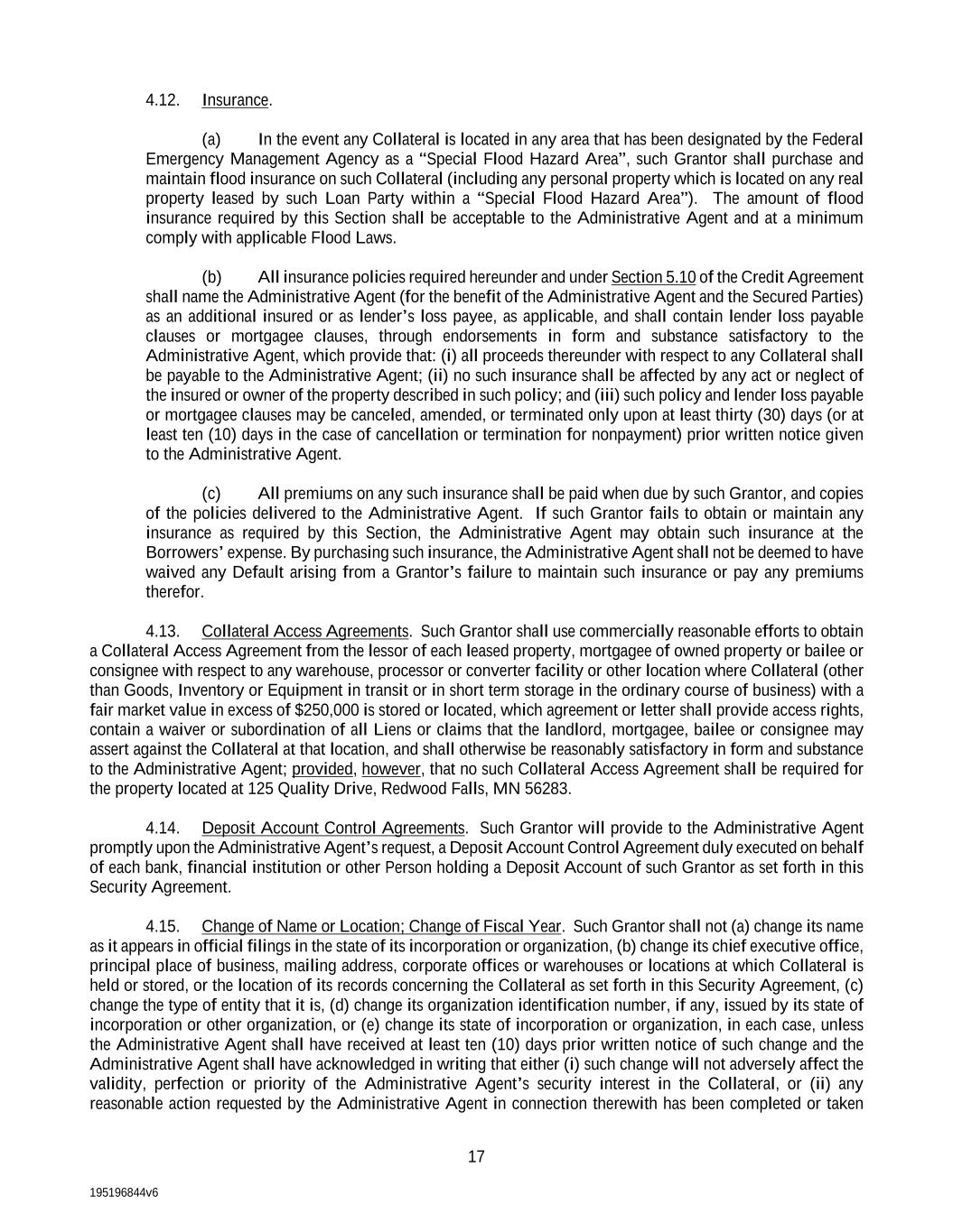 195196844v6 17 4.12. Insurance. (a) In the event any Collateral is located in any area that has been designated by the Federal Emergency Management Agency as a “Special Flood Hazard Area”, such Grantor shall purchase and maintain flood insurance on such Collateral (including any personal property which is located on any real property leased by such Loan Party within a “Special Flood Hazard Area”). The amount of flood insurance required by this Section shall be acceptable to the Administrative Agent and at a minimum comply with applicable Flood Laws. (b) All insurance policies required hereunder and under Section 5.10 of the Credit Agreement shall name the Administrative Agent (for the benefit of the Administrative Agent and the Secured Parties) as an additional insured or as lender’s loss payee, as applicable, and shall contain lender loss payable clauses or mortgagee clauses, through endorsements in form and substance satisfactory to the Administrative Agent, which provide that: (i) all proceeds thereunder with respect to any Collateral shall be payable to the Administrative Agent; (ii) no such insurance shall be affected by any act or neglect of the insured or owner of the property described in such policy; and (iii) such policy and lender loss payable or mortgagee clauses may be canceled, amended, or terminated only upon at least thirty (30) days (or at least ten (10) days in the case of cancellation or termination for nonpayment) prior written notice given to the Administrative Agent. (c) All premiums on any such insurance shall be paid when due by such Grantor, and copies of the policies delivered to the Administrative Agent. If such Grantor fails to obtain or maintain any insurance as required by this Section, the Administrative Agent may obtain such insurance at the Borrowers’ expense. By purchasing such insurance, the Administrative Agent shall not be deemed to have waived any Default arising from a Grantor’s failure to maintain such insurance or pay any premiums therefor. 4.13. Collateral Access Agreements. Such Grantor shall use commercially reasonable efforts to obtain a Collateral Access Agreement from the lessor of each leased property, mortgagee of owned property or bailee or consignee with respect to any warehouse, processor or converter facility or other location where Collateral (other than Goods, Inventory or Equipment in transit or in short term storage in the ordinary course of business) with a fair market value in excess of $250,000 is stored or located, which agreement or letter shall provide access rights, contain a waiver or subordination of all Liens or claims that the landlord, mortgagee, bailee or consignee may assert against the Collateral at that location, and shall otherwise be reasonably satisfactory in form and substance to the Administrative Agent; provided, however, that no such Collateral Access Agreement shall be required for the property located at 125 Quality Drive, Redwood Falls, MN 56283. 4.14. Deposit Account Control Agreements. Such Grantor will provide to the Administrative Agent promptly upon the Administrative Agent’s request, a Deposit Account Control Agreement duly executed on behalf of each bank, financial institution or other Person holding a Deposit Account of such Grantor as set forth in this Security Agreement. 4.15. Change of Name or Location; Change of Fiscal Year. Such Grantor shall not (a) change its name as it appears in official filings in the state of its incorporation or organization, (b) change its chief executive office, principal place of business, mailing address, corporate offices or warehouses or locations at which Collateral is held or stored, or the location of its records concerning the Collateral as set forth in this Security Agreement, (c) change the type of entity that it is, (d) change its organization identification number, if any, issued by its state of incorporation or other organization, or (e) change its state of incorporation or organization, in each case, unless the Administrative Agent shall have received at least ten (10) days prior written notice of such change and the Administrative Agent shall have acknowledged in writing that either (i) such change will not adversely affect the validity, perfection or priority of the Administrative Agent’s security interest in the Collateral, or (ii) any reasonable action requested by the Administrative Agent in connection therewith has been completed or taken
