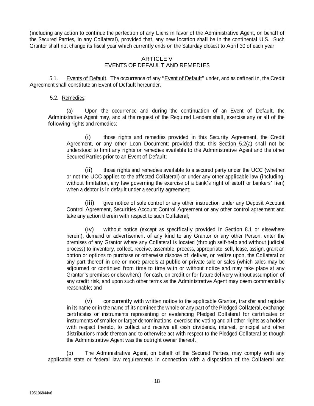 195196844v6 18 (including any action to continue the perfection of any Liens in favor of the Administrative Agent, on behalf of the Secured Parties, in any Collateral), provided that, any new location shall be in the continental U.S. Such Grantor shall not change its fiscal year which currently ends on the Saturday closest to April 30 of each year. ARTICLE V EVENTS OF DEFAULT AND REMEDIES 5.1. Events of Default. The occurrence of any “Event of Default” under, and as defined in, the Credit Agreement shall constitute an Event of Default hereunder. 5.2. Remedies. (a) Upon the occurrence and during the continuation of an Event of Default, the Administrative Agent may, and at the request of the Required Lenders shall, exercise any or all of the following rights and remedies: (i) those rights and remedies provided in this Security Agreement, the Credit Agreement, or any other Loan Document; provided that, this Section 5.2(a) shall not be understood to limit any rights or remedies available to the Administrative Agent and the other Secured Parties prior to an Event of Default; (ii) those rights and remedies available to a secured party under the UCC (whether or not the UCC applies to the affected Collateral) or under any other applicable law (including, without limitation, any law governing the exercise of a bank’s right of setoff or bankers’ lien) when a debtor is in default under a security agreement; (iii) give notice of sole control or any other instruction under any Deposit Account Control Agreement, Securities Account Control Agreement or any other control agreement and take any action therein with respect to such Collateral; (iv) without notice (except as specifically provided in Section 8.1 or elsewhere herein), demand or advertisement of any kind to any Grantor or any other Person, enter the premises of any Grantor where any Collateral is located (through self-help and without judicial process) to inventory, collect, receive, assemble, process, appropriate, sell, lease, assign, grant an option or options to purchase or otherwise dispose of, deliver, or realize upon, the Collateral or any part thereof in one or more parcels at public or private sale or sales (which sales may be adjourned or continued from time to time with or without notice and may take place at any Grantor’s premises or elsewhere), for cash, on credit or for future delivery without assumption of any credit risk, and upon such other terms as the Administrative Agent may deem commercially reasonable; and (v) concurrently with written notice to the applicable Grantor, transfer and register in its name or in the name of its nominee the whole or any part of the Pledged Collateral, exchange certificates or instruments representing or evidencing Pledged Collateral for certificates or instruments of smaller or larger denominations, exercise the voting and all other rights as a holder with respect thereto, to collect and receive all cash dividends, interest, principal and other distributions made thereon and to otherwise act with respect to the Pledged Collateral as though the Administrative Agent was the outright owner thereof. (b) The Administrative Agent, on behalf of the Secured Parties, may comply with any applicable state or federal law requirements in connection with a disposition of the Collateral and