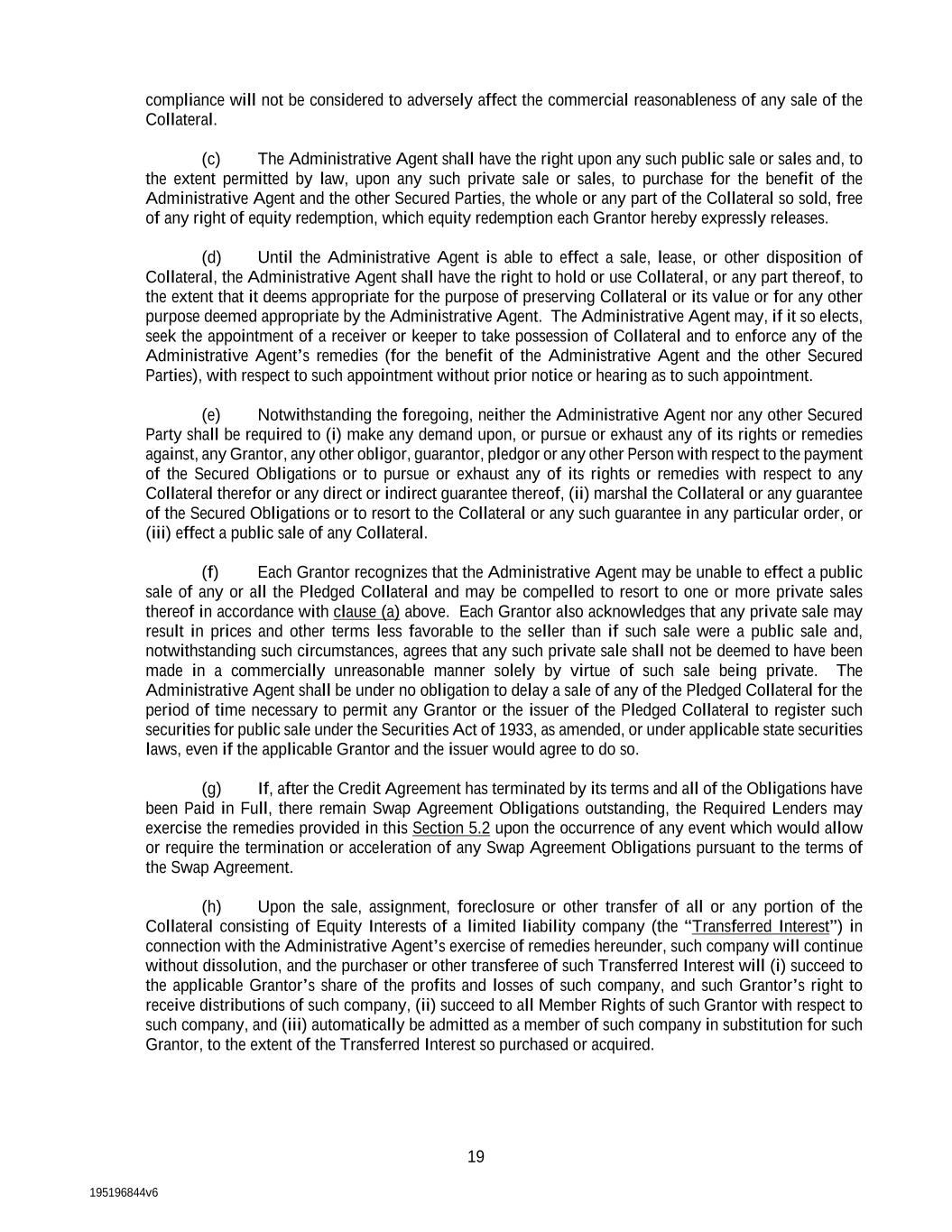 195196844v6 19 compliance will not be considered to adversely affect the commercial reasonableness of any sale of the Collateral. (c) The Administrative Agent shall have the right upon any such public sale or sales and, to the extent permitted by law, upon any such private sale or sales, to purchase for the benefit of the Administrative Agent and the other Secured Parties, the whole or any part of the Collateral so sold, free of any right of equity redemption, which equity redemption each Grantor hereby expressly releases. (d) Until the Administrative Agent is able to effect a sale, lease, or other disposition of Collateral, the Administrative Agent shall have the right to hold or use Collateral, or any part thereof, to the extent that it deems appropriate for the purpose of preserving Collateral or its value or for any other purpose deemed appropriate by the Administrative Agent. The Administrative Agent may, if it so elects, seek the appointment of a receiver or keeper to take possession of Collateral and to enforce any of the Administrative Agent’s remedies (for the benefit of the Administrative Agent and the other Secured Parties), with respect to such appointment without prior notice or hearing as to such appointment. (e) Notwithstanding the foregoing, neither the Administrative Agent nor any other Secured Party shall be required to (i) make any demand upon, or pursue or exhaust any of its rights or remedies against, any Grantor, any other obligor, guarantor, pledgor or any other Person with respect to the payment of the Secured Obligations or to pursue or exhaust any of its rights or remedies with respect to any Collateral therefor or any direct or indirect guarantee thereof, (ii) marshal the Collateral or any guarantee of the Secured Obligations or to resort to the Collateral or any such guarantee in any particular order, or (iii) effect a public sale of any Collateral. (f) Each Grantor recognizes that the Administrative Agent may be unable to effect a public sale of any or all the Pledged Collateral and may be compelled to resort to one or more private sales thereof in accordance with clause (a) above. Each Grantor also acknowledges that any private sale may result in prices and other terms less favorable to the seller than if such sale were a public sale and, notwithstanding such circumstances, agrees that any such private sale shall not be deemed to have been made in a commercially unreasonable manner solely by virtue of such sale being private. The Administrative Agent shall be under no obligation to delay a sale of any of the Pledged Collateral for the period of time necessary to permit any Grantor or the issuer of the Pledged Collateral to register such securities for public sale under the Securities Act of 1933, as amended, or under applicable state securities laws, even if the applicable Grantor and the issuer would agree to do so. (g) If, after the Credit Agreement has terminated by its terms and all of the Obligations have been Paid in Full, there remain Swap Agreement Obligations outstanding, the Required Lenders may exercise the remedies provided in this Section 5.2 upon the occurrence of any event which would allow or require the termination or acceleration of any Swap Agreement Obligations pursuant to the terms of the Swap Agreement. (h) Upon the sale, assignment, foreclosure or other transfer of all or any portion of the Collateral consisting of Equity Interests of a limited liability company (the “Transferred Interest”) in connection with the Administrative Agent’s exercise of remedies hereunder, such company will continue without dissolution, and the purchaser or other transferee of such Transferred Interest will (i) succeed to the applicable Grantor’s share of the profits and losses of such company, and such Grantor’s right to receive distributions of such company, (ii) succeed to all Member Rights of such Grantor with respect to such company, and (iii) automatically be admitted as a member of such company in substitution for such Grantor, to the extent of the Transferred Interest so purchased or acquired.