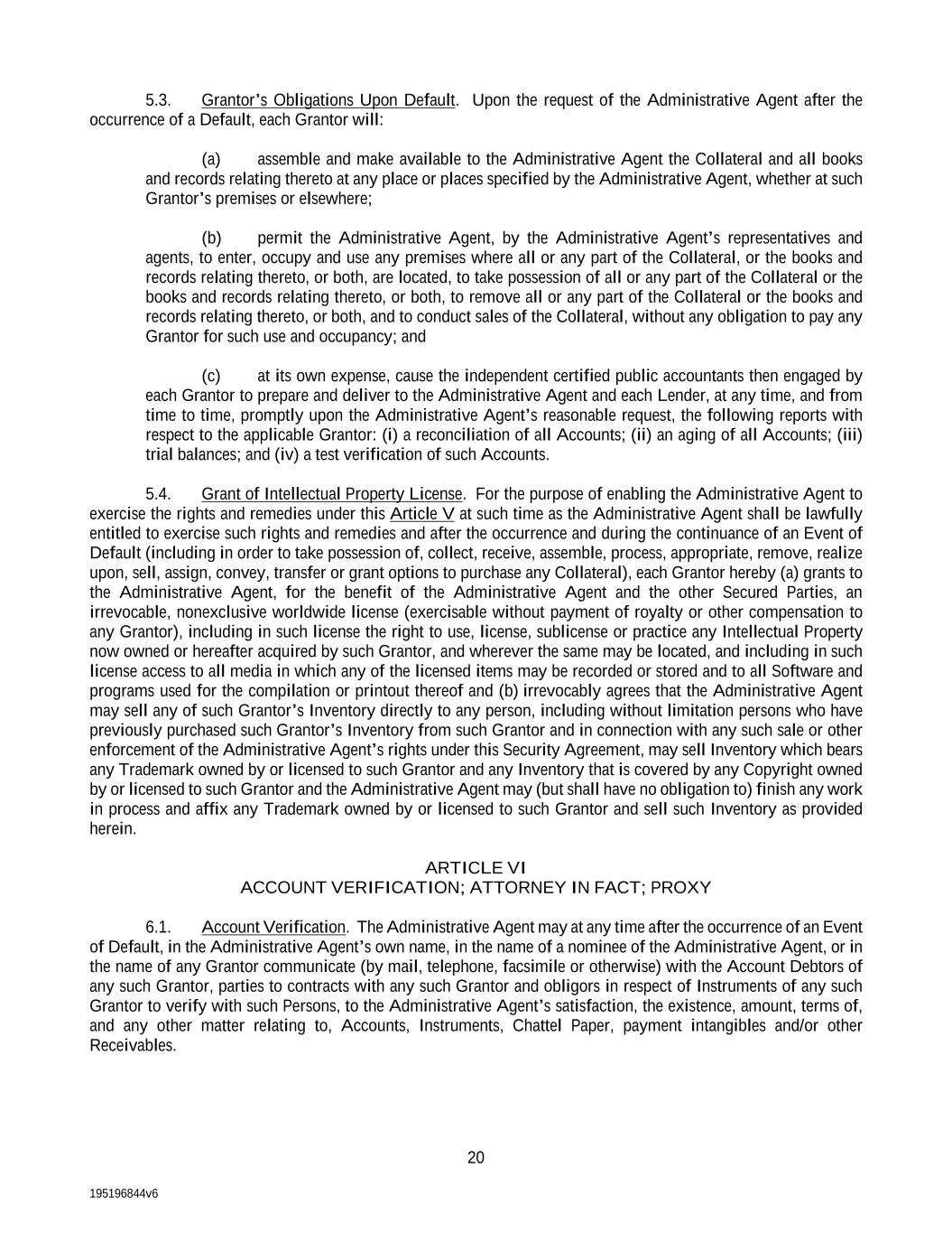 195196844v6 20 5.3. Grantor’s Obligations Upon Default. Upon the request of the Administrative Agent after the occurrence of a Default, each Grantor will: (a) assemble and make available to the Administrative Agent the Collateral and all books and records relating thereto at any place or places specified by the Administrative Agent, whether at such Grantor’s premises or elsewhere; (b) permit the Administrative Agent, by the Administrative Agent’s representatives and agents, to enter, occupy and use any premises where all or any part of the Collateral, or the books and records relating thereto, or both, are located, to take possession of all or any part of the Collateral or the books and records relating thereto, or both, to remove all or any part of the Collateral or the books and records relating thereto, or both, and to conduct sales of the Collateral, without any obligation to pay any Grantor for such use and occupancy; and (c) at its own expense, cause the independent certified public accountants then engaged by each Grantor to prepare and deliver to the Administrative Agent and each Lender, at any time, and from time to time, promptly upon the Administrative Agent’s reasonable request, the following reports with respect to the applicable Grantor: (i) a reconciliation of all Accounts; (ii) an aging of all Accounts; (iii) trial balances; and (iv) a test verification of such Accounts. 5.4. Grant of Intellectual Property License. For the purpose of enabling the Administrative Agent to exercise the rights and remedies under this Article V at such time as the Administrative Agent shall be lawfully entitled to exercise such rights and remedies and after the occurrence and during the continuance of an Event of Default (including in order to take possession of, collect, receive, assemble, process, appropriate, remove, realize upon, sell, assign, convey, transfer or grant options to purchase any Collateral), each Grantor hereby (a) grants to the Administrative Agent, for the benefit of the Administrative Agent and the other Secured Parties, an irrevocable, nonexclusive worldwide license (exercisable without payment of royalty or other compensation to any Grantor), including in such license the right to use, license, sublicense or practice any Intellectual Property now owned or hereafter acquired by such Grantor, and wherever the same may be located, and including in such license access to all media in which any of the licensed items may be recorded or stored and to all Software and programs used for the compilation or printout thereof and (b) irrevocably agrees that the Administrative Agent may sell any of such Grantor’s Inventory directly to any person, including without limitation persons who have previously purchased such Grantor’s Inventory from such Grantor and in connection with any such sale or other enforcement of the Administrative Agent’s rights under this Security Agreement, may sell Inventory which bears any Trademark owned by or licensed to such Grantor and any Inventory that is covered by any Copyright owned by or licensed to such Grantor and the Administrative Agent may (but shall have no obligation to) finish any work in process and affix any Trademark owned by or licensed to such Grantor and sell such Inventory as provided herein. ARTICLE VI ACCOUNT VERIFICATION; ATTORNEY IN FACT; PROXY 6.1. Account Verification. The Administrative Agent may at any time after the occurrence of an Event of Default, in the Administrative Agent’s own name, in the name of a nominee of the Administrative Agent, or in the name of any Grantor communicate (by mail, telephone, facsimile or otherwise) with the Account Debtors of any such Grantor, parties to contracts with any such Grantor and obligors in respect of Instruments of any such Grantor to verify with such Persons, to the Administrative Agent’s satisfaction, the existence, amount, terms of, and any other matter relating to, Accounts, Instruments, Chattel Paper, payment intangibles and/or other Receivables.