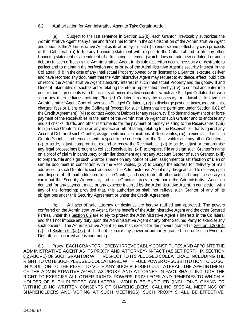 195196844v6 21 6.2. Authorization for Administrative Agent to Take Certain Action. (a) Subject to the last sentence in Section 6.2(b), each Grantor irrevocably authorizes the Administrative Agent at any time and from time to time in the sole discretion of the Administrative Agent and appoints the Administrative Agent as its attorney-in-fact (i) to endorse and collect any cash proceeds of the Collateral, (ii) to file any financing statement with respect to the Collateral and to file any other financing statement or amendment of a financing statement (which does not add new collateral or add a debtor) in such offices as the Administrative Agent in its sole discretion deems necessary or desirable to perfect and to maintain the perfection and priority of the Administrative Agent’s security interest in the Collateral, (iii) in the case of any Intellectual Property owned by or licensed to a Grantor, execute, deliver and have recorded any document that the Administrative Agent may request to evidence, effect, publicize or record the Administrative Agent’s security interest in such Intellectual Property and the goodwill and General Intangibles of such Grantor relating thereto or represented thereby, (iv) to contact and enter into one or more agreements with the issuers of uncertificated securities which are Pledged Collateral or with securities intermediaries holding Pledged Collateral as may be necessary or advisable to give the Administrative Agent Control over such Pledged Collateral, (v) to discharge past due taxes, assessments, charges, fees or Liens on the Collateral (except for such Liens that are permitted under Section 6.02 of the Credit Agreement), (vi) to contact Account Debtors for any reason, (vii) to demand payment or enforce payment of the Receivables in the name of the Administrative Agent or such Grantor and to endorse any and all checks, drafts, and other instruments for the payment of money relating to the Receivables, (viii) to sign such Grantor’s name on any invoice or bill of lading relating to the Receivables, drafts against any Account Debtor of such Grantor, assignments and verifications of Receivables, (ix) to exercise all of such Grantor’s rights and remedies with respect to the collection of the Receivables and any other Collateral, (x) to settle, adjust, compromise, extend or renew the Receivables, (xi) to settle, adjust or compromise any legal proceedings brought to collect Receivables, (xii) to prepare, file and sign such Grantor’s name on a proof of claim in bankruptcy or similar document against any Account Debtor of such Grantor, (xiii) to prepare, file and sign such Grantor’s name on any notice of Lien, assignment or satisfaction of Lien or similar document in connection with the Receivables, (xiv) to change the address for delivery of mail addressed to such Grantor to such address as the Administrative Agent may designate and to receive, open and dispose of all mail addressed to such Grantor, and (xv) to do all other acts and things necessary to carry out this Security Agreement; and such Grantor agrees to reimburse the Administrative Agent on demand for any payment made or any expense incurred by the Administrative Agent in connection with any of the foregoing; provided that, this authorization shall not relieve such Grantor of any of its obligations under this Security Agreement or under the Credit Agreement. (b) All acts of said attorney or designee are hereby ratified and approved. The powers conferred on the Administrative Agent, for the benefit of the Administrative Agent and the other Secured Parties, under this Section 6.2 are solely to protect the Administrative Agent’s interests in the Collateral and shall not impose any duty upon the Administrative Agent or any other Secured Party to exercise any such powers. The Administrative Agent agrees that, except for the powers granted in Section 6.2(a)(i)- (v) and Section 6.2(a)(xv), it shall not exercise any power or authority granted to it unless an Event of Default has occurred and is continuing. 6.3. Proxy. EACH GRANTOR HEREBY IRREVOCABLY CONSTITUTES AND APPOINTS THE ADMINISTRATIVE AGENT AS ITS PROXY AND ATTORNEY-IN-FACT (AS SET FORTH IN SECTION 6.2 ABOVE) OF SUCH GRANTOR WITH RESPECT TO ITS PLEDGED COLLATERAL, INCLUDING THE RIGHT TO VOTE SUCH PLEDGED COLLATERAL, WITH FULL POWER OF SUBSTITUTION TO DO SO. IN ADDITION TO THE RIGHT TO VOTE ANY SUCH PLEDGED COLLATERAL, THE APPOINTMENT OF THE ADMINISTRATIVE AGENT AS PROXY AND ATTORNEY-IN-FACT SHALL INCLUDE THE RIGHT TO EXERCISE ALL OTHER RIGHTS, POWERS, PRIVILEGES AND REMEDIES TO WHICH A HOLDER OF SUCH PLEDGED COLLATERAL WOULD BE ENTITLED (INCLUDING GIVING OR WITHHOLDING WRITTEN CONSENTS OF SHAREHOLDERS, CALLING SPECIAL MEETINGS OF SHAREHOLDERS AND VOTING AT SUCH MEETINGS). SUCH PROXY SHALL BE EFFECTIVE,