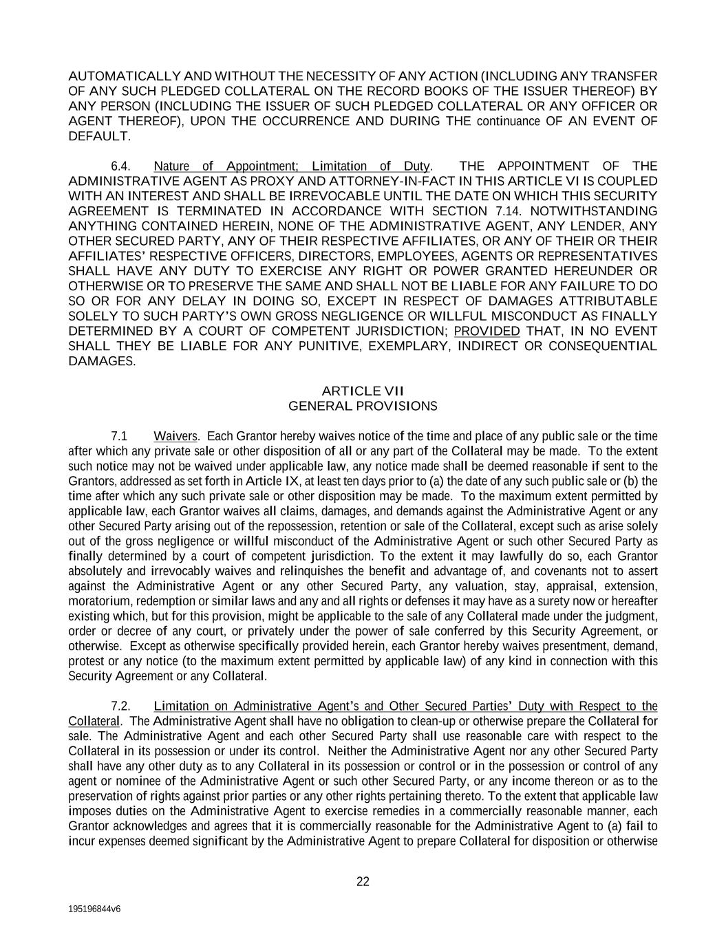 195196844v6 22 AUTOMATICALLY AND WITHOUT THE NECESSITY OF ANY ACTION (INCLUDING ANY TRANSFER OF ANY SUCH PLEDGED COLLATERAL ON THE RECORD BOOKS OF THE ISSUER THEREOF) BY ANY PERSON (INCLUDING THE ISSUER OF SUCH PLEDGED COLLATERAL OR ANY OFFICER OR AGENT THEREOF), UPON THE OCCURRENCE AND DURING THE continuance OF AN EVENT OF DEFAULT. 6.4. Nature of Appointment; Limitation of Duty. THE APPOINTMENT OF THE ADMINISTRATIVE AGENT AS PROXY AND ATTORNEY-IN-FACT IN THIS ARTICLE VI IS COUPLED WITH AN INTEREST AND SHALL BE IRREVOCABLE UNTIL THE DATE ON WHICH THIS SECURITY AGREEMENT IS TERMINATED IN ACCORDANCE WITH SECTION 7.14. NOTWITHSTANDING ANYTHING CONTAINED HEREIN, NONE OF THE ADMINISTRATIVE AGENT, ANY LENDER, ANY OTHER SECURED PARTY, ANY OF THEIR RESPECTIVE AFFILIATES, OR ANY OF THEIR OR THEIR AFFILIATES’ RESPECTIVE OFFICERS, DIRECTORS, EMPLOYEES, AGENTS OR REPRESENTATIVES SHALL HAVE ANY DUTY TO EXERCISE ANY RIGHT OR POWER GRANTED HEREUNDER OR OTHERWISE OR TO PRESERVE THE SAME AND SHALL NOT BE LIABLE FOR ANY FAILURE TO DO SO OR FOR ANY DELAY IN DOING SO, EXCEPT IN RESPECT OF DAMAGES ATTRIBUTABLE SOLELY TO SUCH PARTY’S OWN GROSS NEGLIGENCE OR WILLFUL MISCONDUCT AS FINALLY DETERMINED BY A COURT OF COMPETENT JURISDICTION; PROVIDED THAT, IN NO EVENT SHALL THEY BE LIABLE FOR ANY PUNITIVE, EXEMPLARY, INDIRECT OR CONSEQUENTIAL DAMAGES. ARTICLE VII GENERAL PROVISIONS 7.1 Waivers. Each Grantor hereby waives notice of the time and place of any public sale or the time after which any private sale or other disposition of all or any part of the Collateral may be made. To the extent such notice may not be waived under applicable law, any notice made shall be deemed reasonable if sent to the Grantors, addressed as set forth in Article IX, at least ten days prior to (a) the date of any such public sale or (b) the time after which any such private sale or other disposition may be made. To the maximum extent permitted by applicable law, each Grantor waives all claims, damages, and demands against the Administrative Agent or any other Secured Party arising out of the repossession, retention or sale of the Collateral, except such as arise solely out of the gross negligence or willful misconduct of the Administrative Agent or such other Secured Party as finally determined by a court of competent jurisdiction. To the extent it may lawfully do so, each Grantor absolutely and irrevocably waives and relinquishes the benefit and advantage of, and covenants not to assert against the Administrative Agent or any other Secured Party, any valuation, stay, appraisal, extension, moratorium, redemption or similar laws and any and all rights or defenses it may have as a surety now or hereafter existing which, but for this provision, might be applicable to the sale of any Collateral made under the judgment, order or decree of any court, or privately under the power of sale conferred by this Security Agreement, or otherwise. Except as otherwise specifically provided herein, each Grantor hereby waives presentment, demand, protest or any notice (to the maximum extent permitted by applicable law) of any kind in connection with this Security Agreement or any Collateral. 7.2. Limitation on Administrative Agent’s and Other Secured Parties’ Duty with Respect to the Collateral. The Administrative Agent shall have no obligation to clean-up or otherwise prepare the Collateral for sale. The Administrative Agent and each other Secured Party shall use reasonable care with respect to the Collateral in its possession or under its control. Neither the Administrative Agent nor any other Secured Party shall have any other duty as to any Collateral in its possession or control or in the possession or control of any agent or nominee of the Administrative Agent or such other Secured Party, or any income thereon or as to the preservation of rights against prior parties or any other rights pertaining thereto. To the extent that applicable law imposes duties on the Administrative Agent to exercise remedies in a commercially reasonable manner, each Grantor acknowledges and agrees that it is commercially reasonable for the Administrative Agent to (a) fail to incur expenses deemed significant by the Administrative Agent to prepare Collateral for disposition or otherwise