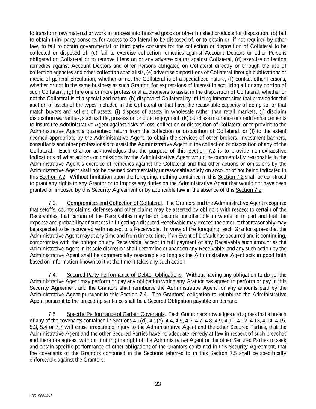 195196844v6 23 to transform raw material or work in process into finished goods or other finished products for disposition, (b) fail to obtain third party consents for access to Collateral to be disposed of, or to obtain or, if not required by other law, to fail to obtain governmental or third party consents for the collection or disposition of Collateral to be collected or disposed of, (c) fail to exercise collection remedies against Account Debtors or other Persons obligated on Collateral or to remove Liens on or any adverse claims against Collateral, (d) exercise collection remedies against Account Debtors and other Persons obligated on Collateral directly or through the use of collection agencies and other collection specialists, (e) advertise dispositions of Collateral through publications or media of general circulation, whether or not the Collateral is of a specialized nature, (f) contact other Persons, whether or not in the same business as such Grantor, for expressions of interest in acquiring all or any portion of such Collateral, (g) hire one or more professional auctioneers to assist in the disposition of Collateral, whether or not the Collateral is of a specialized nature, (h) dispose of Collateral by utilizing internet sites that provide for the auction of assets of the types included in the Collateral or that have the reasonable capacity of doing so, or that match buyers and sellers of assets, (i) dispose of assets in wholesale rather than retail markets, (j) disclaim disposition warranties, such as title, possession or quiet enjoyment, (k) purchase insurance or credit enhancements to insure the Administrative Agent against risks of loss, collection or disposition of Collateral or to provide to the Administrative Agent a guaranteed return from the collection or disposition of Collateral, or (l) to the extent deemed appropriate by the Administrative Agent, to obtain the services of other brokers, investment bankers, consultants and other professionals to assist the Administrative Agent in the collection or disposition of any of the Collateral. Each Grantor acknowledges that the purpose of this Section 7.2 is to provide non-exhaustive indications of what actions or omissions by the Administrative Agent would be commercially reasonable in the Administrative Agent’s exercise of remedies against the Collateral and that other actions or omissions by the Administrative Agent shall not be deemed commercially unreasonable solely on account of not being indicated in this Section 7.2. Without limitation upon the foregoing, nothing contained in this Section 7.2 shall be construed to grant any rights to any Grantor or to impose any duties on the Administrative Agent that would not have been granted or imposed by this Security Agreement or by applicable law in the absence of this Section 7.2. 7.3. Compromises and Collection of Collateral. The Grantors and the Administrative Agent recognize that setoffs, counterclaims, defenses and other claims may be asserted by obligors with respect to certain of the Receivables, that certain of the Receivables may be or become uncollectible in whole or in part and that the expense and probability of success in litigating a disputed Receivable may exceed the amount that reasonably may be expected to be recovered with respect to a Receivable. In view of the foregoing, each Grantor agrees that the Administrative Agent may at any time and from time to time, if an Event of Default has occurred and is continuing, compromise with the obligor on any Receivable, accept in full payment of any Receivable such amount as the Administrative Agent in its sole discretion shall determine or abandon any Receivable, and any such action by the Administrative Agent shall be commercially reasonable so long as the Administrative Agent acts in good faith based on information known to it at the time it takes any such action. 7.4. Secured Party Performance of Debtor Obligations. Without having any obligation to do so, the Administrative Agent may perform or pay any obligation which any Grantor has agreed to perform or pay in this Security Agreement and the Grantors shall reimburse the Administrative Agent for any amounts paid by the Administrative Agent pursuant to this Section 7.4. The Grantors’ obligation to reimburse the Administrative Agent pursuant to the preceding sentence shall be a Secured Obligation payable on demand. 7.5 Specific Performance of Certain Covenants. Each Grantor acknowledges and agrees that a breach of any of the covenants contained in Sections 4.1(d), 4.1(e), 4.4, 4.5, 4.6, 4.7, 4.8, 4.9, 4.10, 4.12, 4.13, 4.14, 4.15, 5.3, 5.4 or 7.7 will cause irreparable injury to the Administrative Agent and the other Secured Parties, that the Administrative Agent and the other Secured Parties have no adequate remedy at law in respect of such breaches and therefore agrees, without limiting the right of the Administrative Agent or the other Secured Parties to seek and obtain specific performance of other obligations of the Grantors contained in this Security Agreement, that the covenants of the Grantors contained in the Sections referred to in this Section 7.5 shall be specifically enforceable against the Grantors.