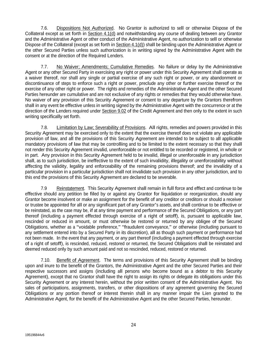 195196844v6 24 7.6. Dispositions Not Authorized. No Grantor is authorized to sell or otherwise Dispose of the Collateral except as set forth in Section 4.1(d) and notwithstanding any course of dealing between any Grantor and the Administrative Agent or other conduct of the Administrative Agent, no authorization to sell or otherwise Dispose of the Collateral (except as set forth in Section 4.1(d)) shall be binding upon the Administrative Agent or the other Secured Parties unless such authorization is in writing signed by the Administrative Agent with the consent or at the direction of the Required Lenders. 7.7. No Waiver; Amendments; Cumulative Remedies. No failure or delay by the Administrative Agent or any other Secured Party in exercising any right or power under this Security Agreement shall operate as a waiver thereof, nor shall any single or partial exercise of any such right or power, or any abandonment or discontinuance of steps to enforce such a right or power, preclude any other or further exercise thereof or the exercise of any other right or power. The rights and remedies of the Administrative Agent and the other Secured Parties hereunder are cumulative and are not exclusive of any rights or remedies that they would otherwise have. No waiver of any provision of this Security Agreement or consent to any departure by the Grantors therefrom shall in any event be effective unless in writing signed by the Administrative Agent with the concurrence or at the direction of the Lenders required under Section 9.02 of the Credit Agreement and then only to the extent in such writing specifically set forth. 7.8. Limitation by Law; Severability of Provisions. All rights, remedies and powers provided in this Security Agreement may be exercised only to the extent that the exercise thereof does not violate any applicable provision of law, and all the provisions of this Security Agreement are intended to be subject to all applicable mandatory provisions of law that may be controlling and to be limited to the extent necessary so that they shall not render this Security Agreement invalid, unenforceable or not entitled to be recorded or registered, in whole or in part. Any provision in this Security Agreement held to be invalid, illegal or unenforceable in any jurisdiction shall, as to such jurisdiction, be ineffective to the extent of such invalidity, illegality or unenforceability without affecting the validity, legality and enforceability of the remaining provisions thereof; and the invalidity of a particular provision in a particular jurisdiction shall not invalidate such provision in any other jurisdiction, and to this end the provisions of this Security Agreement are declared to be severable. 7.9 Reinstatement. This Security Agreement shall remain in full force and effect and continue to be effective should any petition be filed by or against any Grantor for liquidation or reorganization, should any Grantor become insolvent or make an assignment for the benefit of any creditor or creditors or should a receiver or trustee be appointed for all or any significant part of any Grantor’s assets, and shall continue to be effective or be reinstated, as the case may be, if at any time payment and performance of the Secured Obligations, or any part thereof (including a payment effected through exercise of a right of setoff), is, pursuant to applicable law, rescinded or reduced in amount, or must otherwise be restored or returned by any obligee of the Secured Obligations, whether as a “voidable preference,” “fraudulent conveyance,” or otherwise (including pursuant to any settlement entered into by a Secured Party in its discretion), all as though such payment or performance had not been made. In the event that any payment, or any part thereof (including a payment effected through exercise of a right of setoff), is rescinded, reduced, restored or returned, the Secured Obligations shall be reinstated and deemed reduced only by such amount paid and not so rescinded, reduced, restored or returned. 7.10. Benefit of Agreement. The terms and provisions of this Security Agreement shall be binding upon and inure to the benefit of the Grantors, the Administrative Agent and the other Secured Parties and their respective successors and assigns (including all persons who become bound as a debtor to this Security Agreement), except that no Grantor shall have the right to assign its rights or delegate its obligations under this Security Agreement or any interest herein, without the prior written consent of the Administrative Agent. No sales of participations, assignments, transfers, or other dispositions of any agreement governing the Secured Obligations or any portion thereof or interest therein shall in any manner impair the Lien granted to the Administrative Agent, for the benefit of the Administrative Agent and the other Secured Parties, hereunder.