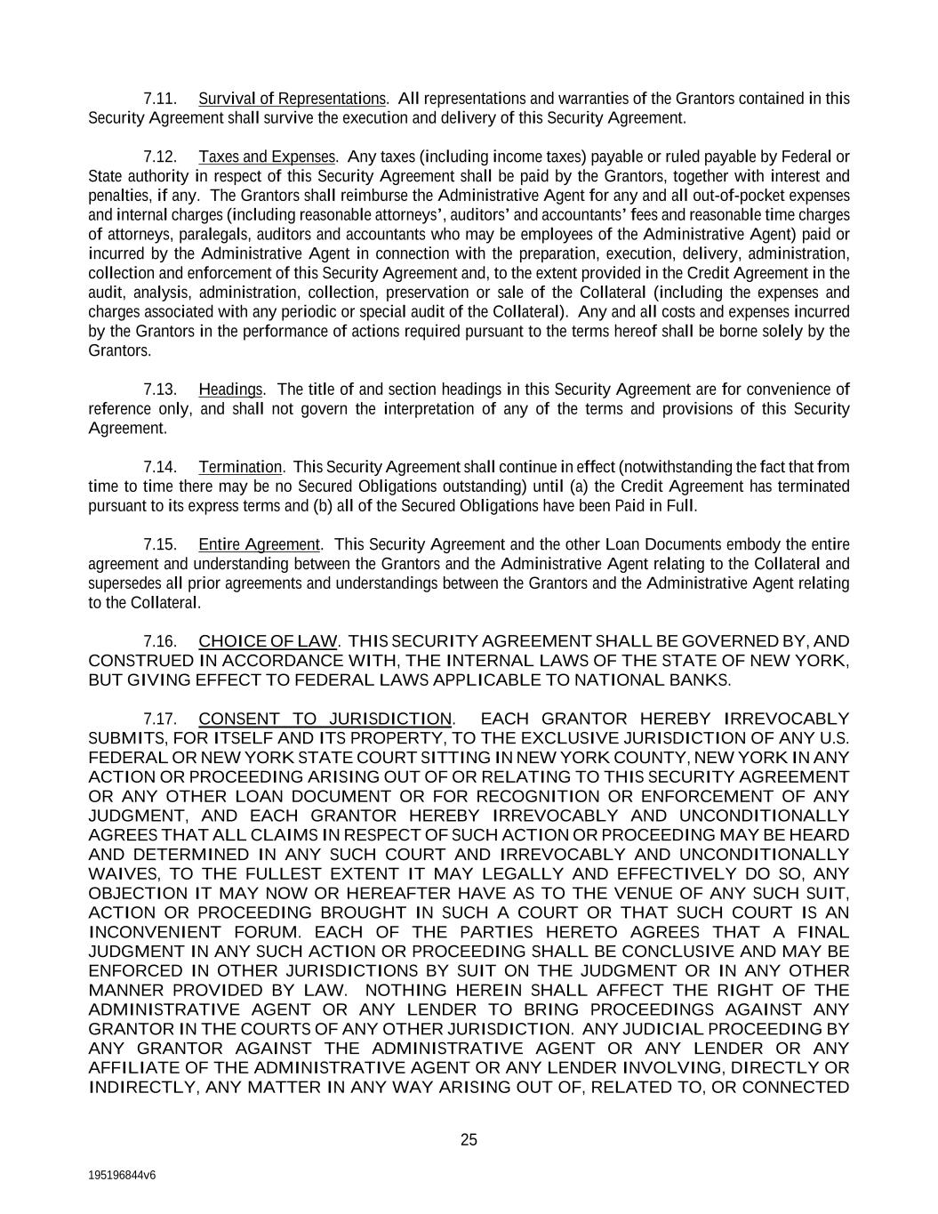 195196844v6 25 7.11. Survival of Representations. All representations and warranties of the Grantors contained in this Security Agreement shall survive the execution and delivery of this Security Agreement. 7.12. Taxes and Expenses. Any taxes (including income taxes) payable or ruled payable by Federal or State authority in respect of this Security Agreement shall be paid by the Grantors, together with interest and penalties, if any. The Grantors shall reimburse the Administrative Agent for any and all out-of-pocket expenses and internal charges (including reasonable attorneys’, auditors’ and accountants’ fees and reasonable time charges of attorneys, paralegals, auditors and accountants who may be employees of the Administrative Agent) paid or incurred by the Administrative Agent in connection with the preparation, execution, delivery, administration, collection and enforcement of this Security Agreement and, to the extent provided in the Credit Agreement in the audit, analysis, administration, collection, preservation or sale of the Collateral (including the expenses and charges associated with any periodic or special audit of the Collateral). Any and all costs and expenses incurred by the Grantors in the performance of actions required pursuant to the terms hereof shall be borne solely by the Grantors. 7.13. Headings. The title of and section headings in this Security Agreement are for convenience of reference only, and shall not govern the interpretation of any of the terms and provisions of this Security Agreement. 7.14. Termination. This Security Agreement shall continue in effect (notwithstanding the fact that from time to time there may be no Secured Obligations outstanding) until (a) the Credit Agreement has terminated pursuant to its express terms and (b) all of the Secured Obligations have been Paid in Full. 7.15. Entire Agreement. This Security Agreement and the other Loan Documents embody the entire agreement and understanding between the Grantors and the Administrative Agent relating to the Collateral and supersedes all prior agreements and understandings between the Grantors and the Administrative Agent relating to the Collateral. 7.16. CHOICE OF LAW. THIS SECURITY AGREEMENT SHALL BE GOVERNED BY, AND CONSTRUED IN ACCORDANCE WITH, THE INTERNAL LAWS OF THE STATE OF NEW YORK, BUT GIVING EFFECT TO FEDERAL LAWS APPLICABLE TO NATIONAL BANKS. 7.17. CONSENT TO JURISDICTION. EACH GRANTOR HEREBY IRREVOCABLY SUBMITS, FOR ITSELF AND ITS PROPERTY, TO THE EXCLUSIVE JURISDICTION OF ANY U.S. FEDERAL OR NEW YORK STATE COURT SITTING IN NEW YORK COUNTY, NEW YORK IN ANY ACTION OR PROCEEDING ARISING OUT OF OR RELATING TO THIS SECURITY AGREEMENT OR ANY OTHER LOAN DOCUMENT OR FOR RECOGNITION OR ENFORCEMENT OF ANY JUDGMENT, AND EACH GRANTOR HEREBY IRREVOCABLY AND UNCONDITIONALLY AGREES THAT ALL CLAIMS IN RESPECT OF SUCH ACTION OR PROCEEDING MAY BE HEARD AND DETERMINED IN ANY SUCH COURT AND IRREVOCABLY AND UNCONDITIONALLY WAIVES, TO THE FULLEST EXTENT IT MAY LEGALLY AND EFFECTIVELY DO SO, ANY OBJECTION IT MAY NOW OR HEREAFTER HAVE AS TO THE VENUE OF ANY SUCH SUIT, ACTION OR PROCEEDING BROUGHT IN SUCH A COURT OR THAT SUCH COURT IS AN INCONVENIENT FORUM. EACH OF THE PARTIES HERETO AGREES THAT A FINAL JUDGMENT IN ANY SUCH ACTION OR PROCEEDING SHALL BE CONCLUSIVE AND MAY BE ENFORCED IN OTHER JURISDICTIONS BY SUIT ON THE JUDGMENT OR IN ANY OTHER MANNER PROVIDED BY LAW. NOTHING HEREIN SHALL AFFECT THE RIGHT OF THE ADMINISTRATIVE AGENT OR ANY LENDER TO BRING PROCEEDINGS AGAINST ANY GRANTOR IN THE COURTS OF ANY OTHER JURISDICTION. ANY JUDICIAL PROCEEDING BY ANY GRANTOR AGAINST THE ADMINISTRATIVE AGENT OR ANY LENDER OR ANY AFFILIATE OF THE ADMINISTRATIVE AGENT OR ANY LENDER INVOLVING, DIRECTLY OR INDIRECTLY, ANY MATTER IN ANY WAY ARISING OUT OF, RELATED TO, OR CONNECTED