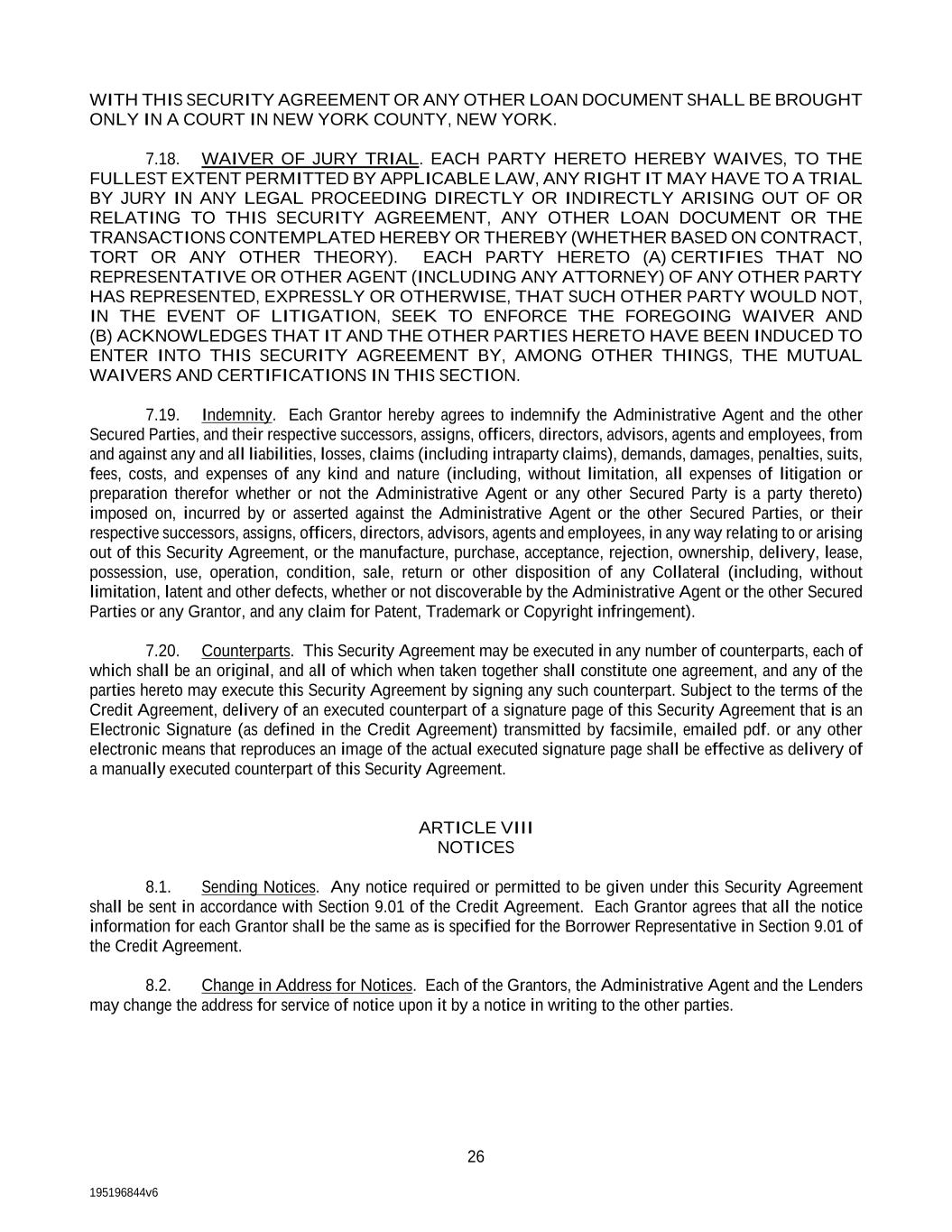 195196844v6 26 WITH THIS SECURITY AGREEMENT OR ANY OTHER LOAN DOCUMENT SHALL BE BROUGHT ONLY IN A COURT IN NEW YORK COUNTY, NEW YORK. 7.18. WAIVER OF JURY TRIAL. EACH PARTY HERETO HEREBY WAIVES, TO THE FULLEST EXTENT PERMITTED BY APPLICABLE LAW, ANY RIGHT IT MAY HAVE TO A TRIAL BY JURY IN ANY LEGAL PROCEEDING DIRECTLY OR INDIRECTLY ARISING OUT OF OR RELATING TO THIS SECURITY AGREEMENT, ANY OTHER LOAN DOCUMENT OR THE TRANSACTIONS CONTEMPLATED HEREBY OR THEREBY (WHETHER BASED ON CONTRACT, TORT OR ANY OTHER THEORY). EACH PARTY HERETO (A) CERTIFIES THAT NO REPRESENTATIVE OR OTHER AGENT (INCLUDING ANY ATTORNEY) OF ANY OTHER PARTY HAS REPRESENTED, EXPRESSLY OR OTHERWISE, THAT SUCH OTHER PARTY WOULD NOT, IN THE EVENT OF LITIGATION, SEEK TO ENFORCE THE FOREGOING WAIVER AND (B) ACKNOWLEDGES THAT IT AND THE OTHER PARTIES HERETO HAVE BEEN INDUCED TO ENTER INTO THIS SECURITY AGREEMENT BY, AMONG OTHER THINGS, THE MUTUAL WAIVERS AND CERTIFICATIONS IN THIS SECTION. 7.19. Indemnity. Each Grantor hereby agrees to indemnify the Administrative Agent and the other Secured Parties, and their respective successors, assigns, officers, directors, advisors, agents and employees, from and against any and all liabilities, losses, claims (including intraparty claims), demands, damages, penalties, suits, fees, costs, and expenses of any kind and nature (including, without limitation, all expenses of litigation or preparation therefor whether or not the Administrative Agent or any other Secured Party is a party thereto) imposed on, incurred by or asserted against the Administrative Agent or the other Secured Parties, or their respective successors, assigns, officers, directors, advisors, agents and employees, in any way relating to or arising out of this Security Agreement, or the manufacture, purchase, acceptance, rejection, ownership, delivery, lease, possession, use, operation, condition, sale, return or other disposition of any Collateral (including, without limitation, latent and other defects, whether or not discoverable by the Administrative Agent or the other Secured Parties or any Grantor, and any claim for Patent, Trademark or Copyright infringement). 7.20. Counterparts. This Security Agreement may be executed in any number of counterparts, each of which shall be an original, and all of which when taken together shall constitute one agreement, and any of the parties hereto may execute this Security Agreement by signing any such counterpart. Subject to the terms of the Credit Agreement, delivery of an executed counterpart of a signature page of this Security Agreement that is an Electronic Signature (as defined in the Credit Agreement) transmitted by facsimile, emailed pdf. or any other electronic means that reproduces an image of the actual executed signature page shall be effective as delivery of a manually executed counterpart of this Security Agreement. ARTICLE VIII NOTICES 8.1. Sending Notices. Any notice required or permitted to be given under this Security Agreement shall be sent in accordance with Section 9.01 of the Credit Agreement. Each Grantor agrees that all the notice information for each Grantor shall be the same as is specified for the Borrower Representative in Section 9.01 of the Credit Agreement. 8.2. Change in Address for Notices. Each of the Grantors, the Administrative Agent and the Lenders may change the address for service of notice upon it by a notice in writing to the other parties.