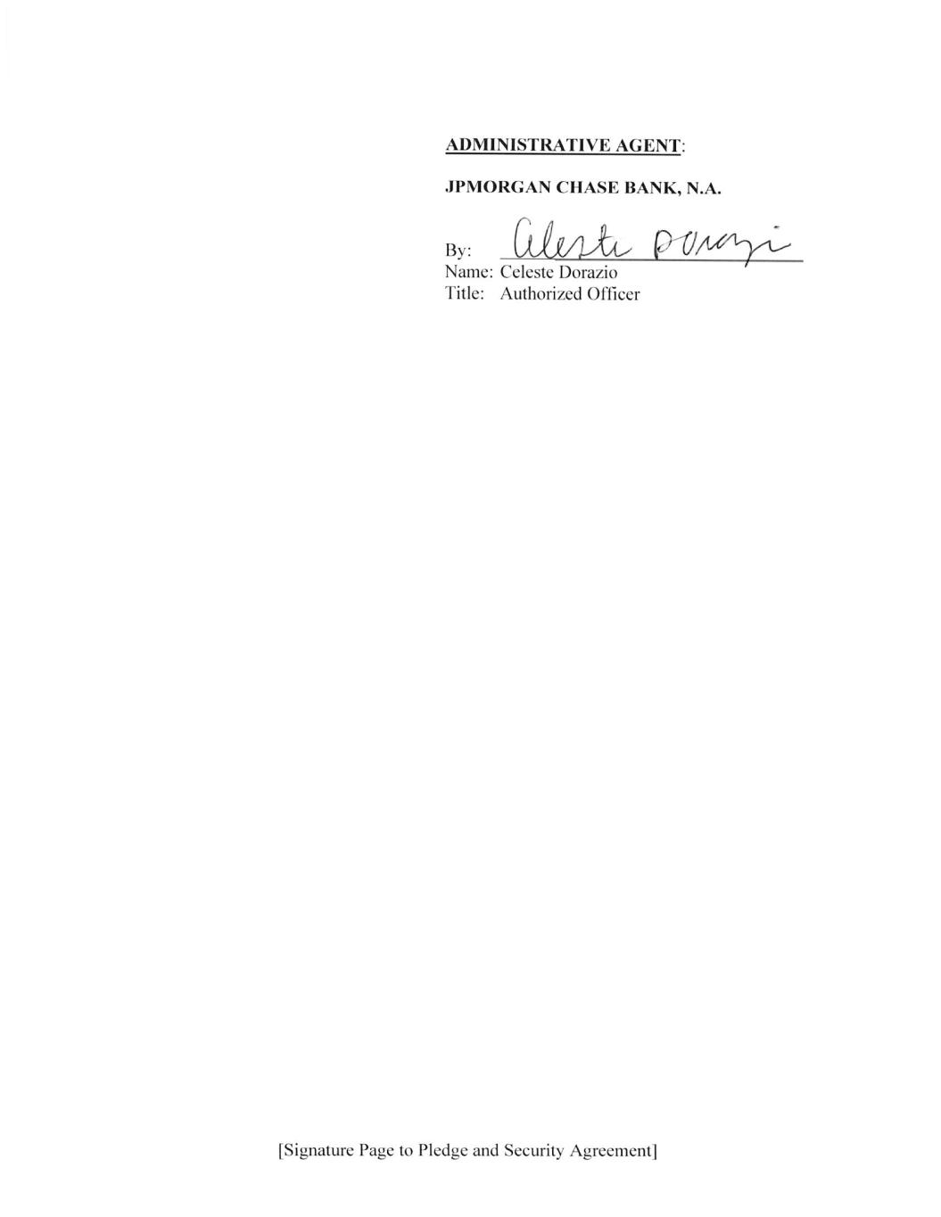 195196844v6 27 ARTICLE IX THE ADMINISTRATIVE AGENT JPMorgan Chase Bank, N.A. has been appointed the Administrative Agent for the Secured Parties hereunder pursuant to Article VIII of the Credit Agreement. It is expressly understood and agreed by the parties to this Security Agreement that any authority conferred upon the Administrative Agent hereunder is subject to the terms of the delegation of authority made by the Secured Parties to the Administrative Agent pursuant to Article VIII of the Credit Agreement, and that the Administrative Agent has agreed to act (and any successor Administrative Agent shall act) as such hereunder only on the express conditions contained in such Article VIII. Any successor Administrative Agent appointed pursuant to Article VIII of the Credit Agreement shall be entitled to all the rights, interests and benefits of the Administrative Agent hereunder. [Signature Pages Follow]