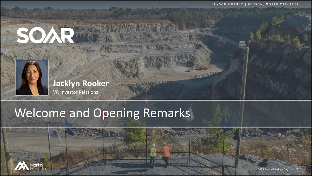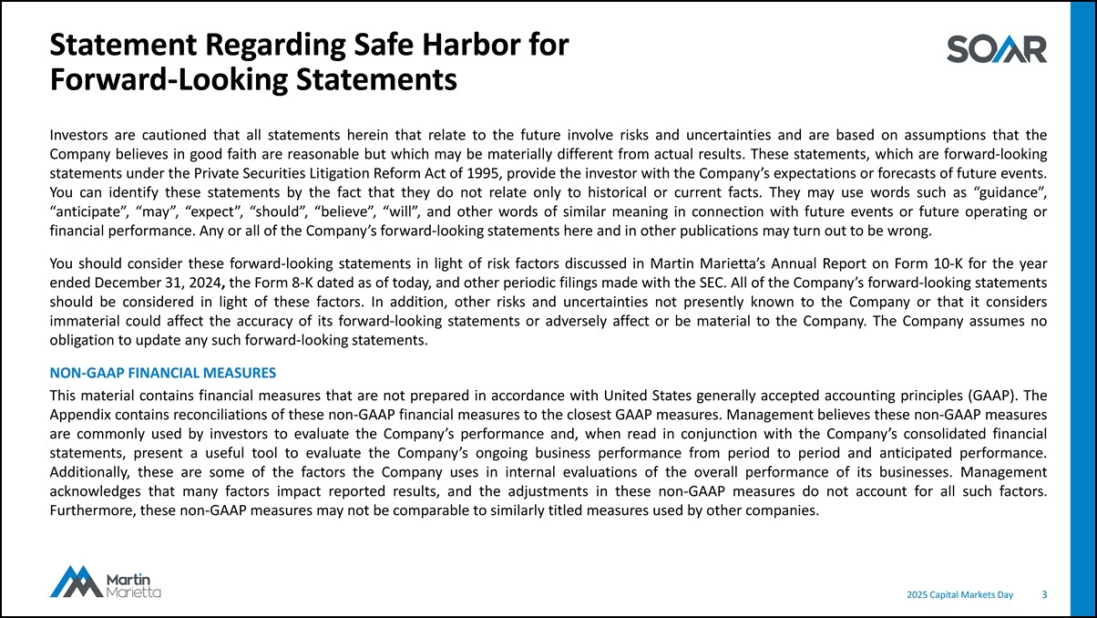 Statement Regarding Safe Harbor for Forward-Looking Statements  Investors are cautioned that all statements herein that relate to the future involve risks and uncertainties and are based on assumptions that the Company believes in good faith are reasonable but which may be materially different from actual results. These statements, which are forward-looking statements under the Private Securities Litigation Reform Act of 1995, provide the investor with the Company’s expectations or forecasts of future events. You can identify these statements by the fact that they do not relate only to historical or current facts. They may use words such as “guidance”, “anticipate”, “may”, “expect”, “should”, “believe”, “will”, and other words of similar meaning in connection with future events or future operating or financial performance. Any or all of the Company’s forward-looking statements here and in other publications may turn out to be wrong.  You should consider these forward-looking statements in light of risk factors discussed in Martin Marietta’s Annual Report on Form 10-K for the year ended December 31, 2024, the Form 8-K dated as of today, and other periodic filings made with the SEC. All of the Company’s forward-looking statements should be considered in light of these factors. In addition, other risks and uncertainties not presently known to the Company or that it considers immaterial could affect the accuracy of its forward-looking statements or adversely affect or be material to the Company. The Company assumes no obligation to update any such forward-looking statements.  NON-GAAP FINANCIAL MEASURES  This material contains financial measures that are not prepared in accordance with United States generally accepted accounting principles (GAAP). The Appendix contains reconciliations of these non-GAAP financial measures to the closest GAAP measures. Management believes these non-GAAP measures are commonly used by investors to evaluate the Company’s performance and, when read in conjunction with the Company’s consolidated financial statements, present a useful tool to evaluate the Company’s ongoing business performance from period to period and anticipated performance. Additionally, these are some of the factors the Company uses in internal evaluations of the overall performance of its businesses. Management acknowledges that many factors impact reported results, and the adjustments in these non-GAAP measures do not account for all such factors. Furthermore, these non-GAAP measures may not be comparable to similarly titled measures used by other companies.  3  2025 Capital Markets Day