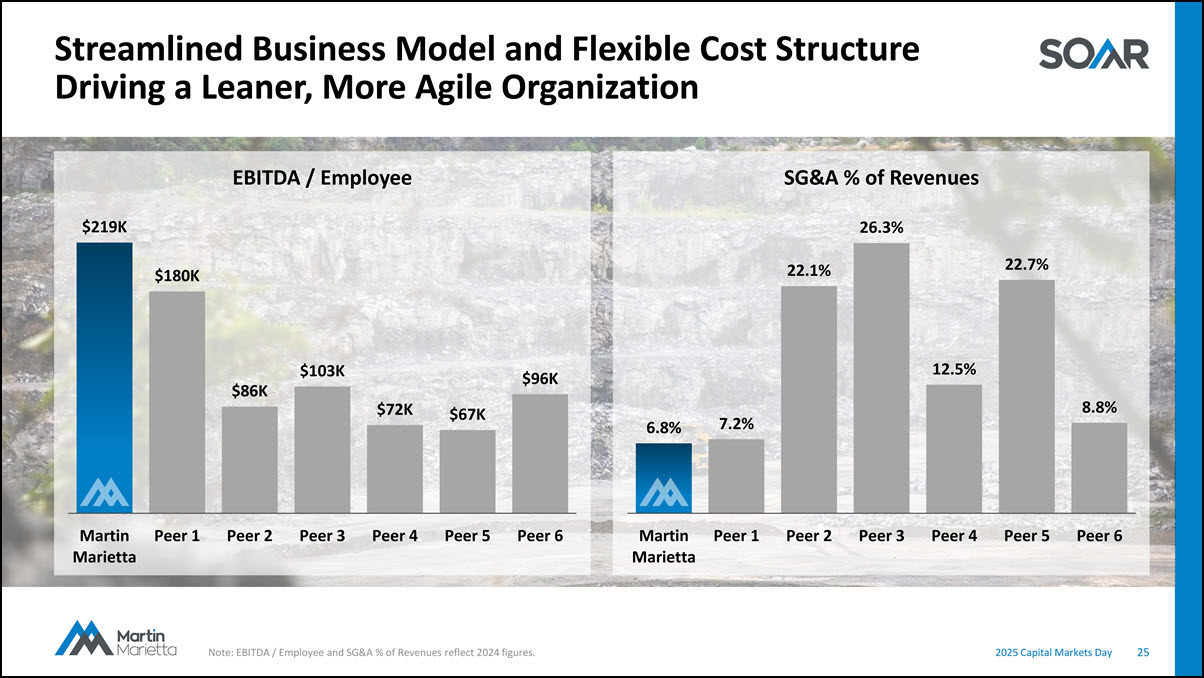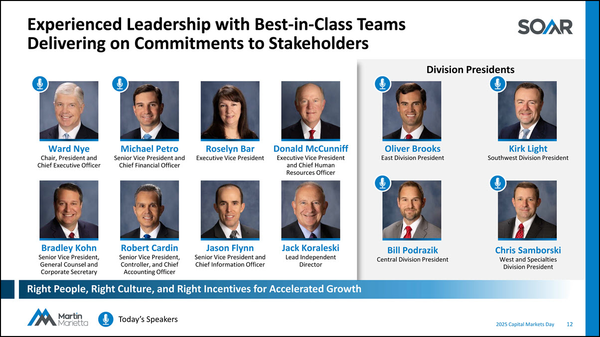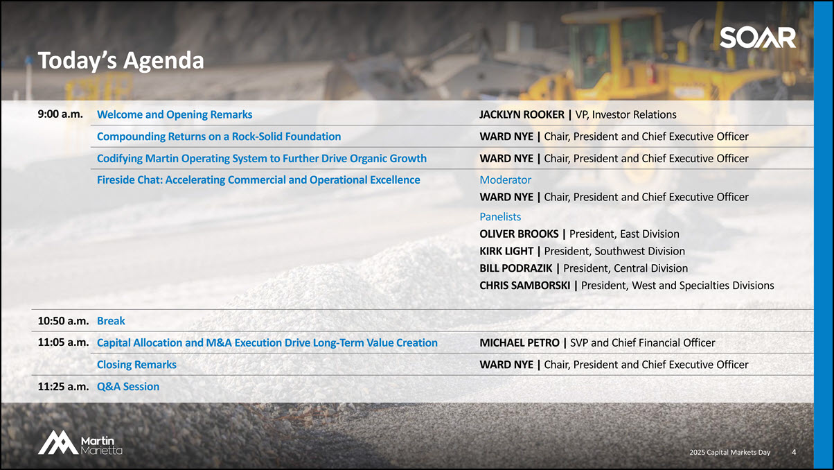 2025 Capital Markets Day  4  Today’s Agenda  9:00 a.m.  Welcome and Opening Remarks  JACKLYN ROOKER | VP, Investor Relations  Compounding Returns on a Rock-Solid Foundation  WARD NYE | Chair, President and Chief Executive Officer  Codifying Martin Operating System to Further Drive Organic Growth  WARD NYE | Chair, President and Chief Executive Officer  Fireside Chat: Accelerating Commercial and Operational Excellence   Moderator  WARD NYE | Chair, President and Chief Executive Officer  Panelists  OLIVER BROOKS | President, East Division  KIRK LIGHT | President, Southwest Division  BILL PODRAZIK | President, Central Division  CHRIS SAMBORSKI | President, West and Specialties Divisions  10:50 a.m.  Break  11:05 a.m.  Capital Allocation and M&A Execution Drive Long-Term Value Creation  MICHAEL PETRO | SVP and Chief Financial Officer  Closing Remarks  WARD NYE | Chair, President and Chief Executive Officer  11:25 a.m.  Q&A Session