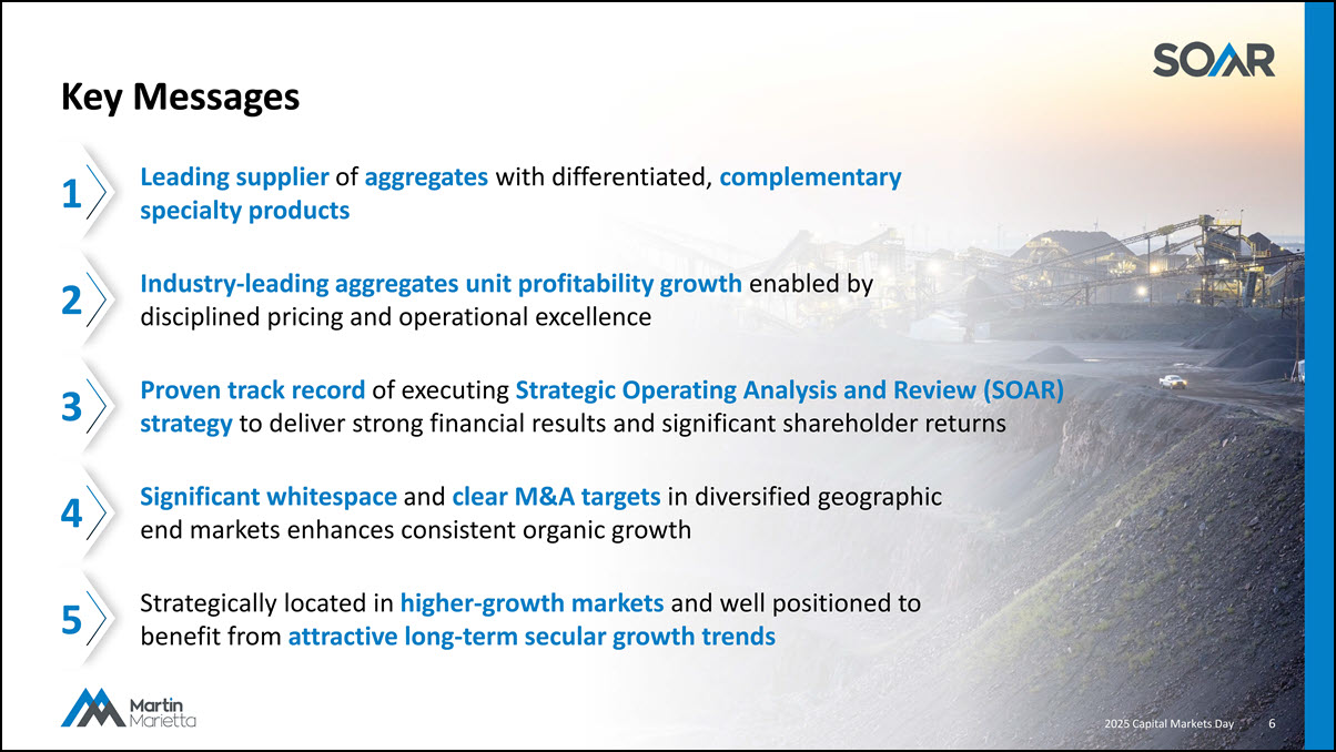 2025 Capital Markets Day  6  Key Messages  Industry-leading aggregates unit profitability growth enabled by disciplined pricing and operational excellence  2  Proven track record of executing Strategic Operating Analysis and Review (SOAR) strategy to deliver strong financial results and significant shareholder returns  3  Significant whitespace and clear M&A targets in diversified geographic end markets enhances consistent organic growth  4  Leading supplier of aggregates with differentiated, complementary specialty products  1  Strategically located in higher-growth markets and well positioned to benefit from attractive long-term secular growth trends  5