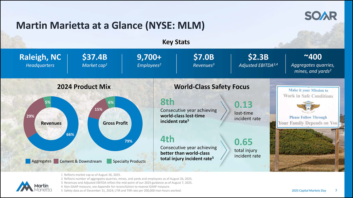 2025 Capital Markets Day  7  1 Reflects market cap as of August 26, 2025.  2 Reflects number of aggregates quarries, mines, and yards and employees as of August 26, 2025.  3 Revenues and Adjusted EBITDA reflect the mid-point of our 2025 guidance as of August 7, 2025.  4 Non-GAAP measure, see Appendix for reconciliation to nearest GAAP measure.  5 Safety data as of December 31, 2024; LTIR and TIIR rate per 200,000 man hours worked.  Martin Marietta at a Glance (NYSE: MLM)  Revenues  Gross Profit  2024 Product Mix  World-Class Safety Focus  0.13  lost-time incident rate  8th  Consecutive year achieving world-class lost-time incident rate5  Aggregates  Cement & Downstream  Specialty Products  0.65  total injury incident rate  4th  Consecutive year achieving better than world-class total injury incident rate5  Key Stats  9,700+  Employees2  $37.4B  Market cap1  $7.0B  Revenues3  $2.3B  Adjusted EBITDA3,4  ~400  Aggregates quarries, mines, and yards2  Raleigh, NC  Headquarters