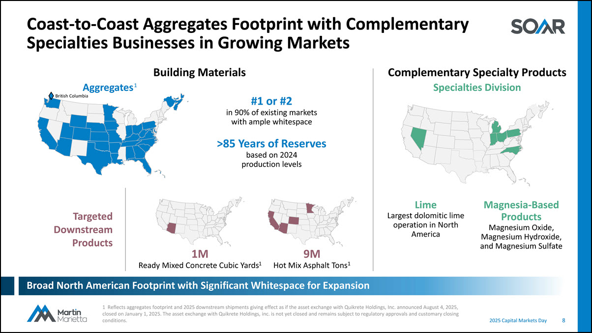 Broad North American Footprint with Significant Whitespace for Expansion  2025 Capital Markets Day  8  Coast-to-Coast Aggregates Footprint with ComplementarySpecialties Businesses in Growing Markets  Aggregates  >85 Years of Reserves  based on 2024production levels  #1 or #2  in 90% of existing markets with ample whitespace  Southwest  East  Central  $2.25B  Adjusted EBITDA  Targeted Downstream Products  West  Southwest  East  Central  West  Southwest  East  Central  1M  Ready Mixed Concrete Cubic Yards1  9M  Hot Mix Asphalt Tons1  Building Materials  Complementary Specialty Products  West  Southwest  East  Central  Specialties Division  1 Reflects shipments for FY2024.  LimeLargest dolomitic lime operation in North America  Magnesia-Based ProductsMagnesium Oxide, Magnesium Hydroxide, and Magnesium Sulfate  British Columbia  1 Reflects aggregates footprint and 2025 downstream shipments giving effect as if the asset exchange with Quikrete Holdings, Inc. announced August 4, 2025, closed on January 1, 2025. The asset exchange with Quikrete Holdings, inc. is not yet closed and remains subject to regulatory approvals and customary closing conditions.  1