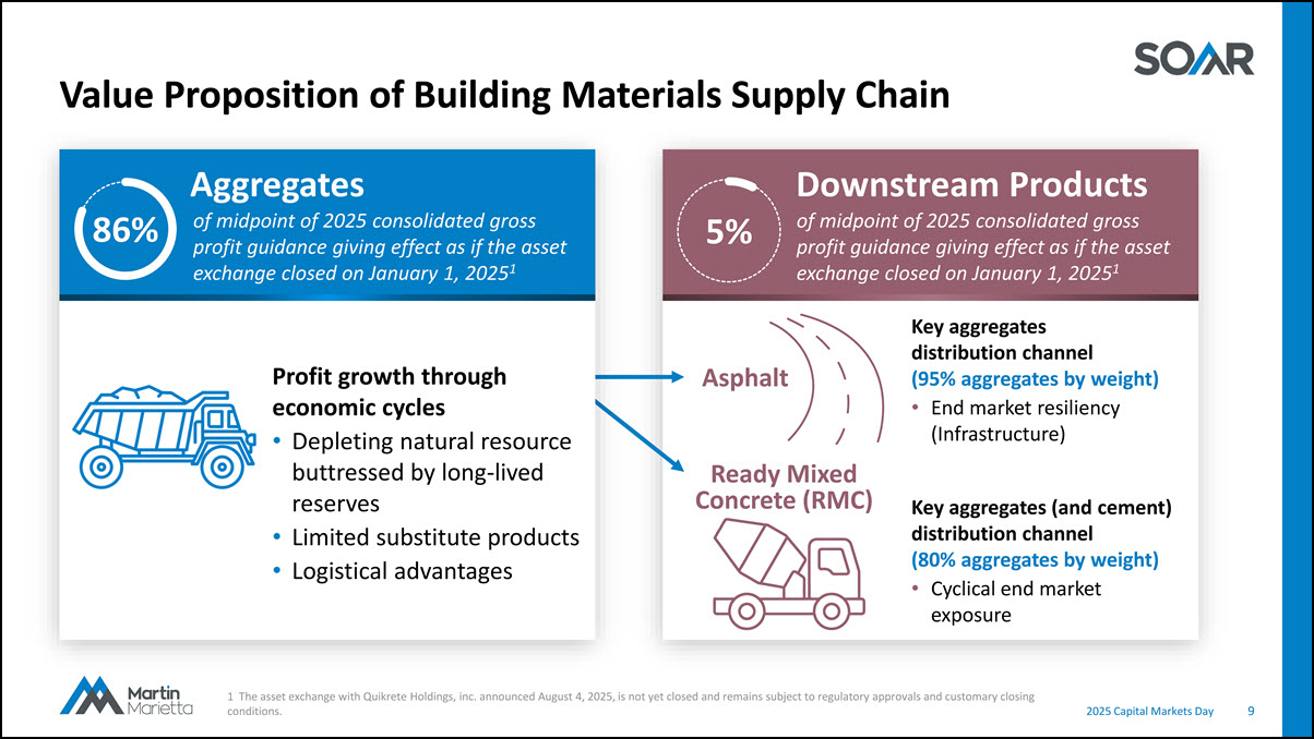 Value Proposition of Building Materials Supply Chain   9  2025 Capital Markets Day  9  1 The asset exchange with Quikrete Holdings, inc. announced August 4, 2025, is not yet closed and remains subject to regulatory approvals and customary closing conditions.  Downstream Products  5%  Asphalt  Ready Mixed Concrete (RMC)  Key aggregates (and cement) distribution channel (80% aggregates by weight)  Cyclical end market exposure  Key aggregates distribution channel (95% aggregates by weight)  End market resiliency(Infrastructure)   of midpoint of 2025 consolidated gross profit guidance giving effect as if the asset exchange closed on January 1, 20251  86%  Aggregates  Profit growth through economic cycles  Depleting natural resource buttressed by long-lived reserves  Limited substitute products  Logistical advantages  of midpoint of 2025 consolidated gross profit guidance giving effect as if the asset exchange closed on January 1, 20251