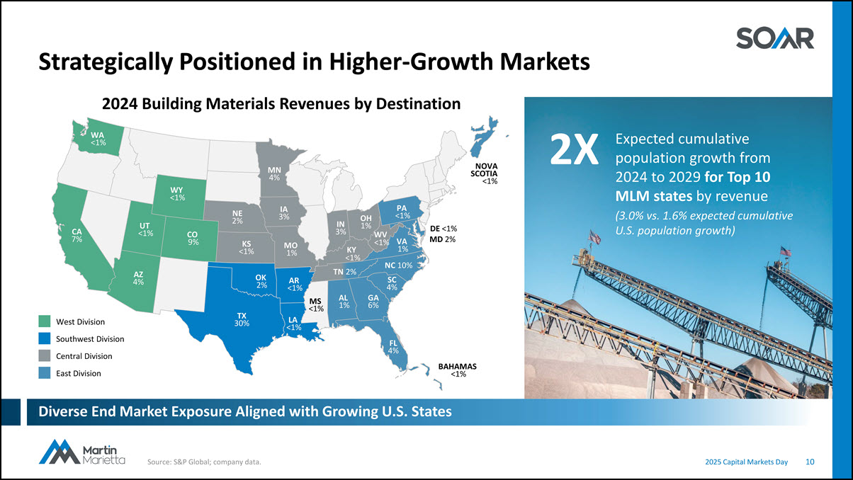 2025 Capital Markets Day  10  Source: S&P Global; company data.  Strategically Positioned in Higher-Growth Markets  Diverse End Market Exposure Aligned with Growing U.S. States  West  Southwest  East  Central  TX  30%  CA  7%  NC 10%  CO   9%  GA  6%  MN  4%  AZ  4%  FL  4%  IA  3%  IN  3%  SC  4%  OH  1%  NE  2%  MD 2%  AL   1%  MO   1%  OK   2%  VA   1%  AR   <1%  PA   <1%  LA   <1%  MI  0.3%  KS  <1%  KY   <1%  ut   <1%  Wa   <1%  TN 2%  MS   <1%     Wy   <1%  DE <1%  2024 Building Materials Revenues by Destination  NOVA Scotia   <1%   BAHAMAS   <1%  West Division  Southwest Division  Central Division  East Division  Expected cumulative population growth from 2024 to 2029 for Top 10 MLM states by revenue   (3.0% vs. 1.6% expected cumulative U.S. population growth)  2X  WV   <1%